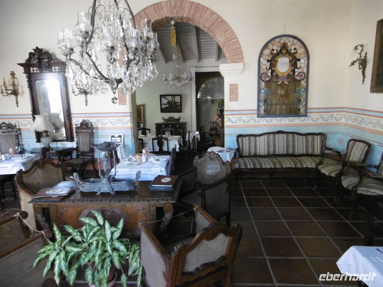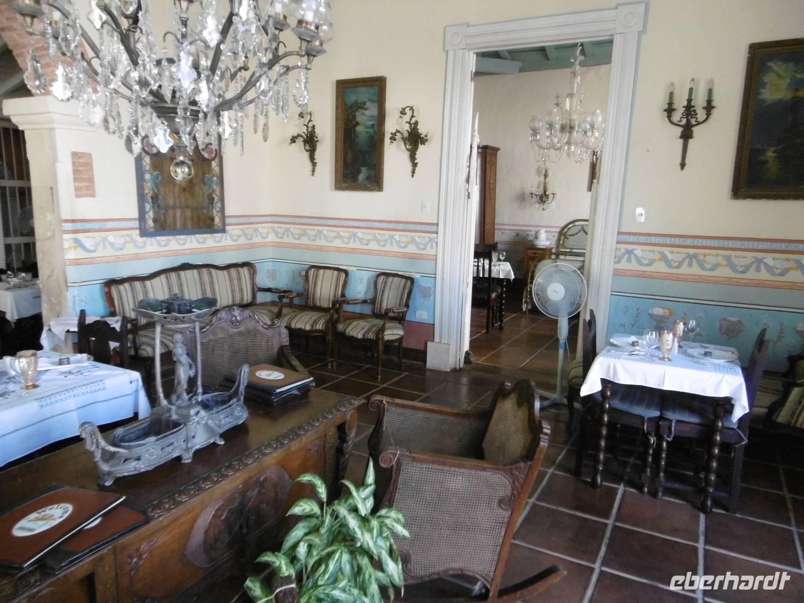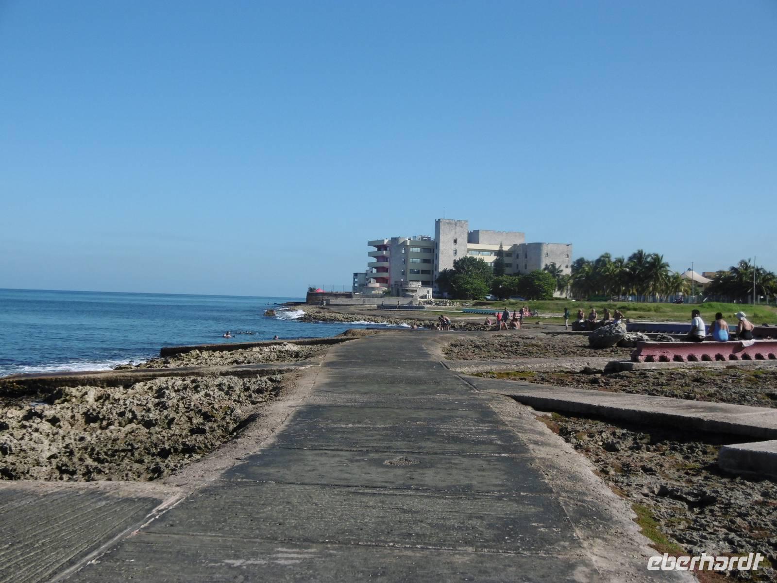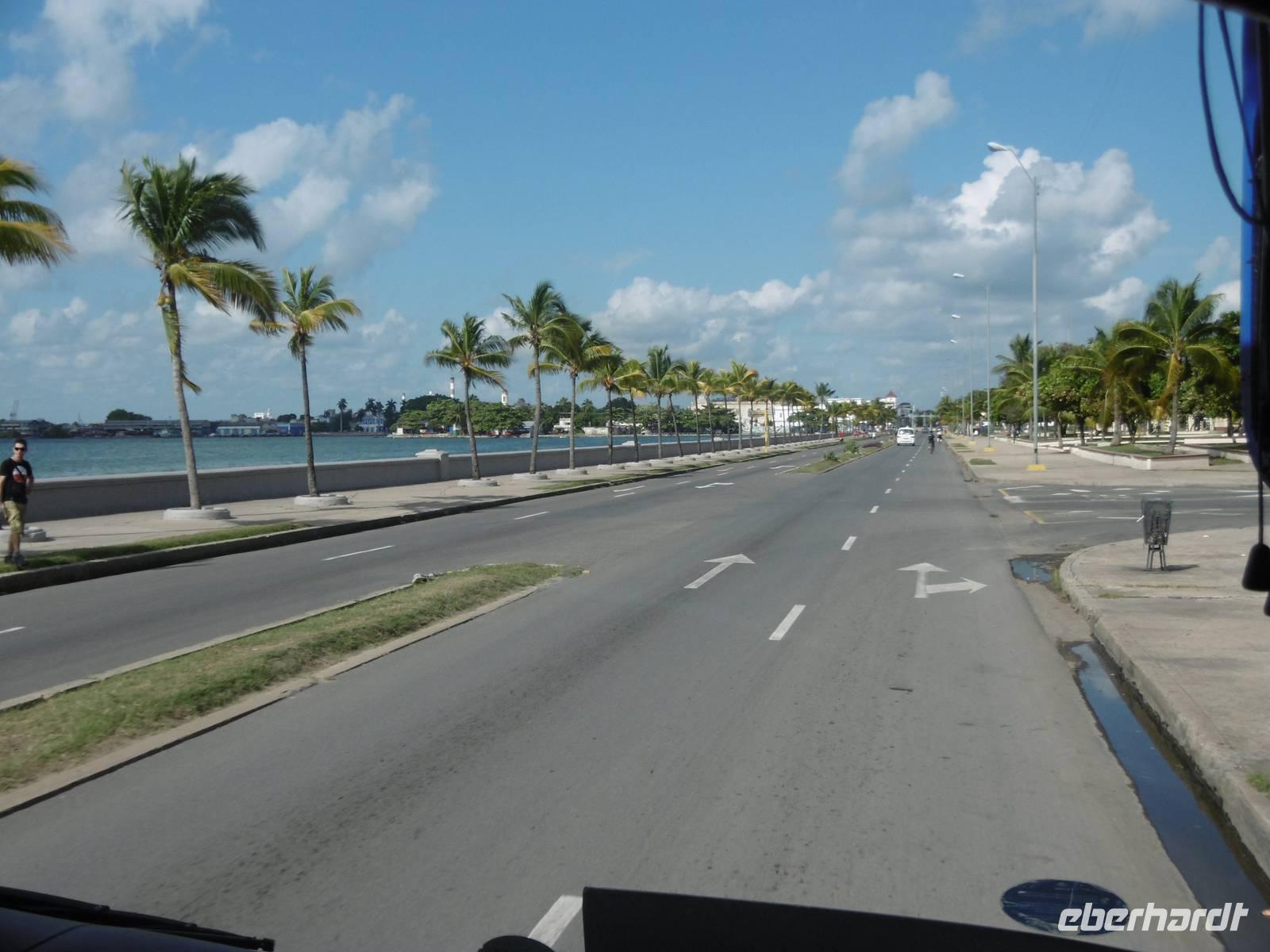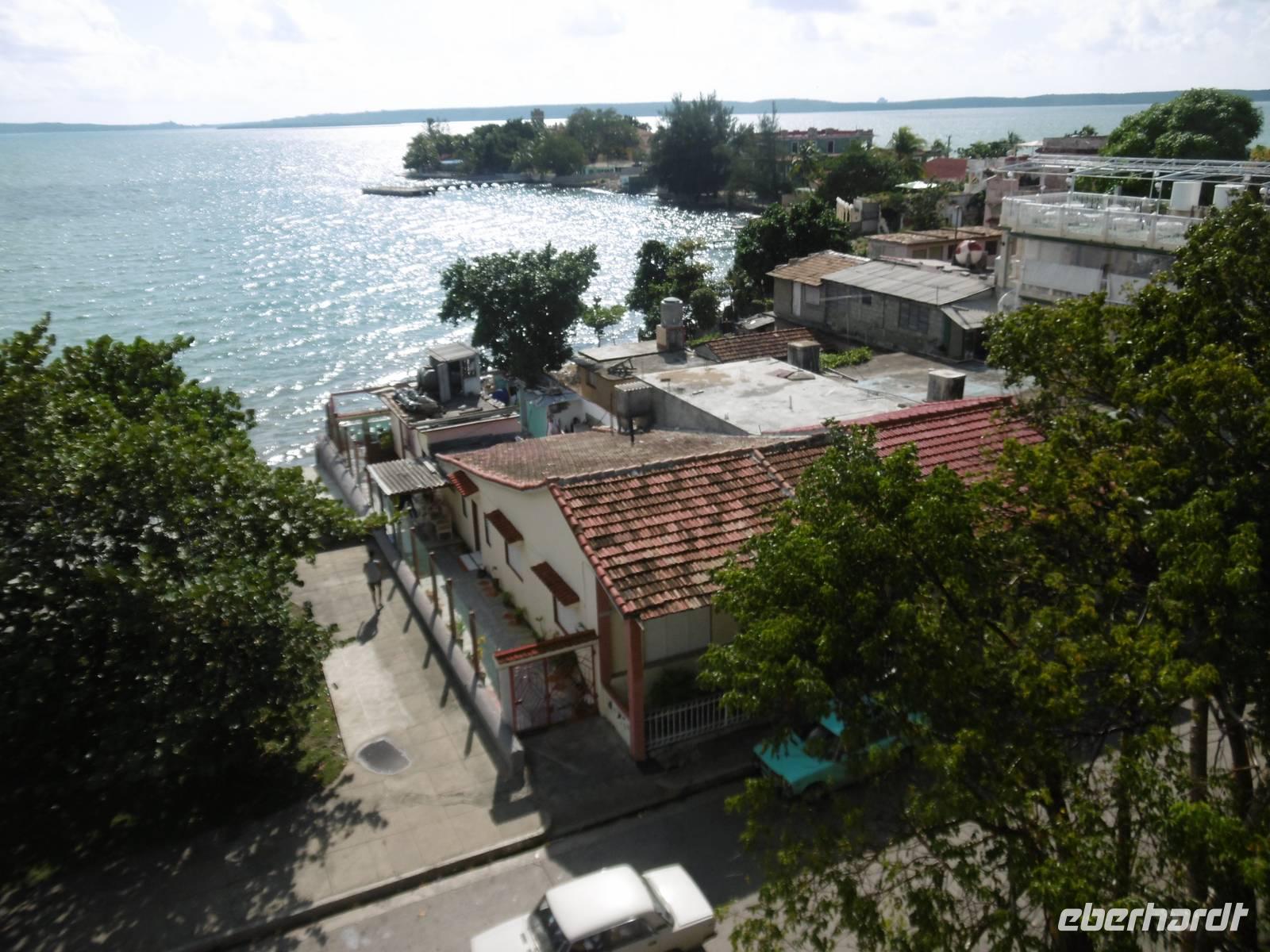 Und wieder haben wir Glück mit dem Wetter - die Sonne strahlt und wir frühstücken heute auf der Terrasse des Hotels Faro Luna mit Blick aufs Meer. Dann brechen wir auf in Richtung Stadt Cienfuegos. Auf halber Höhe befindet sich der Botanische Garten. Diesen hat ein Amerikaner entworfen und Gewächse aus aller Welt gesammelt und gezüchtet. 97 Hektar umfasst der Garten, doch wir schauen uns nur einen kleinen Teil der Anlage an. Da wir kurz vor neun Uhr da sind, sind wir die einzigen Touristen und können die morgendliche Stimmung im Garten in Ruhe aufnehmen. Eine Botanikerin erklärt uns die ulkigsten Gewächse und Marcos übersetzt. So sehen wir zum Beispiel einen Kanonenkugelbaum, Mahagonibaum, Leberwurstbaum, Paranussbaum, Bambus, verschiedene Palmenarten, wunderschöne Fikusbäume und eine vielfältige Blütenpracht. Nach dem Spaziergang geht es weiter in Richtung Cienfuegos - wieder mit einem Quiz und kleinen Santiago Rum Chupitos als Belohnung für die richtigen Antworten. In Cienfuegos besuchen wir zunächst das Teatro Terry - ein wichtiger Schauplatz Kubas Tanz- und Gesangstalente. Hier findet gerade eine Probe für die abendliche Vorstellung statt. Dann erklärt uns Marcos den Hauptplatz. Wir haben Zeit selbst durch die Straßen zu schlendern. Auf dem Boulevard bieten sich typische Szenen. So entdecken wir zum Beispiel einen rustikalen Friseursalon, eine Zahnarztpraxis, riesige Schlangen vor den Lebensmittelläden (heute gibt es Eier) und in den Haushaltwarenläden. Am Samstag ist Cienfuegos voller kauflustiger Kubaner. Das Mittagessen nehmen wir heute in einem unscheinbaren Paladar am Prado mit ausgezeichnetem Essen und herzlichen Service ein. Am Malecon entlang geht es zurück in Richtung Hotel und Überraschung: wir halten am schönsten Gebäude Cienfuegos - dem Palacio del Valle. Marrokanische Baukunst trifft hier auf französiches Flair. Oben auf der Dachterrasse bietet sich ein traumhafter Ausblick über die Bahia de Cienfuegos und wir stoßen mit einem Cocktail an. Anschließend geht es zurück zum Hotel, wo wir bei viel Sonne den Rest des Tages am Strand ausklingen lassen.