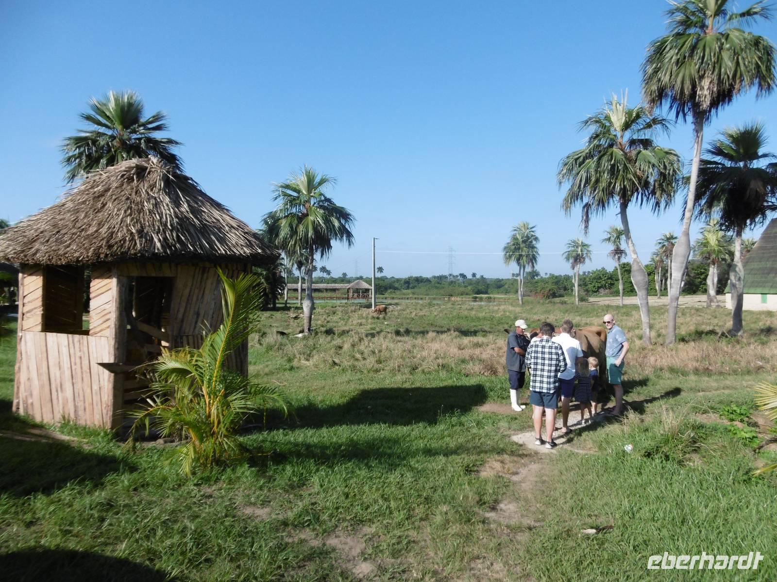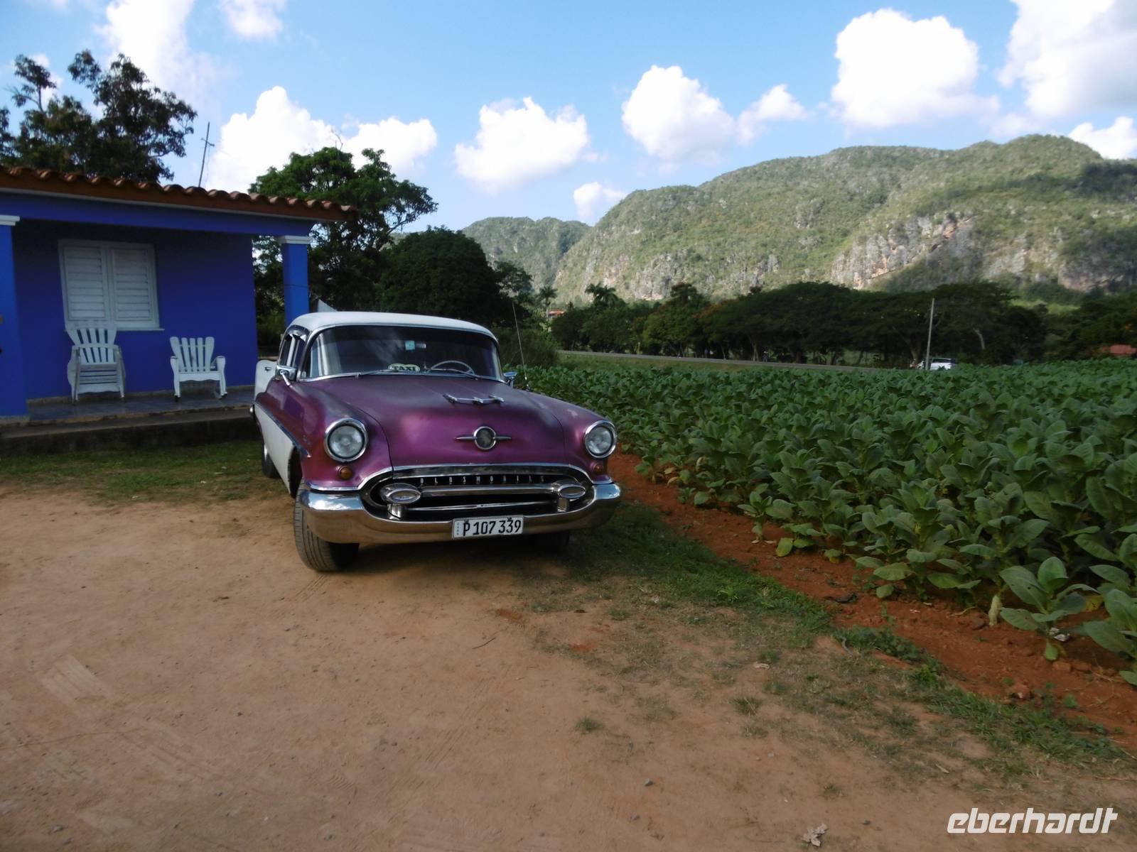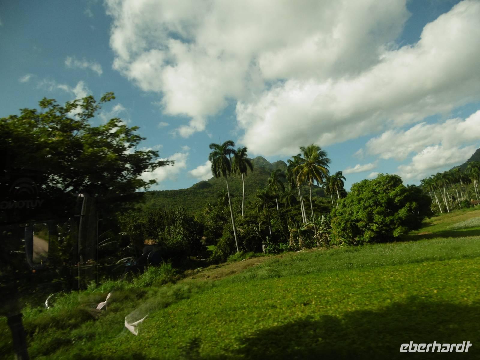 Heute starten wir recht zeitig, denn uns steht ein erlebnisreicher und unvergesslicher Tag vor. Bis ins Vinales Tal sind es ca. drei Stunden Fahrt im Bus von Havanna aus. Doch bei Marcos Erzählungen und vielfältigen Erklärungen wir es nicht langweilig. Wir sehen das tolle Villenvietel El Lagito, das Leichtathletikstation und den Zirkus mit den ehemaligen Casinos. Hier wohnen einige der reichsten Menschen Kubas. Dann beginnt schon die Autobahn - in Kuba ein wahres Erlebnis! Maximal 100 km/h darf man hier fahren. Die Autobahn wir von Fußgängern, Radfahrern, Kutschen, Bussen und Autos gelichzeitig genutzt. Vorbei an schönen Stausees kommen wir in den Genuss von auf der Autobahn wendenden Rinderkarren, mitten auf der Straße quatschenden Kubanern, Cowboys mit Kühen usw. Über den Mais-, Ananas- und Manjokplantagen zieht sich der Himmel zu. Doch kurz vor Ankunft im Vinalestal klärt es wieder auf und der strahlende Sonnenschein verlässt uns bis zur Rückreise nicht mehr. Zunächst stoppen wir am Aussichtspunkt beim Hotel Los Jazmines, denn von hier hat man den besten Blick auf das unter uns liegende Tal mit den Karststeinfelsen (Mogotes), Tabakhäuschen und Feldern. Das möchten wir nun auch hautnah erleben! In der Finca Paraiso werden wir vom hier lebenden Tabakbauern begrüßt. Zunächst wird uns bei einem Tabakfeld der Anbau erklärt. In der danebenliegenden Tabakhütte erfahren und sehen wir mehr darüber wie es getrocknet und aufbereitet wird. Anschließend sehen wir die Phasen des Zigarrendrehens - und dürfen selbst die frisch gedrehte Zigarre probieren.Der Tabakbauer führt uns in sein Wohnhaus wo wir herzlich mit Cafe und Likör begrüßt werden. Nun geht es wieder weiter durch das traumhafte Tal. Unser nächster Stopp ist die Felsmalerei Mural der la Prehistoria, welche die Evolution des Menschen darstellt. Nach einen Fotostopp geht es zum Mittagessen ins Restaurant Rancho San Vicente. Dieses liegt direkt neben der Höhle Cueva de los Indios. Hier erwartet uns als Tagesabschluss eine Bootsfahrt durch die Höhle mit faszinierenden Stalaktiten. Am Abend begeben wir uns alles zum Hotel Melia Cohiba. Hier im Cafe Habana erleben wir eine tolle Show mit Künstlern, welche bei tänzerischer Untermalung die berühmten Werke der Buenavista Social Club Musiker wiedergeben. Kubanischer Son pur!