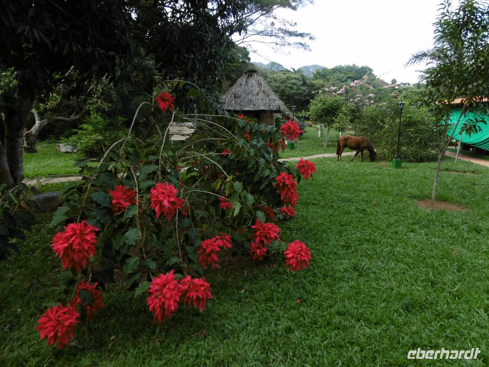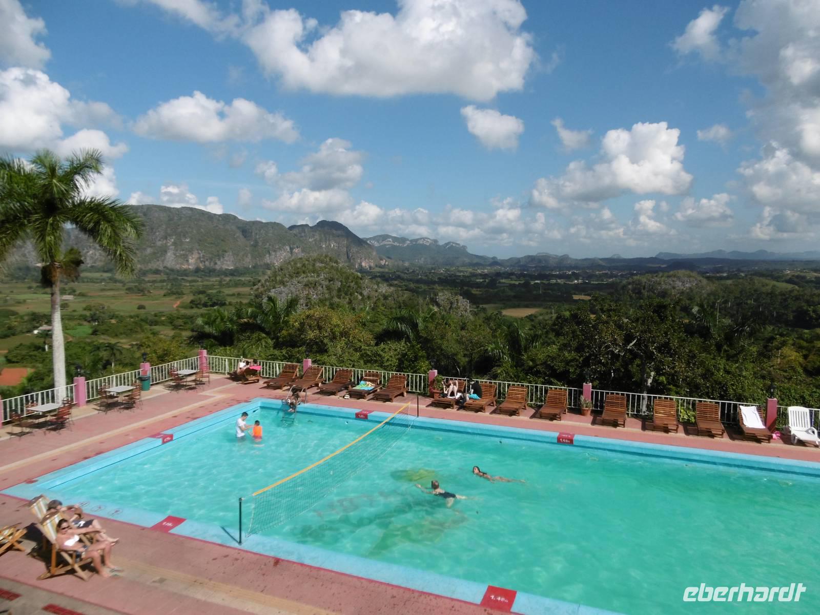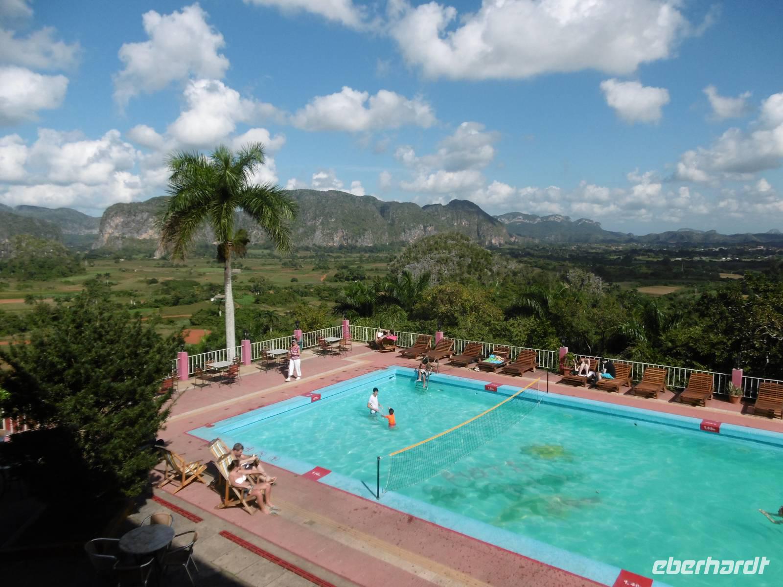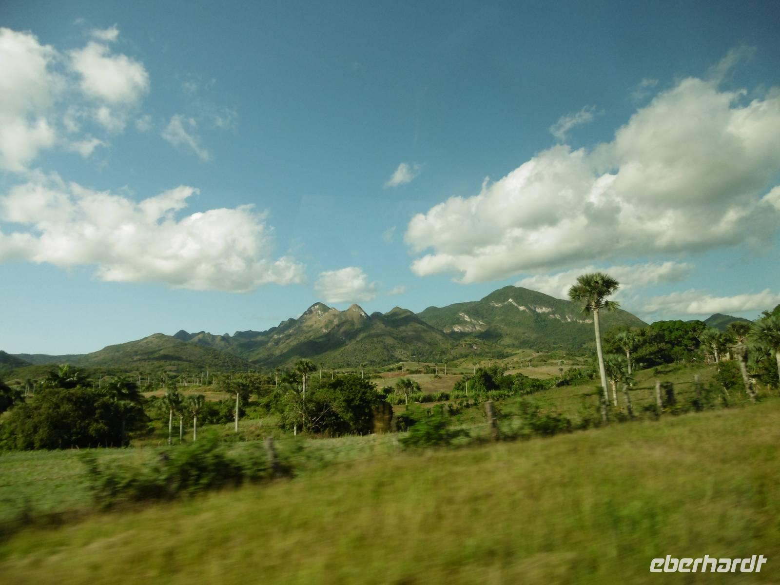 Heute starten wir recht zeitig, denn uns steht ein erlebnisreicher und unvergesslicher Tag vor. Bis ins Vinales Tal sind es ca. drei Stunden Fahrt im Bus von Havanna aus. Doch bei Marcos Erzählungen und vielfältigen Erklärungen wir es nicht langweilig. Wir sehen das tolle Villenvietel El Lagito, das Leichtathletikstation und den Zirkus mit den ehemaligen Casinos. Hier wohnen einige der reichsten Menschen Kubas. Dann beginnt schon die Autobahn - in Kuba ein wahres Erlebnis! Maximal 100 km/h darf man hier fahren. Die Autobahn wir von Fußgängern, Radfahrern, Kutschen, Bussen und Autos gelichzeitig genutzt. Vorbei an schönen Stausees kommen wir in den Genuss von auf der Autobahn wendenden Rinderkarren, mitten auf der Straße quatschenden Kubanern, Cowboys mit Kühen usw. Über den Mais-, Ananas- und Manjokplantagen zieht sich der Himmel zu. Doch kurz vor Ankunft im Vinalestal klärt es wieder auf und der strahlende Sonnenschein verlässt uns bis zur Rückreise nicht mehr. Zunächst stoppen wir am Aussichtspunkt beim Hotel Los Jazmines, denn von hier hat man den besten Blick auf das unter uns liegende Tal mit den Karststeinfelsen (Mogotes), Tabakhäuschen und Feldern. Das möchten wir nun auch hautnah erleben! In der Finca Paraiso werden wir vom hier lebenden Tabakbauern begrüßt. Zunächst wird uns bei einem Tabakfeld der Anbau erklärt. In der danebenliegenden Tabakhütte erfahren und sehen wir mehr darüber wie es getrocknet und aufbereitet wird. Anschließend sehen wir die Phasen des Zigarrendrehens - und dürfen selbst die frisch gedrehte Zigarre probieren.Der Tabakbauer führt uns in sein Wohnhaus wo wir herzlich mit Cafe und Likör begrüßt werden. Nun geht es wieder weiter durch das traumhafte Tal. Unser nächster Stopp ist die Felsmalerei Mural der la Prehistoria, welche die Evolution des Menschen darstellt. Nach einen Fotostopp geht es zum Mittagessen ins Restaurant Rancho San Vicente. Dieses liegt direkt neben der Höhle Cueva de los Indios. Hier erwartet uns als Tagesabschluss eine Bootsfahrt durch die Höhle mit faszinierenden Stalaktiten. Am Abend begeben wir uns alles zum Hotel Melia Cohiba. Hier im Cafe Habana erleben wir eine tolle Show mit Künstlern, welche bei tänzerischer Untermalung die berühmten Werke der Buenavista Social Club Musiker wiedergeben. Kubanischer Son pur!