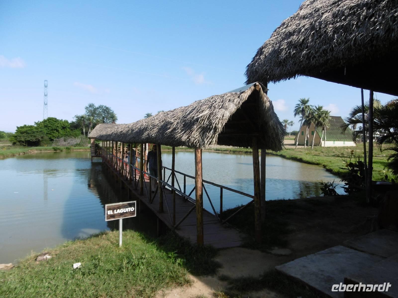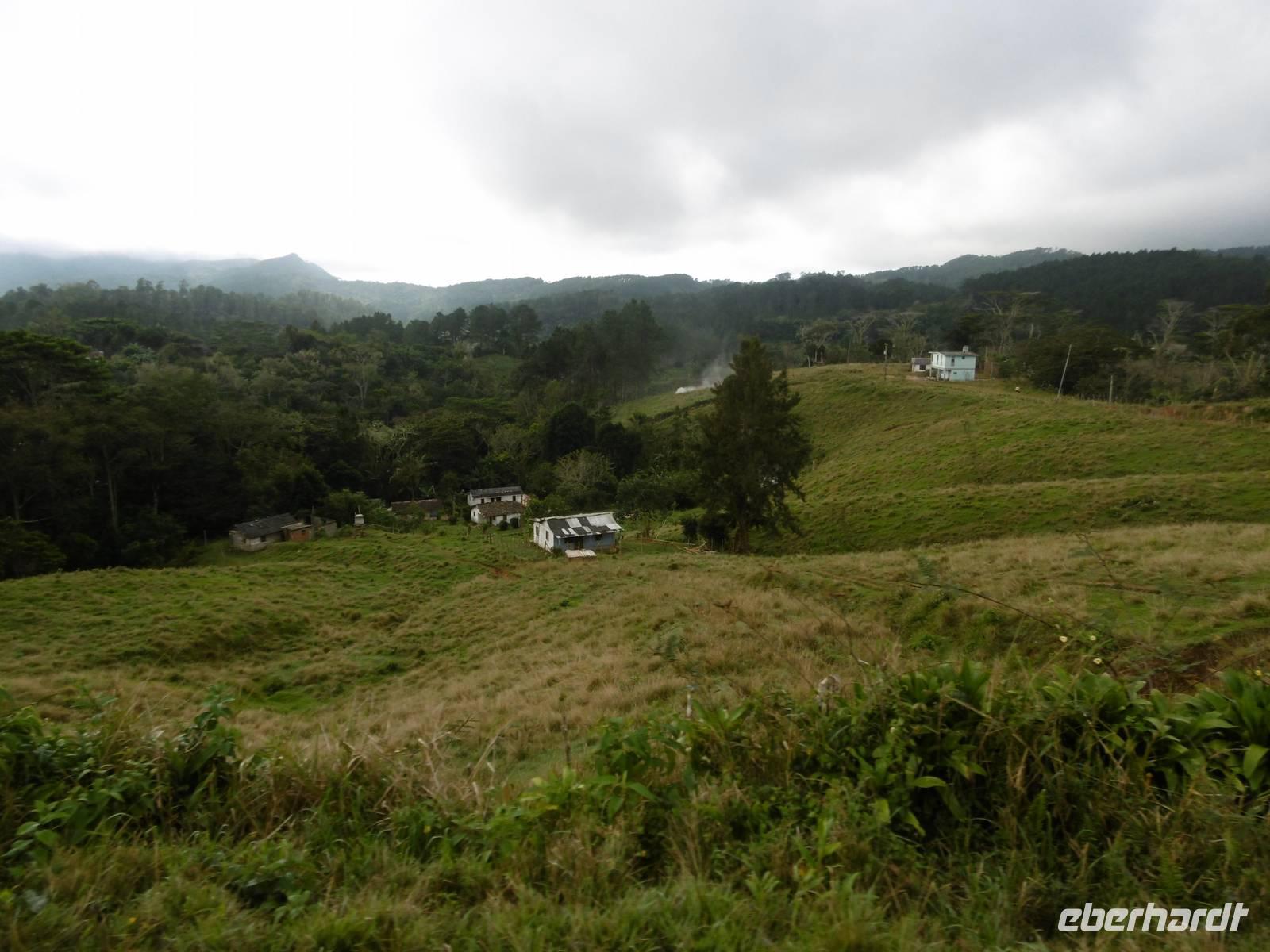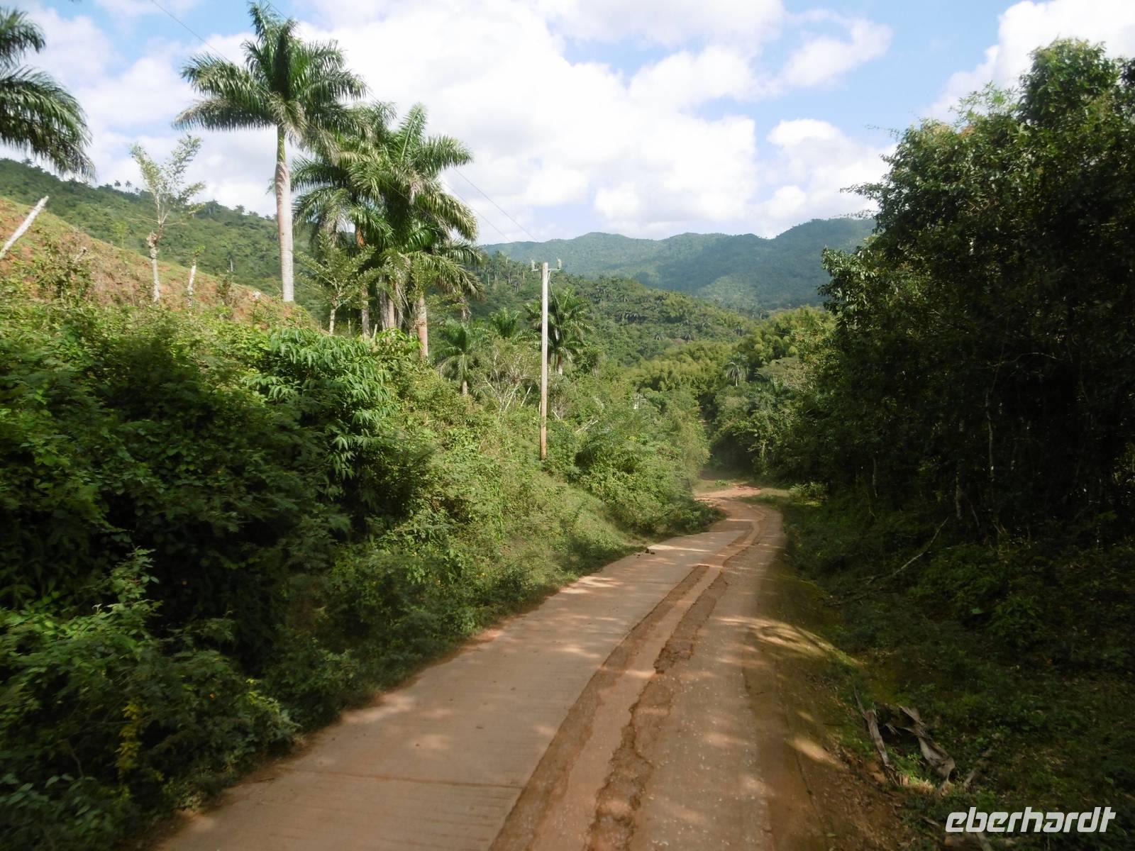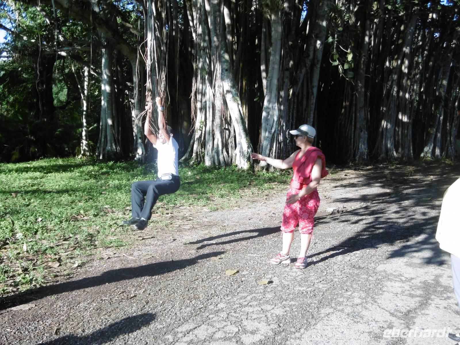 Leider müssen wir das tolle Camagüey schon verlassen, und so starten wir aus Ostkuba wieder gen Westen. Den Vormittag vertreiben wir uns mit einem Trinkquizspiel und durchqueren interessante Orte wie Florida und Ciego de Avila. Sancti Spiritus begrüßt uns mit viel Sonne. Wir spazieren durch die hübschen Straßen mit den buntgestrichenen Bauten. Hier gibt es viele interessante Läden, wie zum Beispiel einen An-und Verkauf, Lebensmittelladen und so weiter zu entdecken. Wir schauen uns die Kathedrale an und und gehen dann weiter in Richtund Puente Yayabo, der einzigen Bogenbrücke von Kuba. Im gleichnamigen Restaurant gibt es heute Shrimps. Anschließend haben wir Freizeit zum Bummeln oder Cafetrinken. Im Hotel Rijo gibt es eine tolle Aussichtsterasse. Am frühen Nachmittag fahren wir weiter und gelangen in hügeligeres Gelände der Sierra Escambray und durchqueren das Städtchen Banao mit dem tollen Friedhof. Unser Ziel ist das Anwesen des ehemaligen Zuckerrohrbarons und dessen Sklaventurms. Um diesem Turm rankt sich eine Legende zweier Brüder, die um die Gunst der gleichen Frau kämpften. Die Mutigen unter uns steigen auf den Turm und haben von Oben einen tollen Ausblick. Selbstgestickte Tischdecken, Wendepuppen und Schmuck aus Naturmaterialien kann man hier erwerben. Nachdem wir am Kolonialhaus die Zuckerrohrpresse angeschaut hatten müssen wir auch weiter, denn es beginnt langsam dunkel zu werden. Nach Trinidad beginnt die gefährliche Serpentinenstraße hoch nach Topes de Collantes - ein Kunststück für unseren Busfahrer und geschmückt mit vielen Schlaglöchern und tödlichen Kurven. Doch wir erreichen das Hotel Los Helechos noch vor Sonnenuntergang. Hier übernachten wir heute ganz urig mitten im Regenwald umgeben von vielen Urwaldlauten.