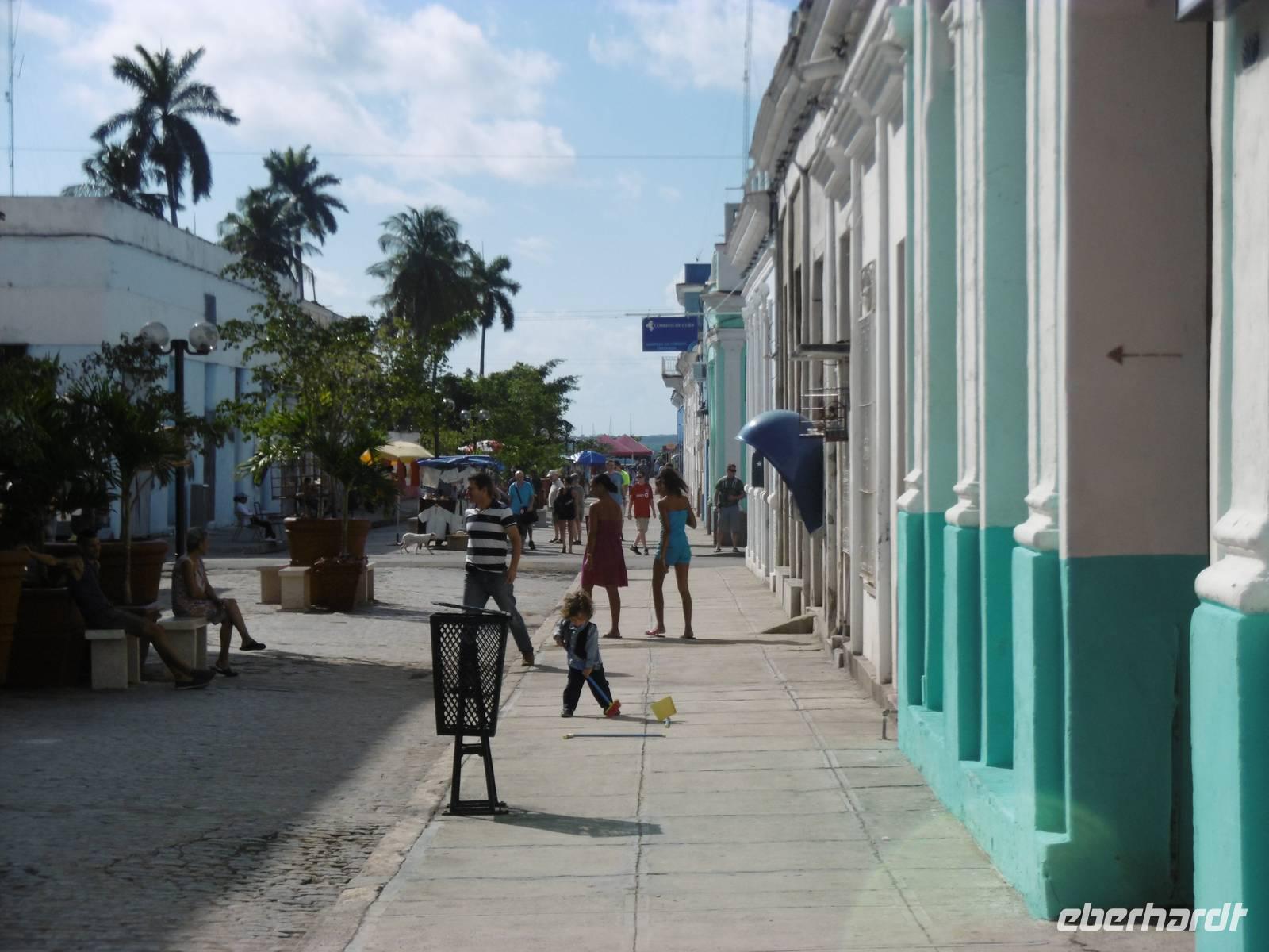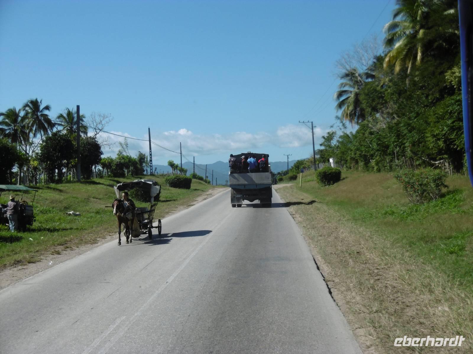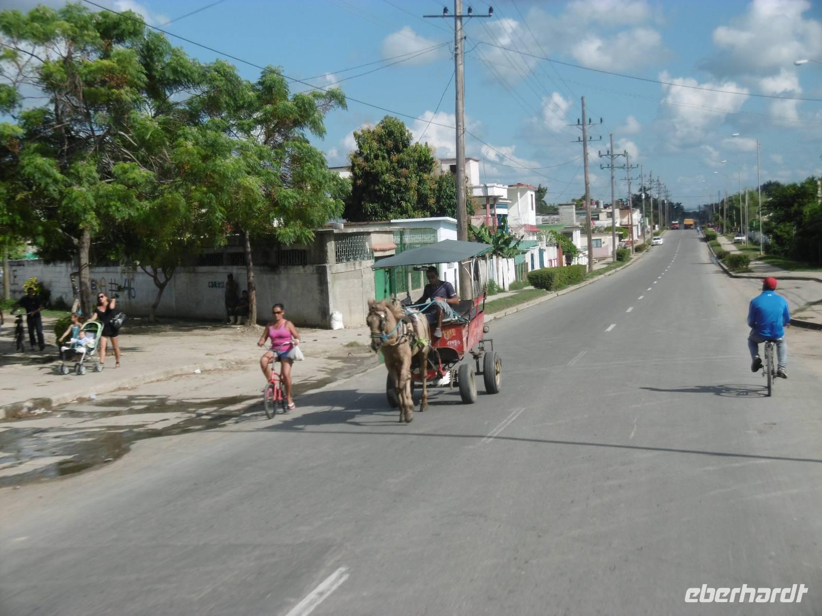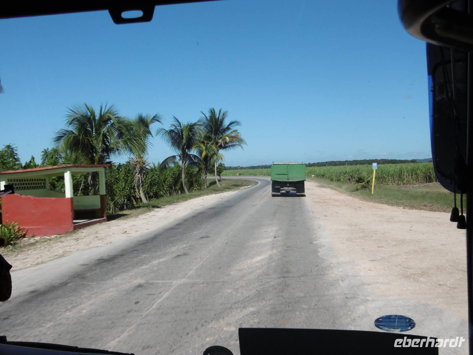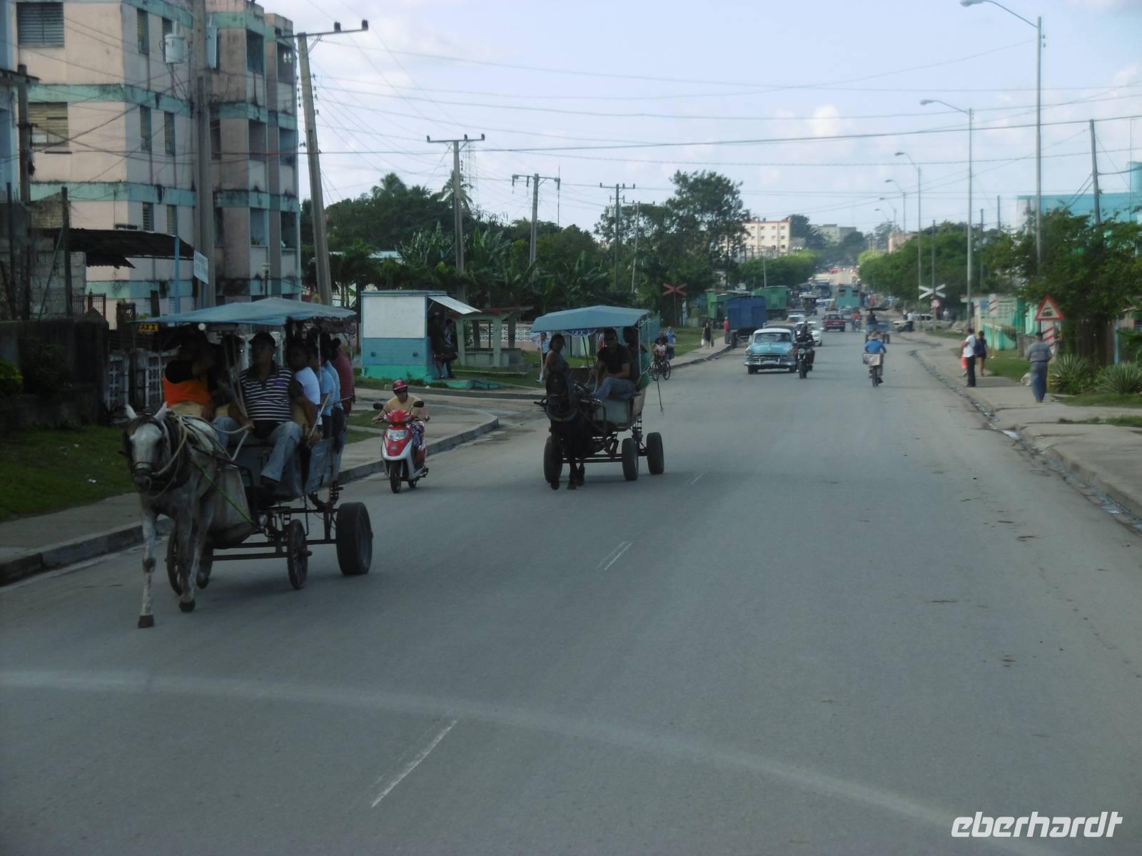 Gegen 8.30 Uhr starten wir von Cayo Santa Maria und verabschieden uns von einem Teil unserer Mitreisenden, welche im Hotel verlängern. Eine lange, aber lohnenswerte Strecke liegt vor uns - bis nach Camagüey in Ostkuba wollen wir heute gelangen! Auf diesem Weg fahren wir durch eher untouristische Landstriche und bekommen üppige Natur und tolle Straßenszenen zu Gesicht. Unser nächster Halt ist das eher unbekannte Städtchen Moron, die einzige größere Stadt auf dieser Strecke. Hier fahren wir zum Hotel Moron, von wo aus sich die Möglichkeit einer Kutschfahrt durch die Stadt bietet. Anschließend essen wir zu Mittag und setzen unsere Reise fort. Auf dem Weiterweg fahren wir vorbei an endlos weiten Zuckerrohrfeldern, Mangoplantagen, Yukafeldern und sehen auch vorbeifahrende Güter- und Personenzüge. Gegen Nachmittag erreichen wir das hübsche Städtchen Camagüey mit seinen gut erhaltenen und restaurierten Bauten aus der Kolonialstadt. Camagüey, die Stadt der Tonkrüge (Tinajones), der Labyrinthstraßen und viele Kirchen hat uns verzaubert. Da heute Dreikönigstag ist, stehen die Leute in den Spielzeuggeschäften Schlange - denn kubanische Kinder bekommen heute Ihre Geschenke. Nach dem Check In zeigt uns Marcos die Stadt, doch schon nach kurzer Zeit haben wir die Orientierung verloren. Im Museum Igancio Agromonte, welches gerade restauriert wird, sehen wir die berühmten Tonkrüge. Weiter spazieren wir entlang am Kino, dem Theater, sehen einige Kirchen und lassen uns die verschiedenen Ladenarten erklären. Das Abendessen genießen wir in unserem Hotel Camino del Hierro, welches sich gleich am großen Platz befindet. Hier herrscht am Abend buntes Treiben und zum Dreikönigstag sehen wir sogar einen nächtlichen Straßenumzug mit Weihnachtsmännern und Engeln.