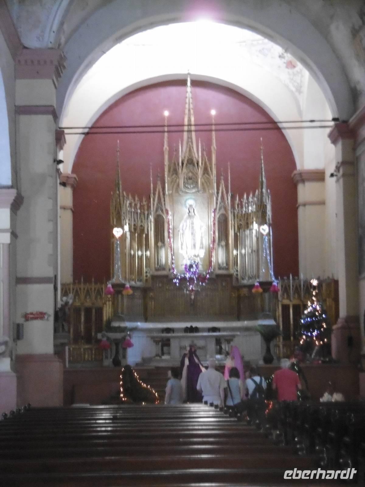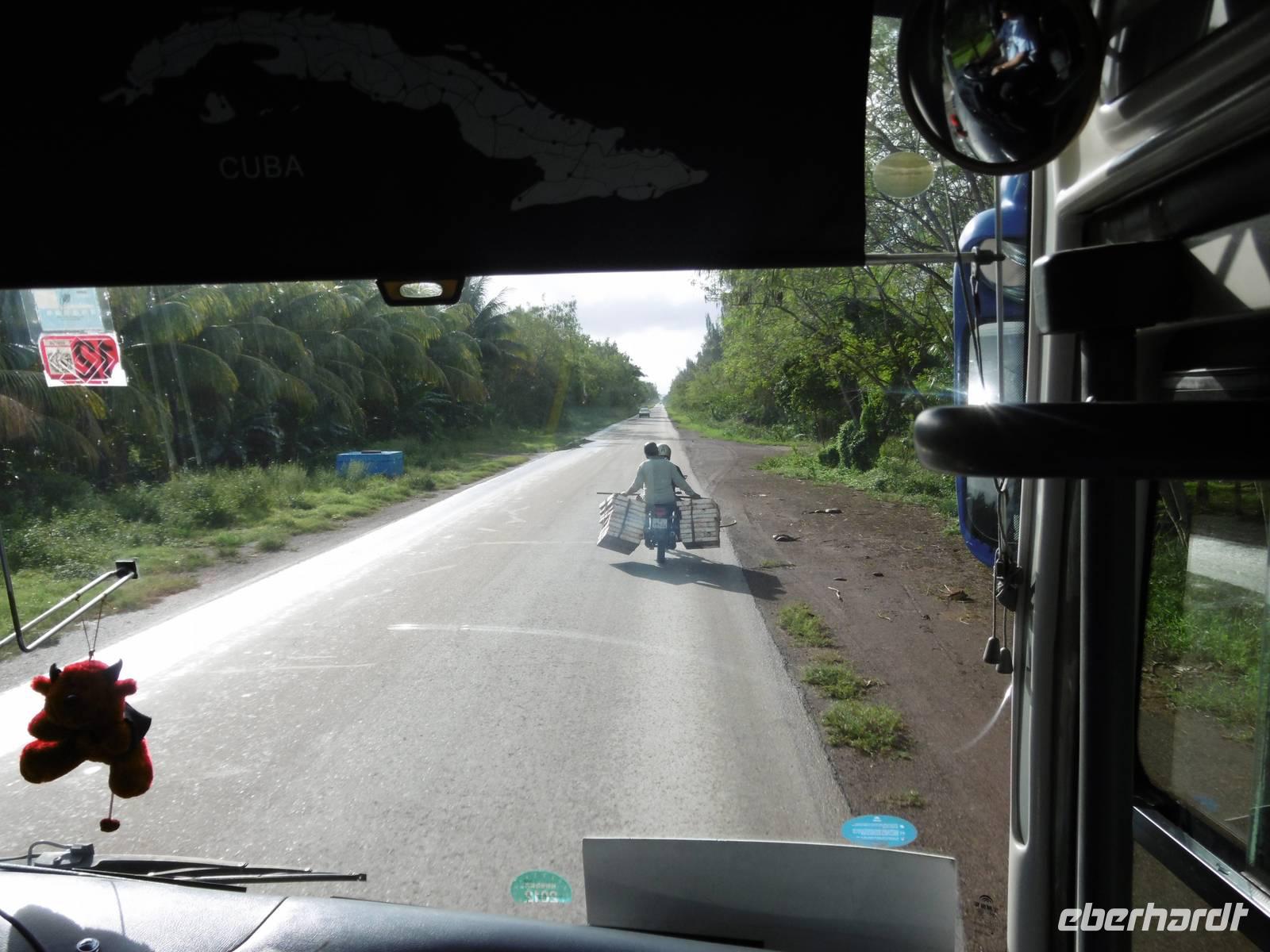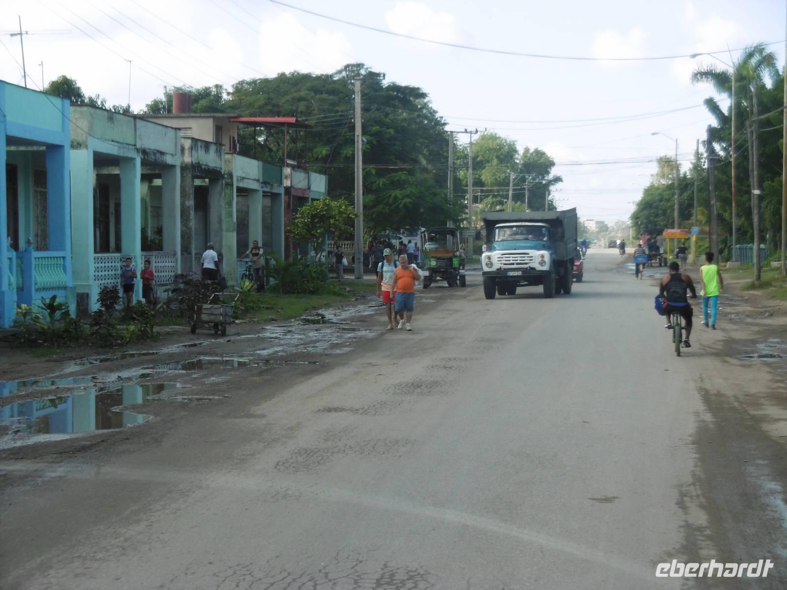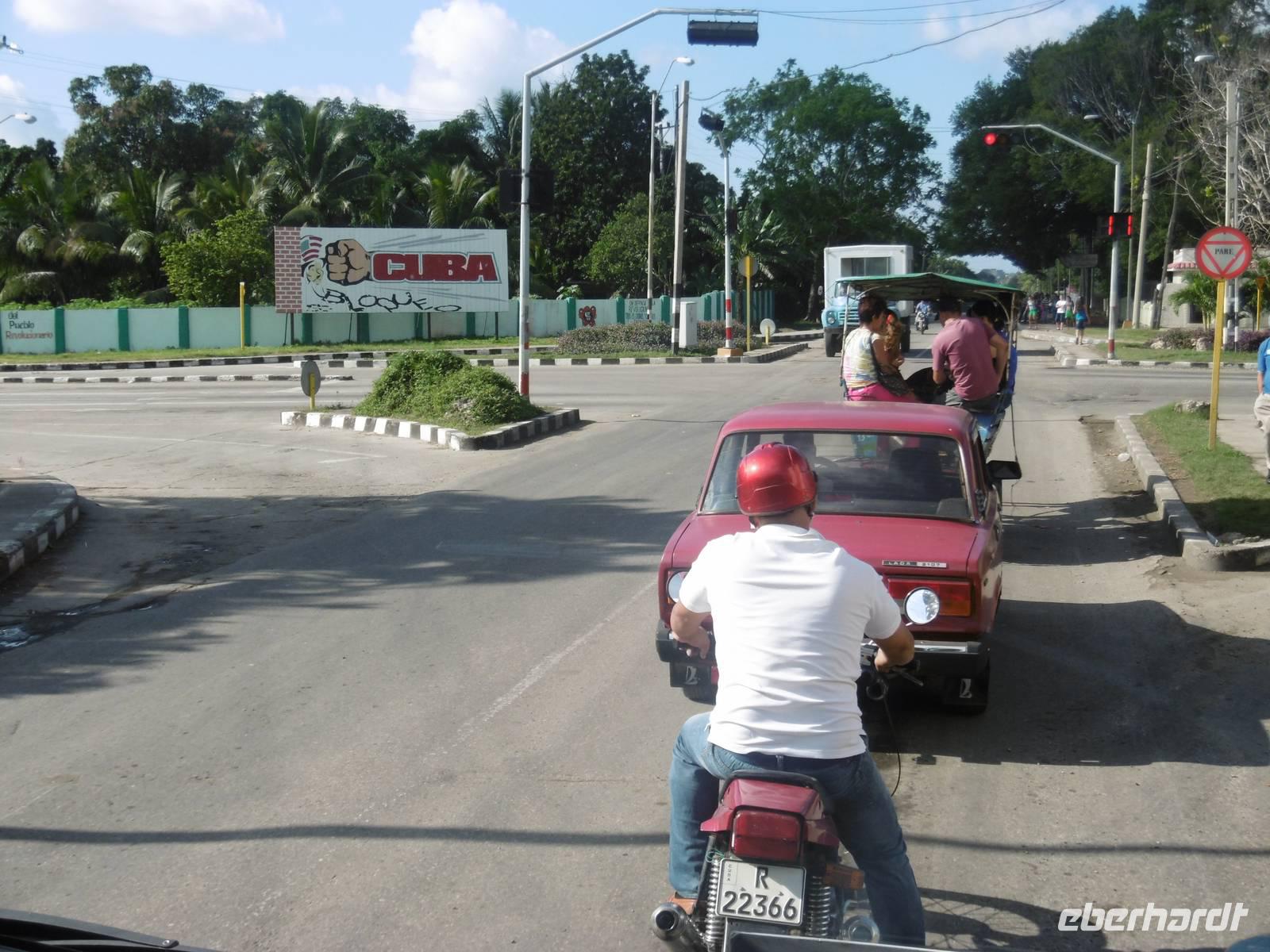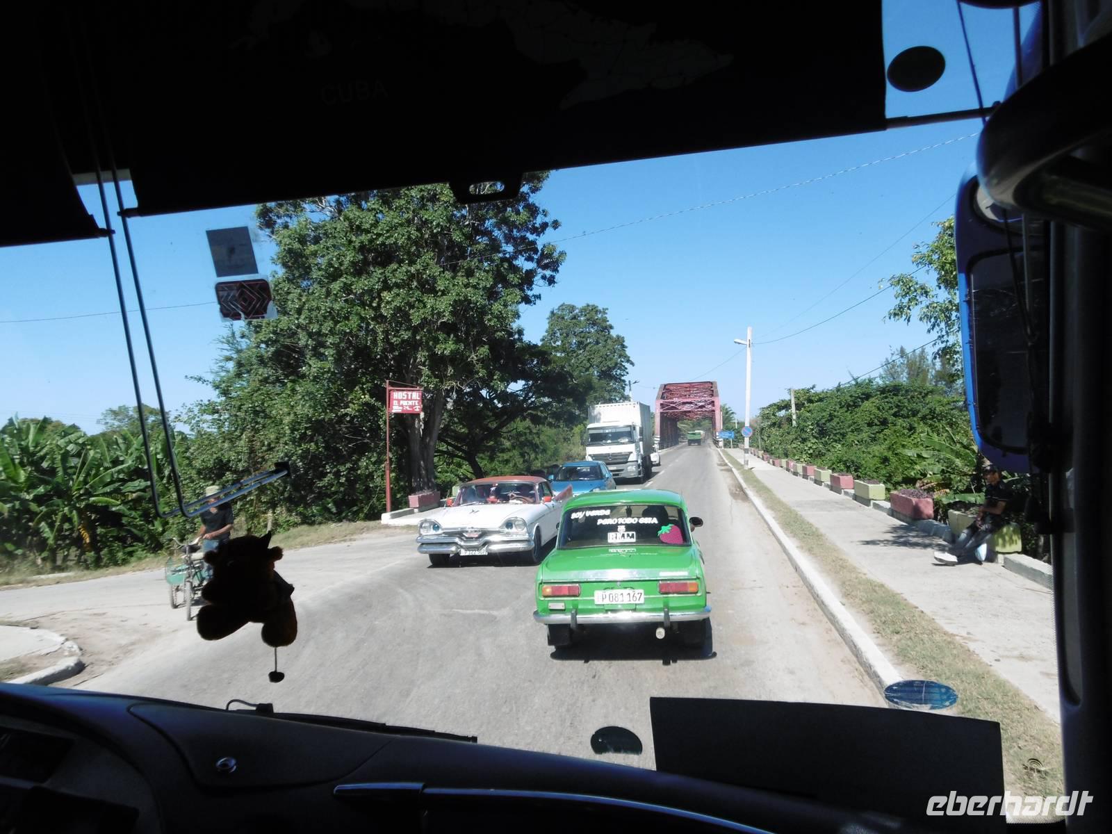 Gegen 8.30 Uhr starten wir von Cayo Santa Maria und verabschieden uns von einem Teil unserer Mitreisenden, welche im Hotel verlängern. Eine lange, aber lohnenswerte Strecke liegt vor uns - bis nach Camagüey in Ostkuba wollen wir heute gelangen! Auf diesem Weg fahren wir durch eher untouristische Landstriche und bekommen üppige Natur und tolle Straßenszenen zu Gesicht. Unser nächster Halt ist das eher unbekannte Städtchen Moron, die einzige größere Stadt auf dieser Strecke. Hier fahren wir zum Hotel Moron, von wo aus sich die Möglichkeit einer Kutschfahrt durch die Stadt bietet. Anschließend essen wir zu Mittag und setzen unsere Reise fort. Auf dem Weiterweg fahren wir vorbei an endlos weiten Zuckerrohrfeldern, Mangoplantagen, Yukafeldern und sehen auch vorbeifahrende Güter- und Personenzüge. Gegen Nachmittag erreichen wir das hübsche Städtchen Camagüey mit seinen gut erhaltenen und restaurierten Bauten aus der Kolonialstadt. Camagüey, die Stadt der Tonkrüge (Tinajones), der Labyrinthstraßen und viele Kirchen hat uns verzaubert. Da heute Dreikönigstag ist, stehen die Leute in den Spielzeuggeschäften Schlange - denn kubanische Kinder bekommen heute Ihre Geschenke. Nach dem Check In zeigt uns Marcos die Stadt, doch schon nach kurzer Zeit haben wir die Orientierung verloren. Im Museum Igancio Agromonte, welches gerade restauriert wird, sehen wir die berühmten Tonkrüge. Weiter spazieren wir entlang am Kino, dem Theater, sehen einige Kirchen und lassen uns die verschiedenen Ladenarten erklären. Das Abendessen genießen wir in unserem Hotel Camino del Hierro, welches sich gleich am großen Platz befindet. Hier herrscht am Abend buntes Treiben und zum Dreikönigstag sehen wir sogar einen nächtlichen Straßenumzug mit Weihnachtsmännern und Engeln.