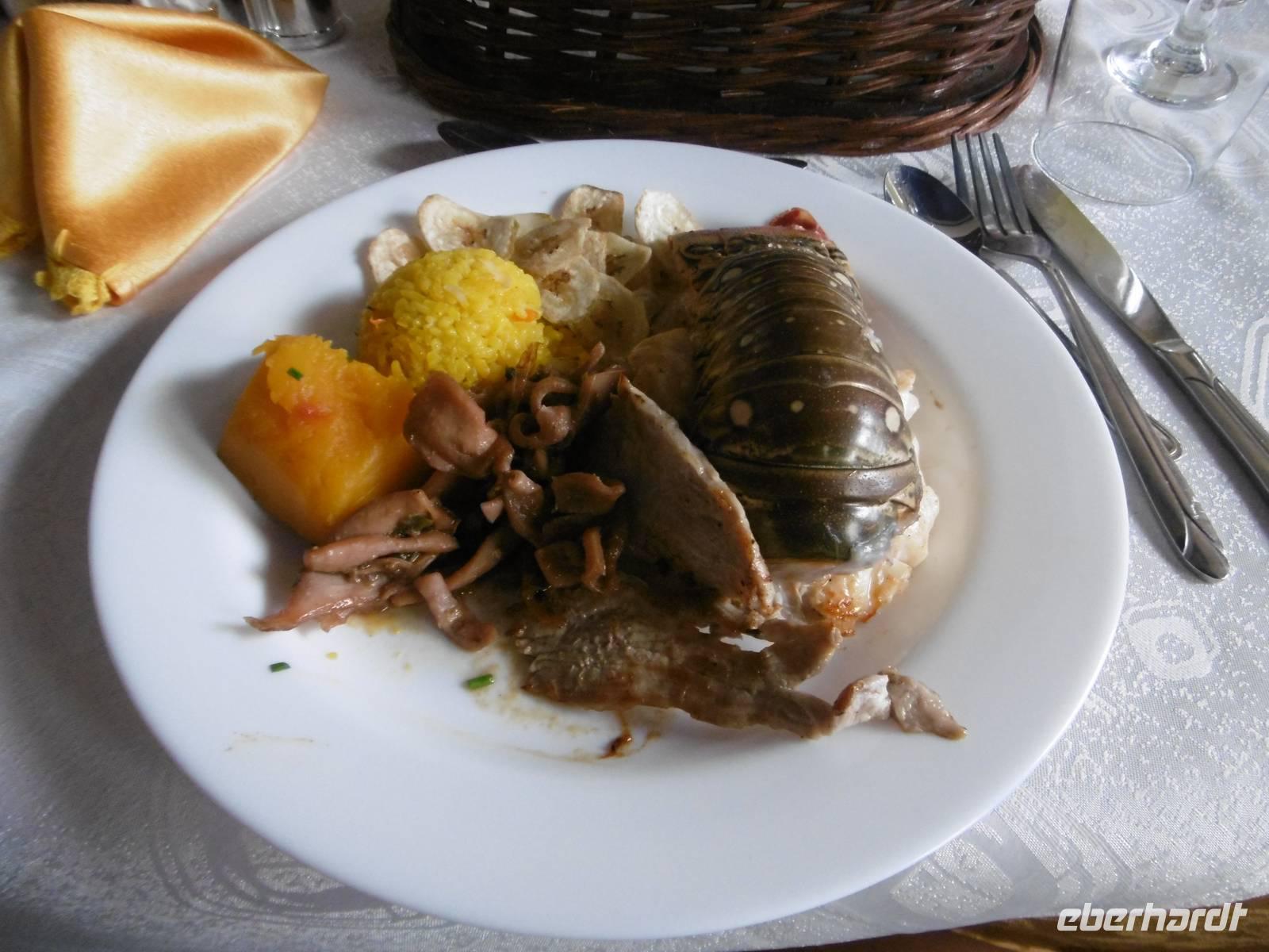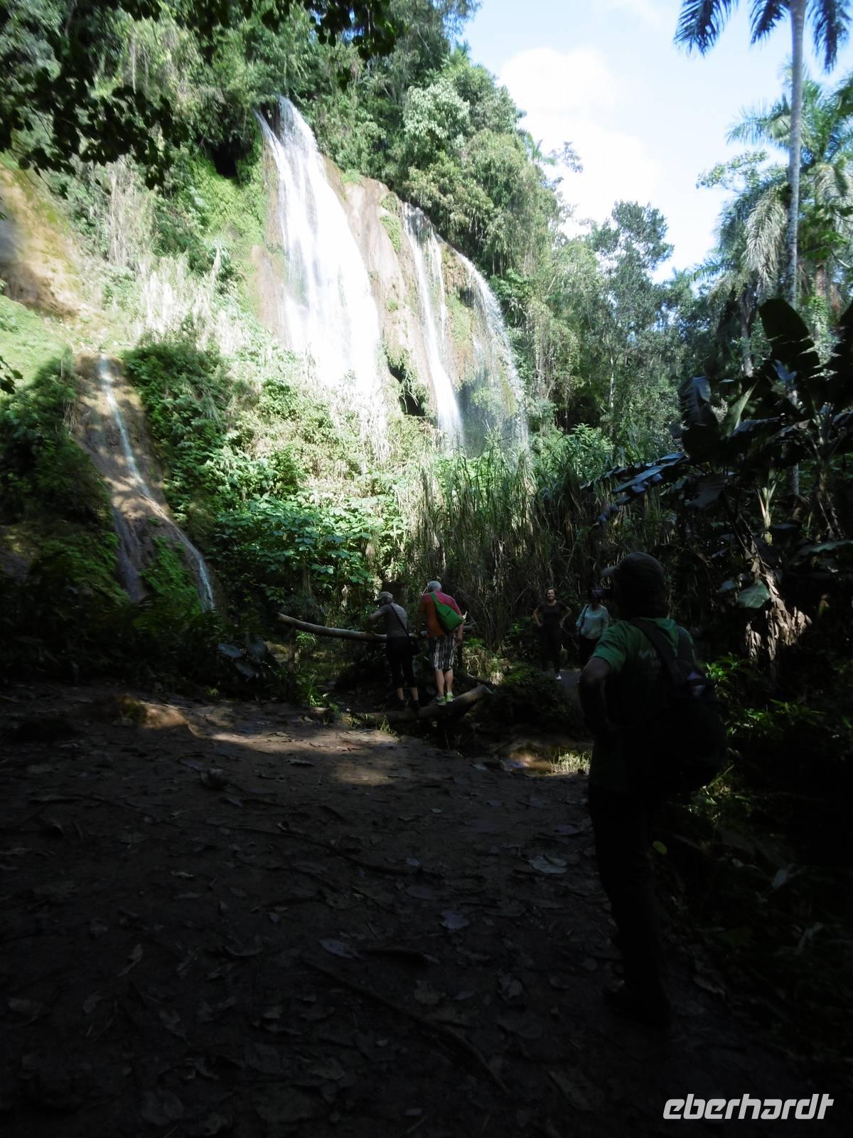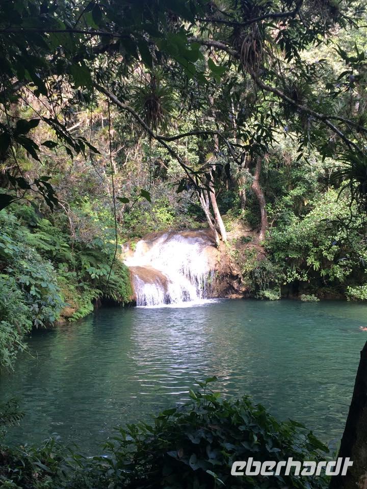 Nach dem Frühstück empfängt uns ein sonniger Tag, wie man ihn hier in Los Helechos selten erlebt. Unsere LKWs kommen mit kubanischer Unpünktlichkeit an und fahren uns unter großem Getöse tief ins Gebirge hinein. Wir fahren vorbei an kleinen Regenwaldsiedlungen und Bauernhäsusern, sehen schöne Gewächse wie den afrikanischen Tulpenbaum und haben tolle Sicht in die umliegenden Täler. Nach einer ca. halbstündigen Fahrt erreichen wir den Ausgangspunkt unserer Wanderung. Hier gibt es erstmal eine Kostprobe kubanischer Bananen und dann geht es in den Wald hinein. Zunächst schauen wir uns eine Kaffeeplantage an und sehen Mimosen, einen uralten Mandelbaum, Bananenstauden und vieles mehr. Auf dem Weg passieren wir kleine Flüsse, welche wir auf Baumstämmen überqueren und gelangen zum ersten Punkt, dem Salto Rocio einem riesigen Wasserfall. Weiter geht es zum Pozo, einer Regenwaldlagune. Viele gehen hier schwimmen. Marcos holt uns einige Schoten von Ochsenaugen vom Baum und erklärt uns welche Spässe die kubanischen Kinder damit haben. Dann spazieren wir weiter und finden noch so manche interessante Sachen auf dem Weg, hören den Nationalvogel Tocoroco und flücken Orangen. Endpunkt der Wanderung am Rio Melodioso ist ein Restaurant in welchen wir einen Abschiedscocktail trinken. Dann geht es durch die Bergwelt der Sierra Maestra wieder zurück zum Hotel Los Helechos zum Umziehen. Nach Trinidad braucht man einen knappe Stunde. Hier angekommen essen wir im Restaurant El Dorado. In Kuba wird vieles getan, was uns Europäern nicht in den Sinn kommt - so zum Beispiel Fisch und Fleisch zu mischen. Wir bekommen ein Menü aus Schweinefleisch, Tintenfisch und Languste - eine seltene Mischung, doch es schmeckt vorzüglich! Anschließend erklärt uns Marcos die Straßen der Stadt und wir haben noch Zeit um selbst durch die bunten Straßen zu schlendern und ein bisschen zu shoppen. Gegen Abend fahren wir bei Sonnenuntergang an der karibischen Küste und der größten Shrimpsanlage Kubas entlang nach Playa Faro Luna. Hier an einem Strand in der Nähe von Cienfuegos befindet sich unser Hotel Faro Luna. Wir checken ein und lassen den Abend bei einem gemeinsamen Abendessen und einen Spaziergang ausklingen.