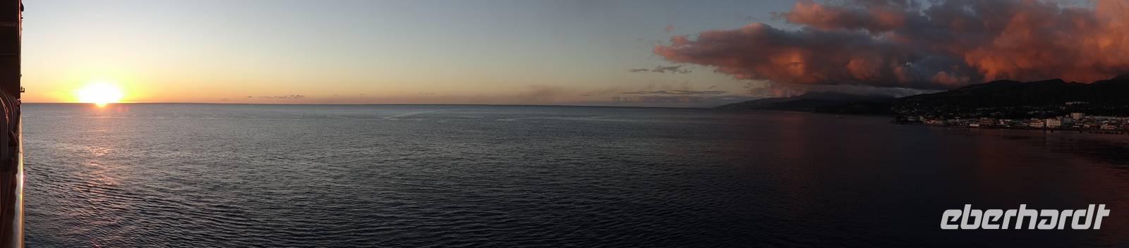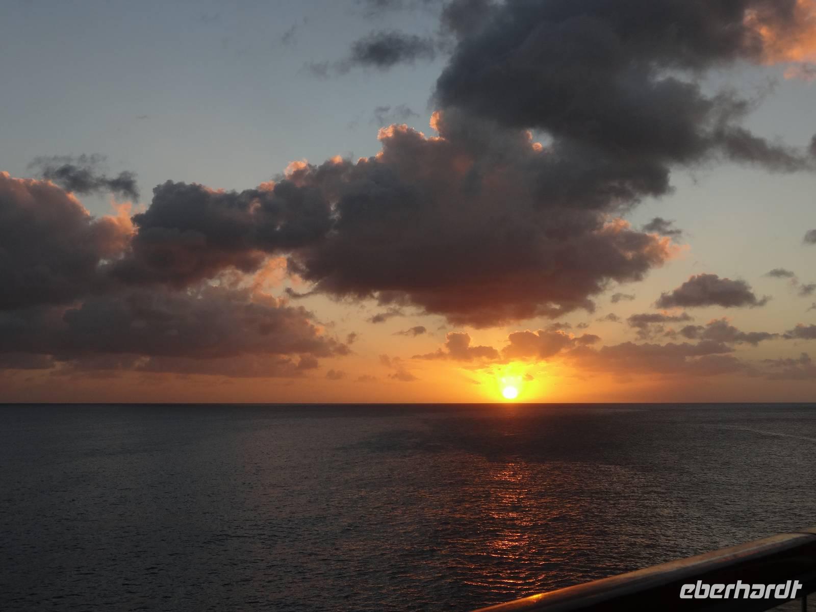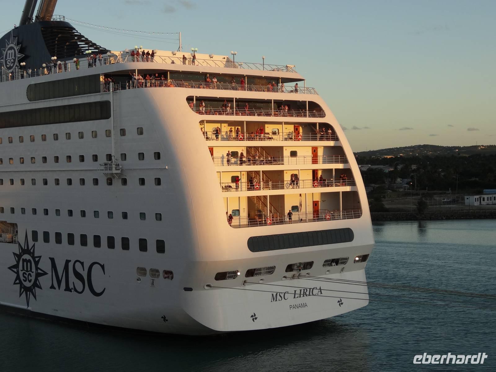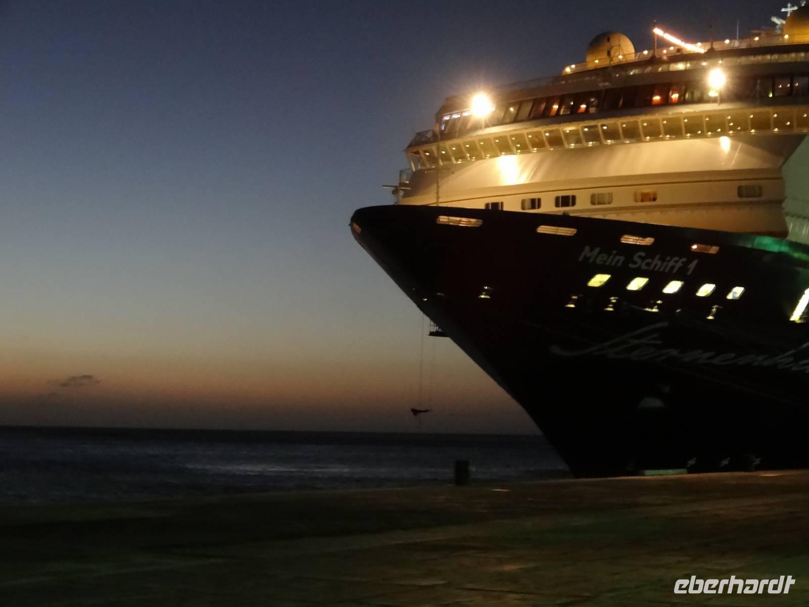 Nach einem ausgiebigen Frühstück und freien Vormittag checkten wir 11:00 Uhr aus und fuhren Richtung Hafen nach La Romana. Auf dem Weg hielten wir an einer schönen Zigarrenfabrik, wo uns die Herstellung der handgerollten Zigarren typisch dominikanischer Art genau gezeigt wurde und im Anschluss die Möglichkeit zum Kauf bestand.Wir waren nahezu die ersten „neuen" Gäste dieser Kreuzfahrt, die bereits am Schiff waren. Bevor der Check-In gegen 13.00 Uhr öffnete, füllten wir in Ruhe unsere Ausreisekarten aus und alsbald wurden wir herzlich an Bord der „Mein Schiff 1" begrüßt. Nach einem leckeren Mittagsbuffet konnten wir 15.00 Uhr unsere Kabinen beziehen, die über Dusche/WC, Föhn, TV, Minibar, Telefon, Safe und Espresso-Maschine verfügen. Bei einem ersten Rundgang bestaunten wir unser „schwimmendes Hotel" und genossen den Nachmittag an Bord. Nach dem Abendessen erfolgte die Seenotrettungsübung, die sehr geordnet und professionell verlief. Im Anschluss daran trafen wir uns auf dem Pooldeck, um einen gemeinsamen Aperitif in Form eines kühlen Sekts zu genießen und auf die gemeinsame kommende Fahrt anzustoßen. Dann hieß es in musikalischer Form „Herzlich Willkommen"! Bei einem kühlen Glas Prosecco begrüßte die Crew ihre Gäste und die Hymne „Große Freiheit" wurde live vorgestellt. Auch das Tanz- und Theaterensemble zeigte eine erste Kostprobe aus den bevorstehenden Shows. Nach diesem herrlichen Auftakt verbrachten wir dann unsere erste Nacht auf hoher und ruhiger See.