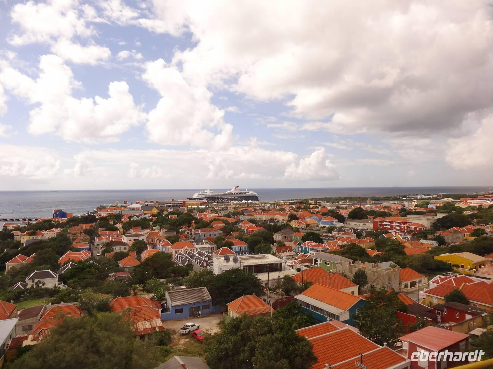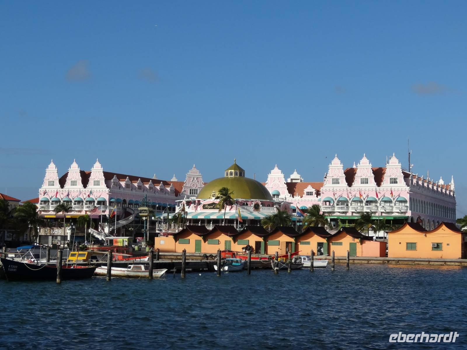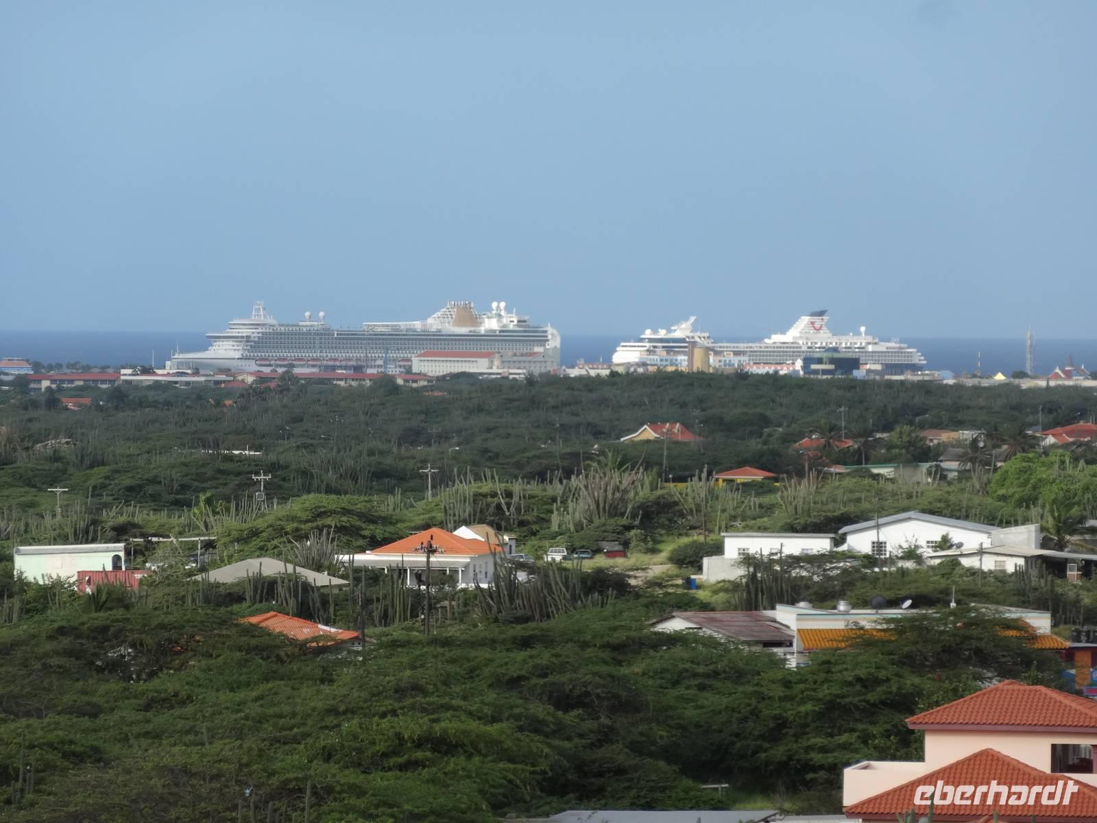 Aruba, eine der ABC-Inseln, zählt zu den schönsten der Karibik mit exotischer Fischpracht, üppigen Kakteen, den typischen Divi-Divi-Bäumen sowie fröhlichen Inselbewohnern. Am Vormittag lernten wir bei unserem Halbtagesausflug die kleine Insel gut kennen. Ich übersetzte alles ins Deutsche, was unser freundlicher, Englisch sprechender Driver Guide erzählte. Wir sahen das zauberhafte Oranjestad mit seinen farbenfrohen Kolonialbauten im alten holländischen Stil, die alte und die kleine neue „Natural Bridge", Naturbrücken aus Korallengestein, die Chapel Alto Vista sowie den Leuchtturm „California", Arubas Wahrzeichen. Die Rückfahrt erfolgte entlang der Küste am Palm Beach mit Fotostopp am Eagle Beach. Dieser Strand war nicht weit vom Schiff und entfernt und wir haben alle Gästen empfohlen, den Nachmittag an diesem traumhaften Karibik-Strand zu verbringen. Im hübschen Oranjestad waren leider die meisten Geschäfte geschlossen, da wir am sonnigen Sonntag vor Ort waren.