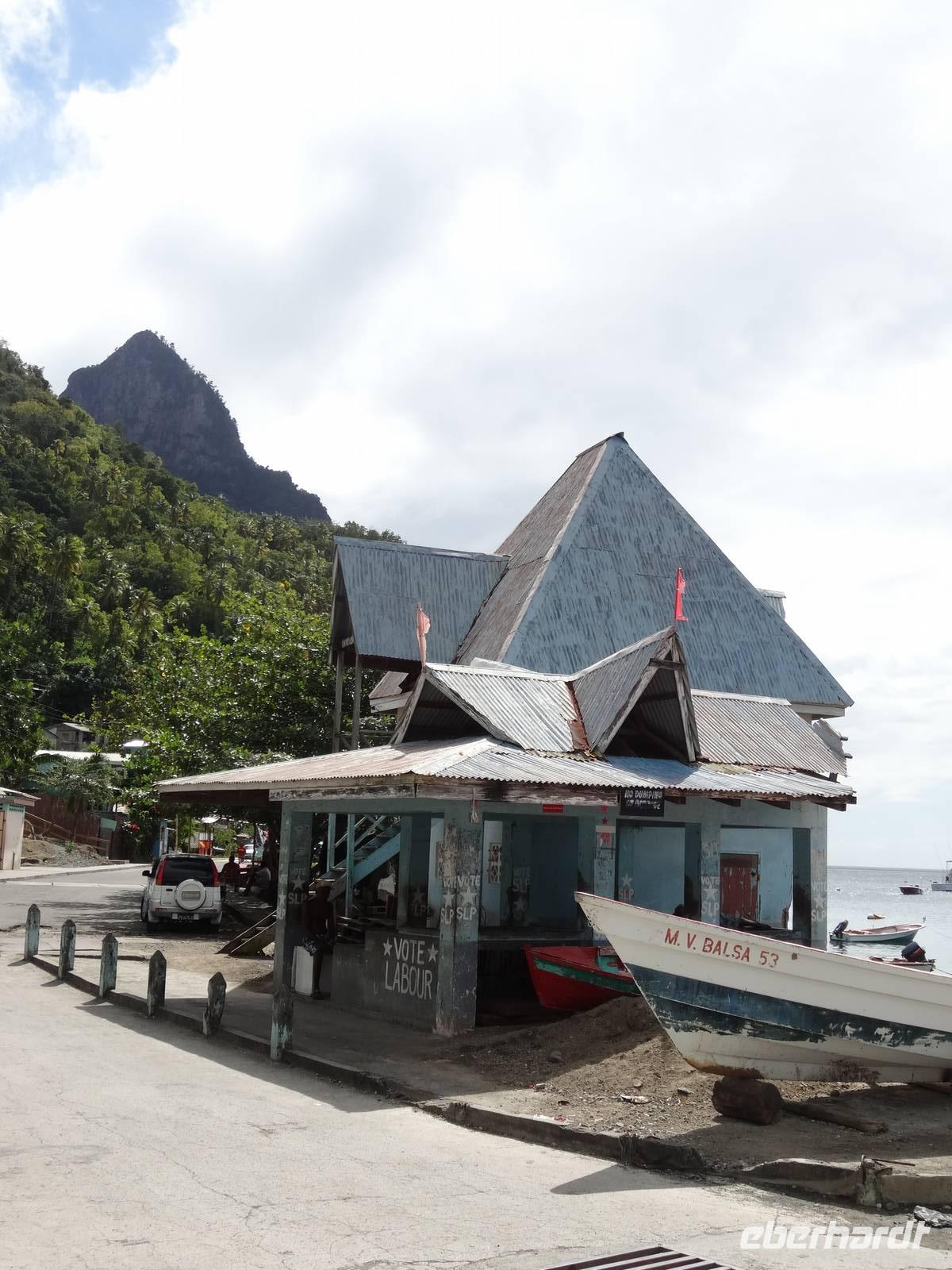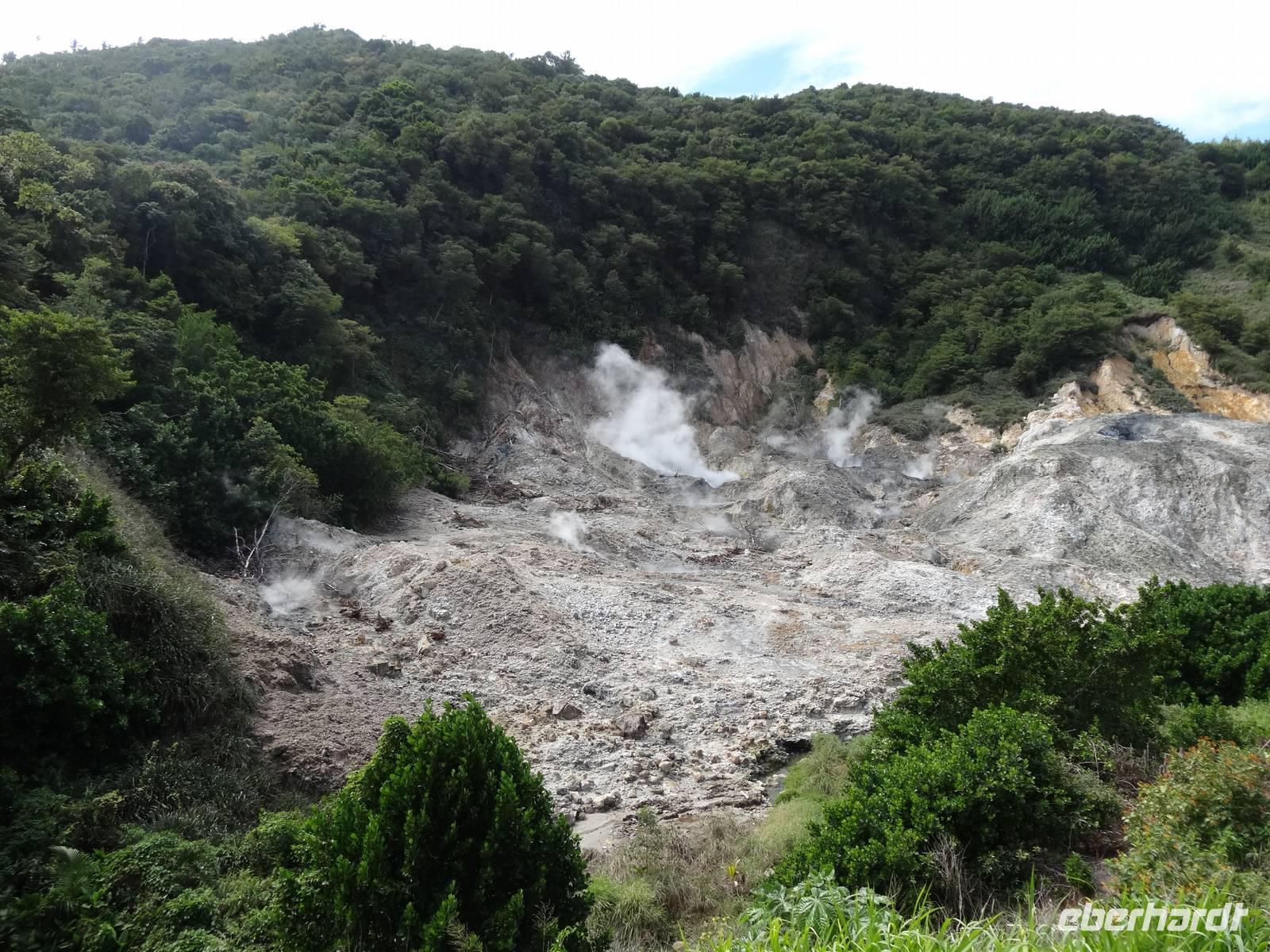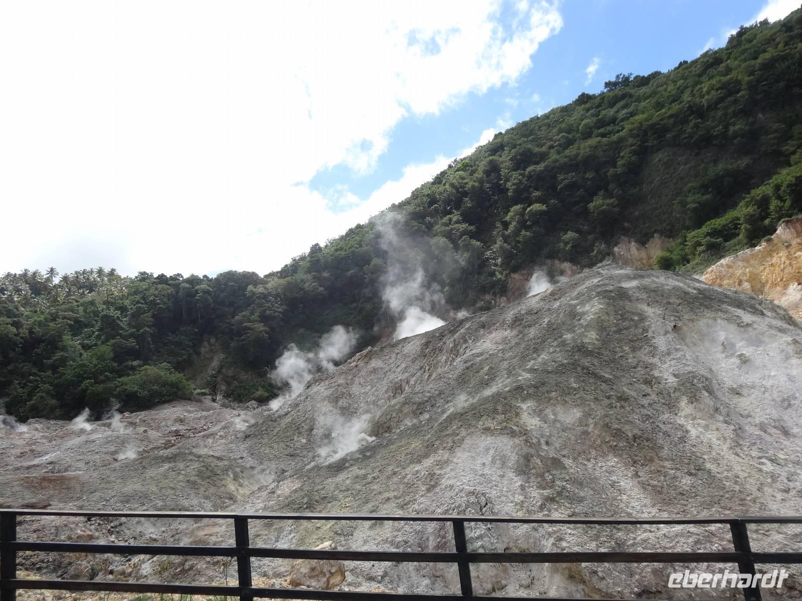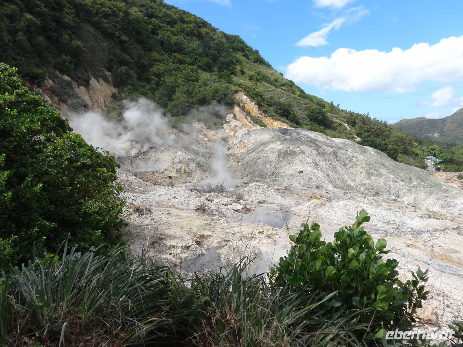 Auf der weiteren Fahrt boten sich uns wunderbare Ausblicke auf die charakteristischen Vulkankegel des Petit Piton (743m) und Gros Piton (770m), den Gouverneurspalast und die Bucht von Castries. Bei einer ganz privaten kleinen Bakery machte unser Reiseleiter Dieter mit uns Halt und wir verkosteten das leckere Früchtebrot und ich reichte den zuvor gekauften Rum-Likör. Welch eine leckere Zwischenmahlzeit ! Dann fuhren wir zu den Schwefelquellen La Soufriere Sulphur Springs. Die bis zum 18. Jahrhundert noch als Heilbäder genutzten brodelnden Quellen sind heute lediglich von einer Plattform aus zu besichtigen, um Unfälle zu vermeiden. Nach einem kleinen Rundgang fuhren wir, begleitet vom "köstlichen" Schwefelgeruch, weiter Richtung Soufriére. Nach etwas Freizeit bestiegen wir unser Boot und genossen vor der Abfahrt ein köstlich exotisches karibisches BBQ Hühnchen, Fisch, Nudeln und Reis Ca. 3 Stunden ging unsere Bootstour entlang der Südostküste durch die Marigot-Bay zurück bis nach Castries. Unterwegs machten wir einen erfrischenden Badestopp in einer kleinen Bucht mit kristallklarem, seichtem Wasser vor der Kulisse der saftig grünen Palmen und des schwarzen Sandstrandes. Begleitet von Reggae- und Salsaklängen sowie kühlem Rumpunsch erreichten wir wieder die „Mein Schiff 1".