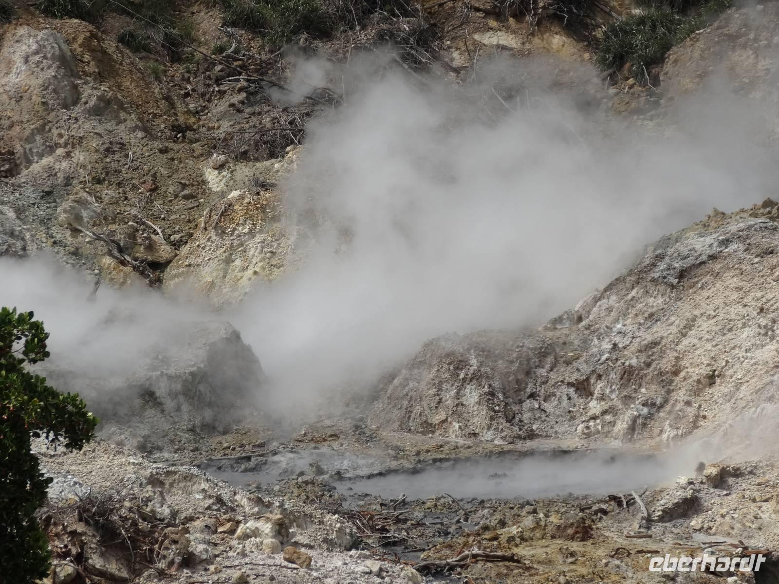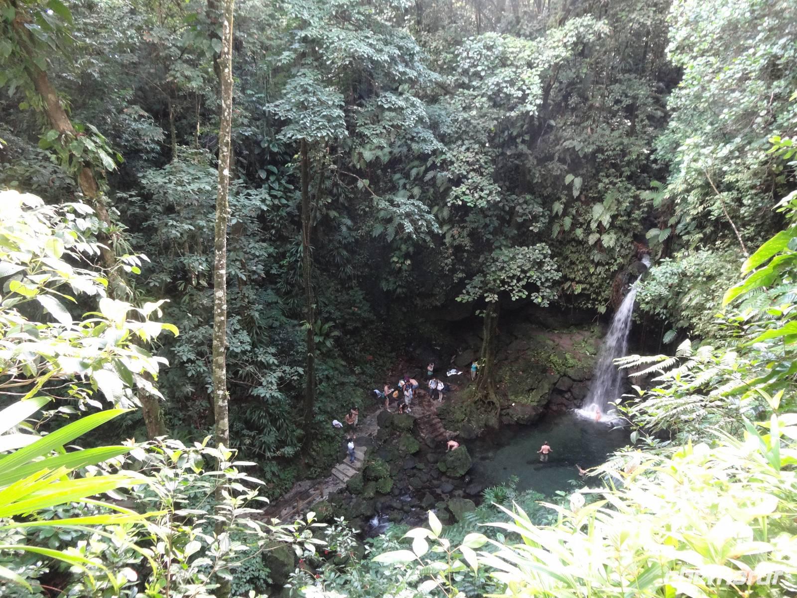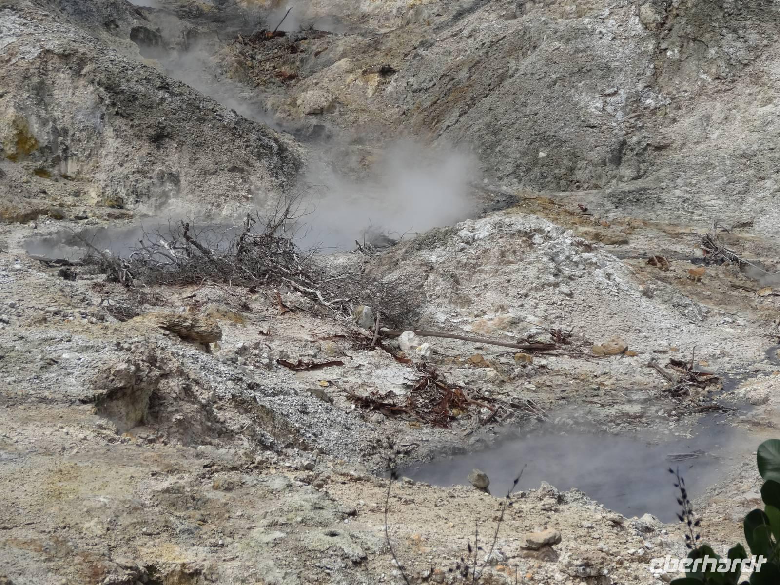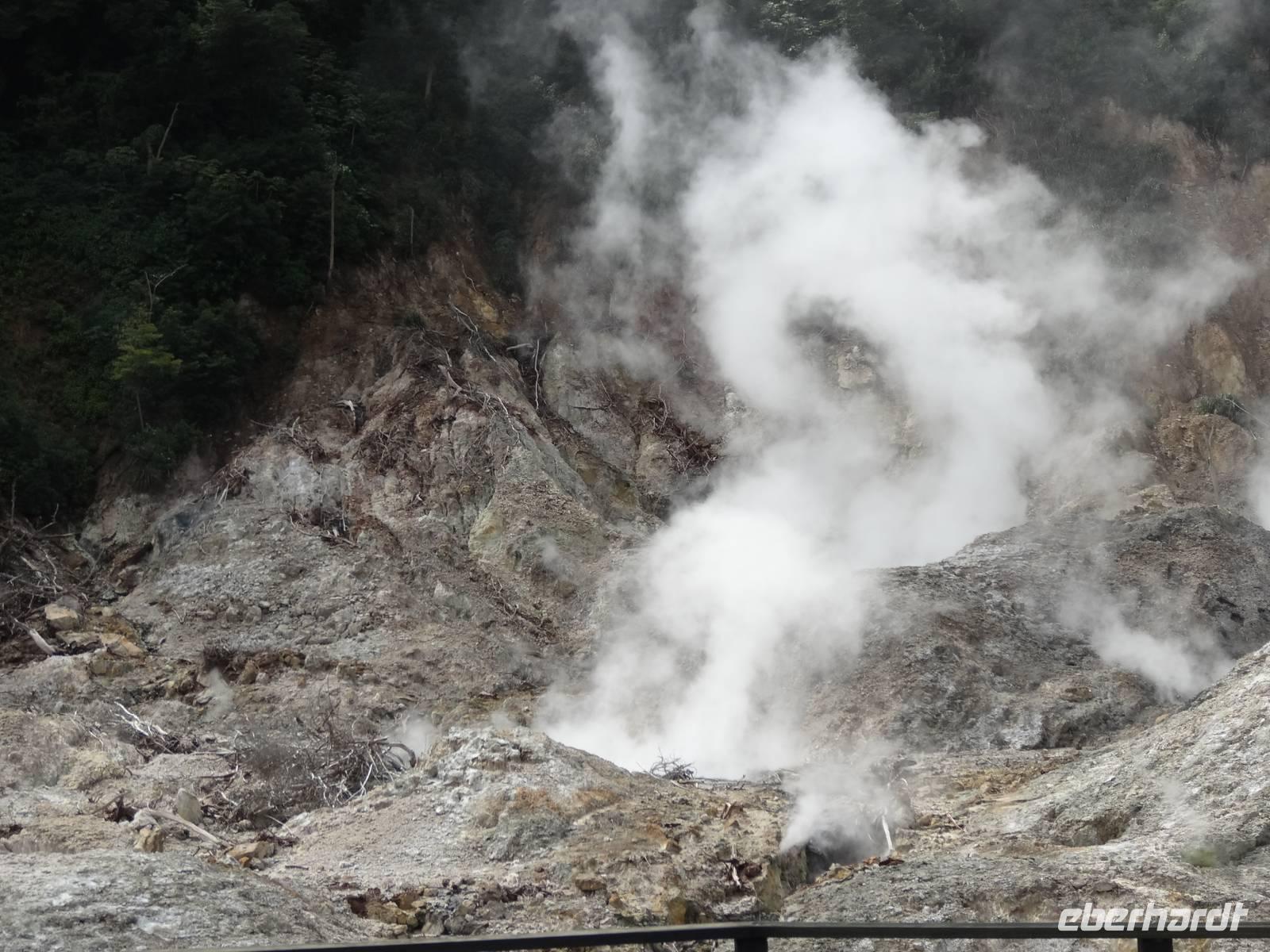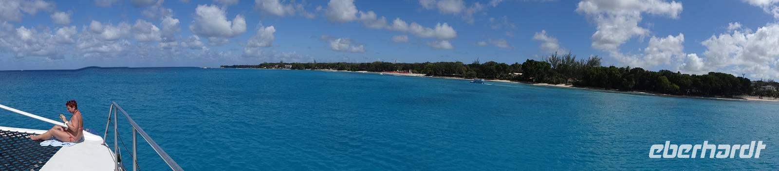 Auf der weiteren Fahrt boten sich uns wunderbare Ausblicke auf die charakteristischen Vulkankegel des Petit Piton (743m) und Gros Piton (770m), den Gouverneurspalast und die Bucht von Castries. Bei einer ganz privaten kleinen Bakery machte unser Reiseleiter Dieter mit uns Halt und wir verkosteten das leckere Früchtebrot und ich reichte den zuvor gekauften Rum-Likör. Welch eine leckere Zwischenmahlzeit ! Dann fuhren wir zu den Schwefelquellen La Soufriere Sulphur Springs. Die bis zum 18. Jahrhundert noch als Heilbäder genutzten brodelnden Quellen sind heute lediglich von einer Plattform aus zu besichtigen, um Unfälle zu vermeiden. Nach einem kleinen Rundgang fuhren wir, begleitet vom "köstlichen" Schwefelgeruch, weiter Richtung Soufriére. Nach etwas Freizeit bestiegen wir unser Boot und genossen vor der Abfahrt ein köstlich exotisches karibisches BBQ Hühnchen, Fisch, Nudeln und Reis Ca. 3 Stunden ging unsere Bootstour entlang der Südostküste durch die Marigot-Bay zurück bis nach Castries. Unterwegs machten wir einen erfrischenden Badestopp in einer kleinen Bucht mit kristallklarem, seichtem Wasser vor der Kulisse der saftig grünen Palmen und des schwarzen Sandstrandes. Begleitet von Reggae- und Salsaklängen sowie kühlem Rumpunsch erreichten wir wieder die „Mein Schiff 1".