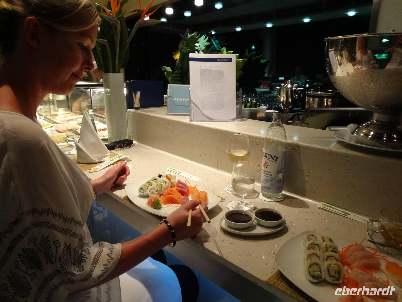 Die Sonne ging schon früh auf und begrüßte uns freundlich zu unserem ersten Seetag an Bord der "Mein Schiff 1". In verschiedenen Restaurants warteten leckere Frühstücksbuffets auf uns und ließen uns gesund und ausgewogen in den Tag starten. Um 10:00 Uhr trafen wir uns an Deck 12 in der „Himmel und Meer Lounge" bei einem Glas Sekt, um im Anschluss das Schiff bei einer individuellen Führung kennenzulernen. Stefan von den Gastgebern zeigte uns seinen Arbeitsplatz mit sehr viel Elan und positiver Energie und so hatten wir die Möglichkeit, in die kulinarische und wohl designte Welt des schwimmenden Hotels einzutauchen und einen Überblick zu gewinnen. Im Anschluss hatte man erneut die Qual der Wahl: Fischrestaurant, Grillstation, á la carte-Restaurant oder doch lieber asiatisches Buffet?