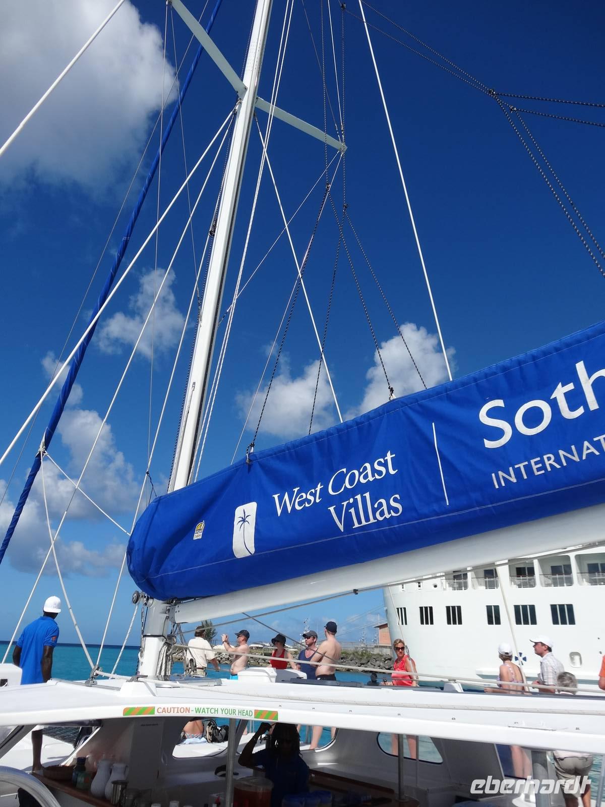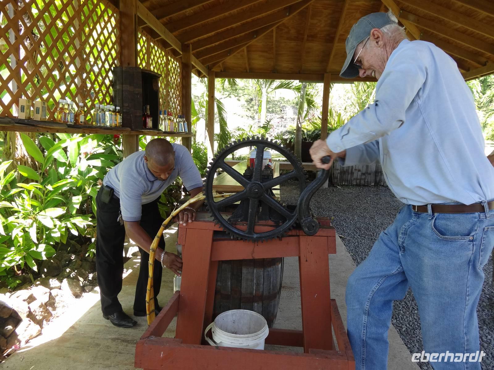 Danach ging es zum fröhlichen Frühschoppen in einer idyllisch gelegenen, mittlerweile stillgelegten Rumdestillerie. Wir hatten die Möglichkeit, uns durch fünf verschiedene Sorten zu trinken und die jeweilige Lieblingsrichtung im Anschluss auch käuflich zu erwerben. Unseren letzten Stopp machten wir am nahegelegenen Aussichtspunkt und nutzten den traumhaften Blick auf die angrenzenden Traumstrände und die „Mein Schiff 1" gleich für ein sonniges Gruppenfoto.