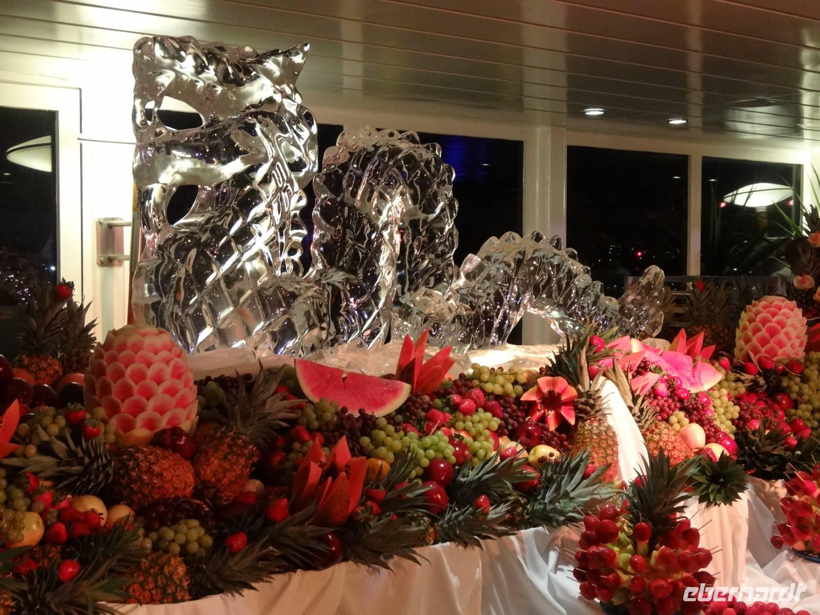 Den Abend verbrachten wir ab 21.00 Uhr im Theater, wo unser Kapitän und die leitenden Offiziere des Schiffes vorgestellt wurden. Auf humorvolle Art und Weise wurden in dem bis zum letzten Platz gefüllten Saal alle wichtigen Personen vorgestellt. Im Anschluss folgte die Show „Ein Lied umgeht die Welt", die uns anschließend beschwingt zu Bett gehen ließ.