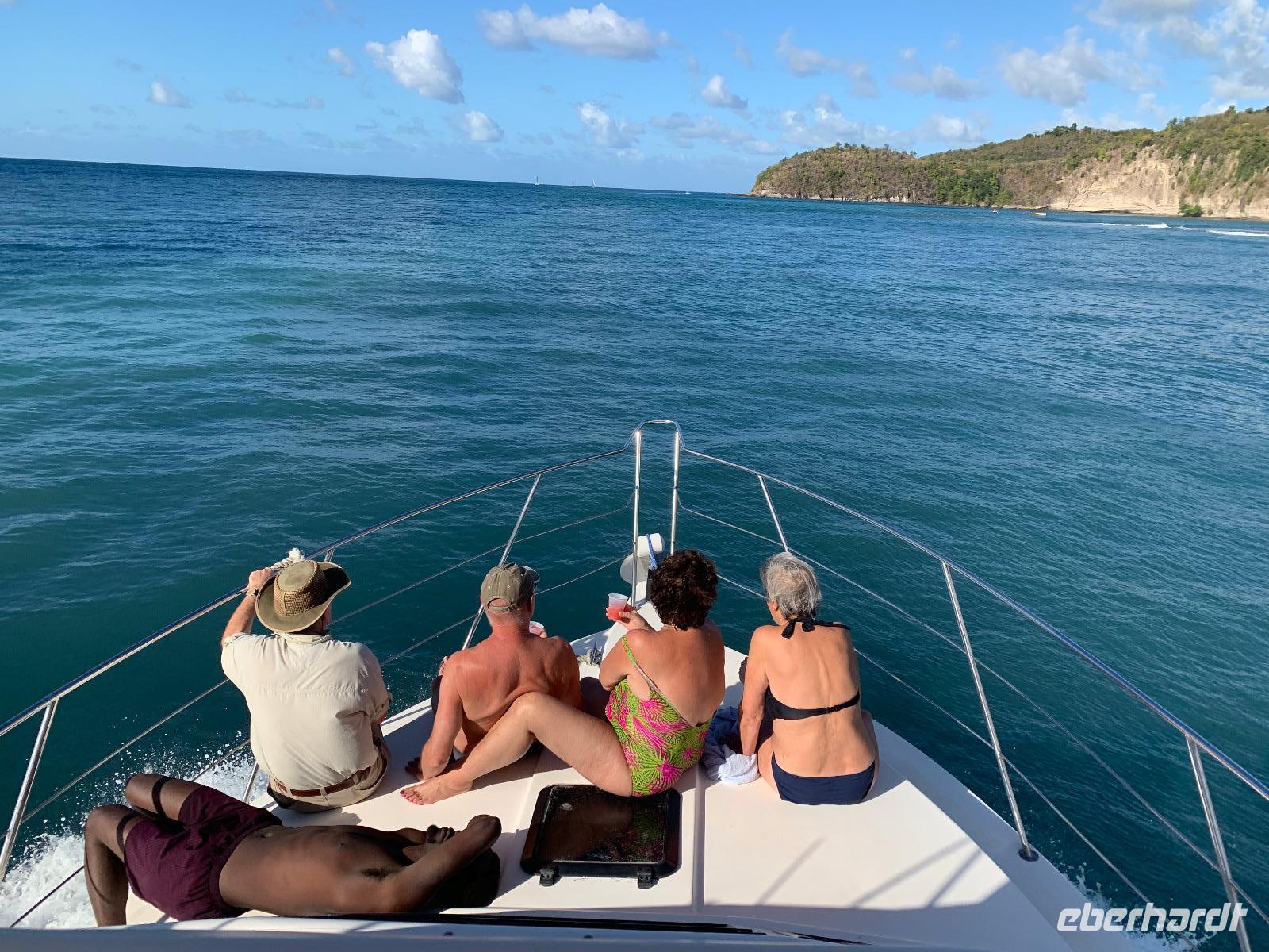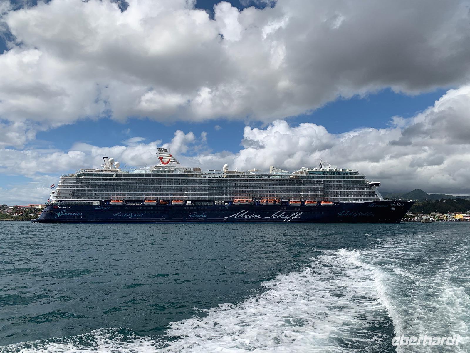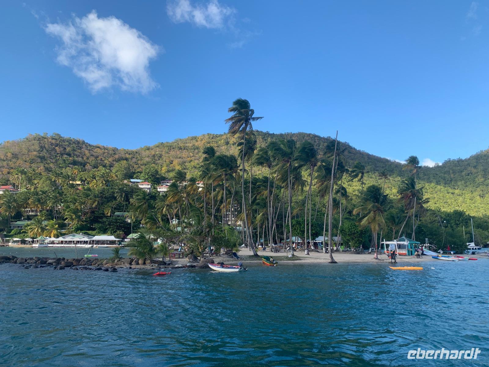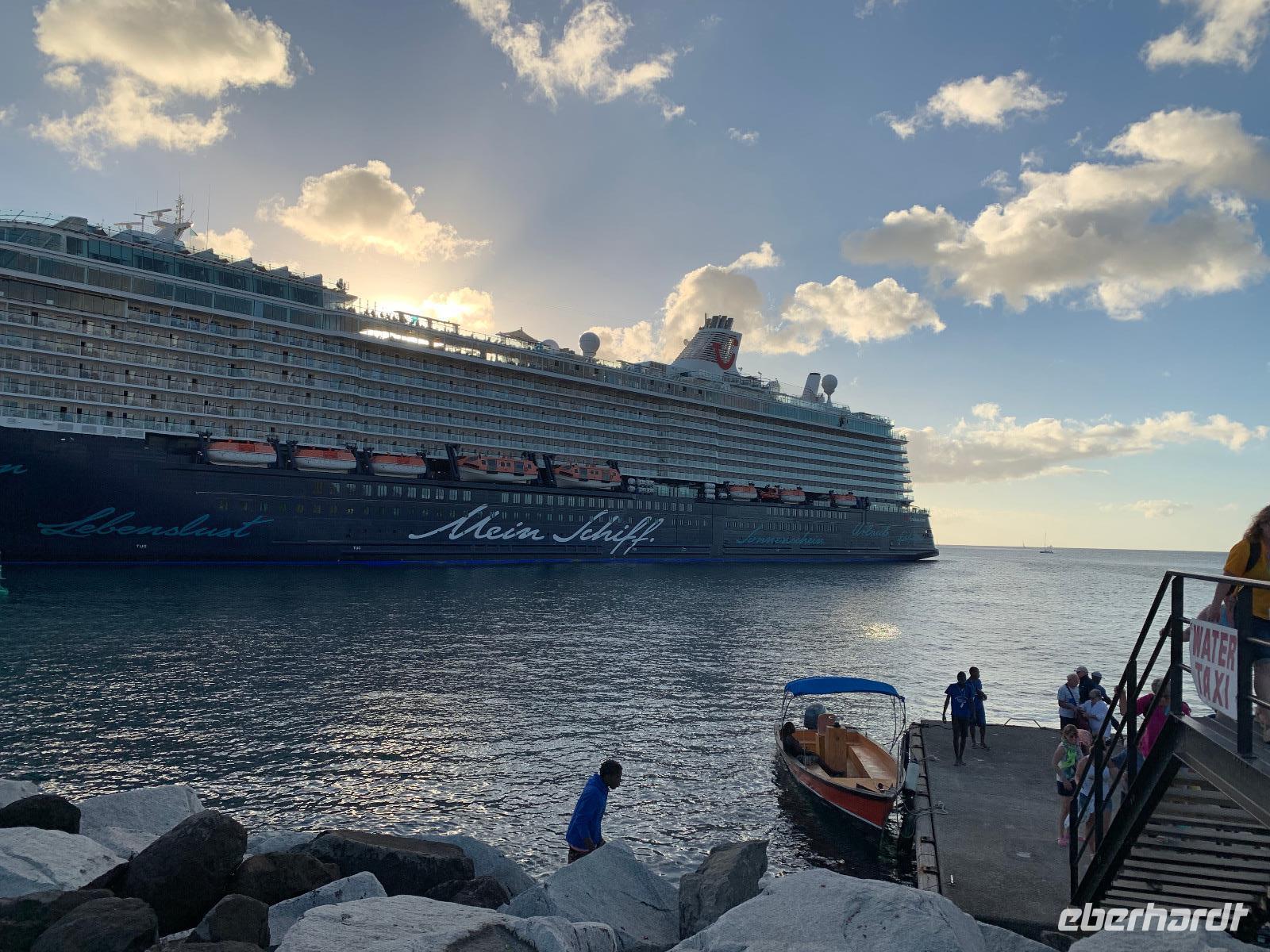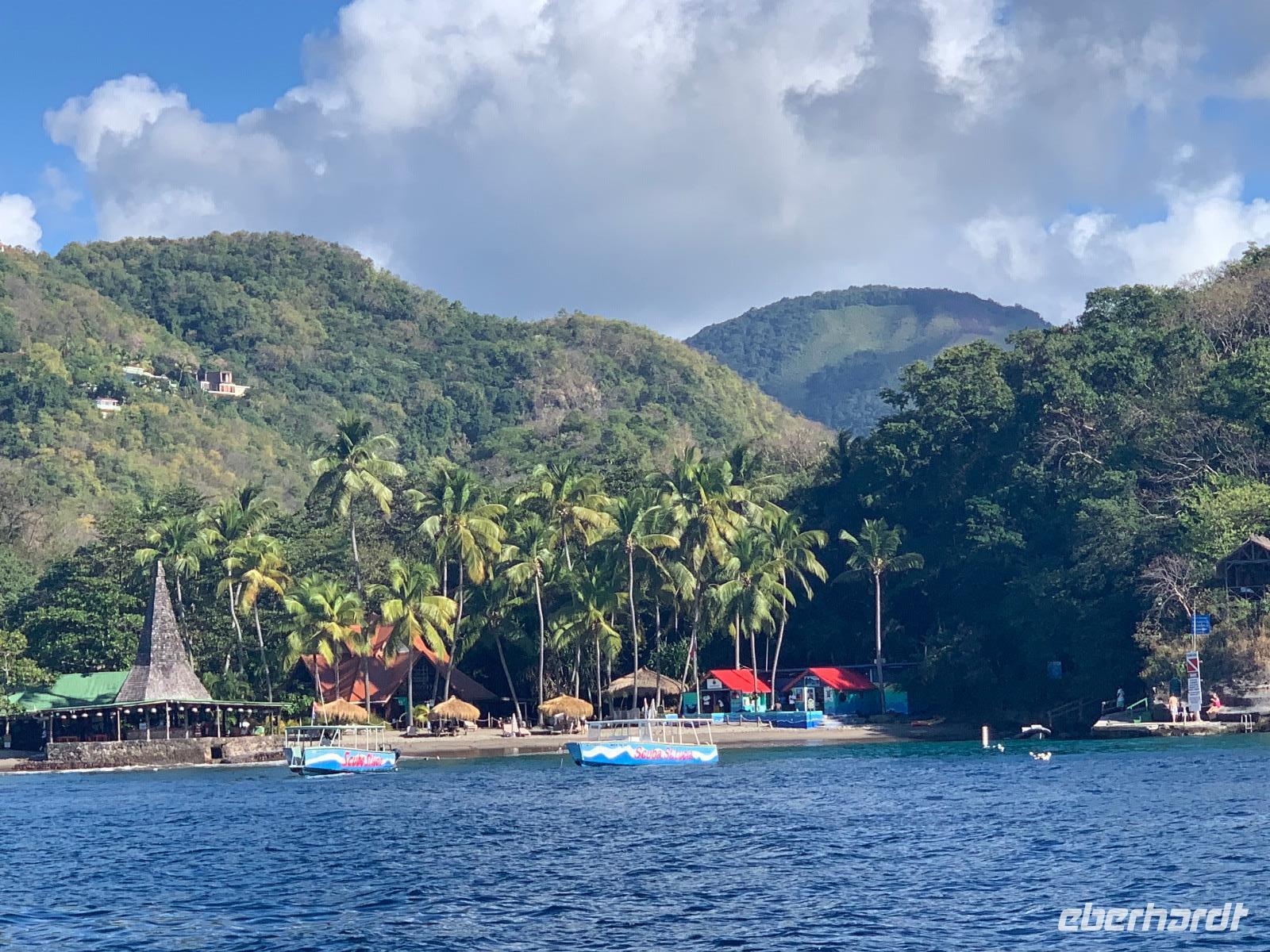 Wir besteigen unser exklusives Eberhardt-Boot und fahren ganz nah an der Star Clipper vorbei, die inzwischen vor Soufrière geankert hat und auch wir halten in der Bucht von Soufrière für einen erfrischenden Badestopp. Wir erfrischen uns im kristallklaren karibischen Meer und genießen den Panoramablick auf die beiden Pitons. Nach dem Bade- und Schnorchelausflug haben wir uns den Rumpunsch wohl verdient ??!Unsere Bootstour führt weiter entlang der Südostküste durch die Marigot-Bay zurück bis nach Castries. Unterwegs genießen wir den Blick auf die traumhaft schöne Küste mit den saftig grünen Palmen, die einen herrlichen Kontrast zu den schwarzen Sandstränden bilden. Begleitet von Reggae- und Salsaklängen sowie kühlem (Rum-) Punsch erreichen wir wieder die Mein Schiff 5.