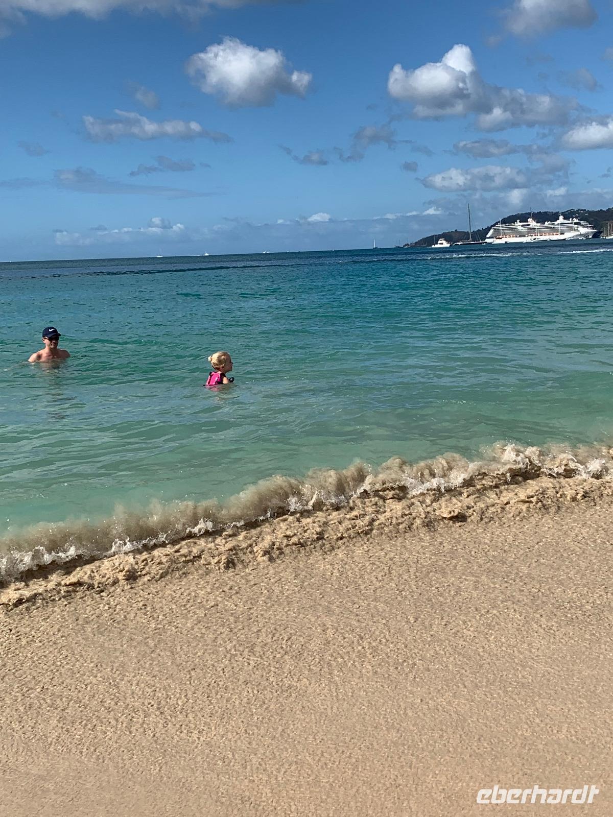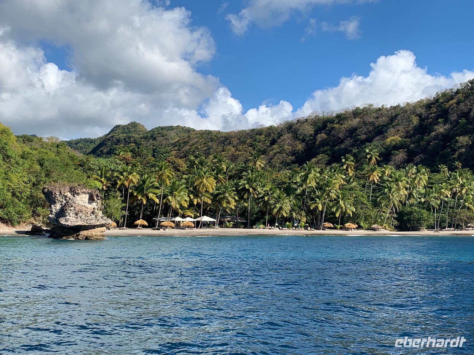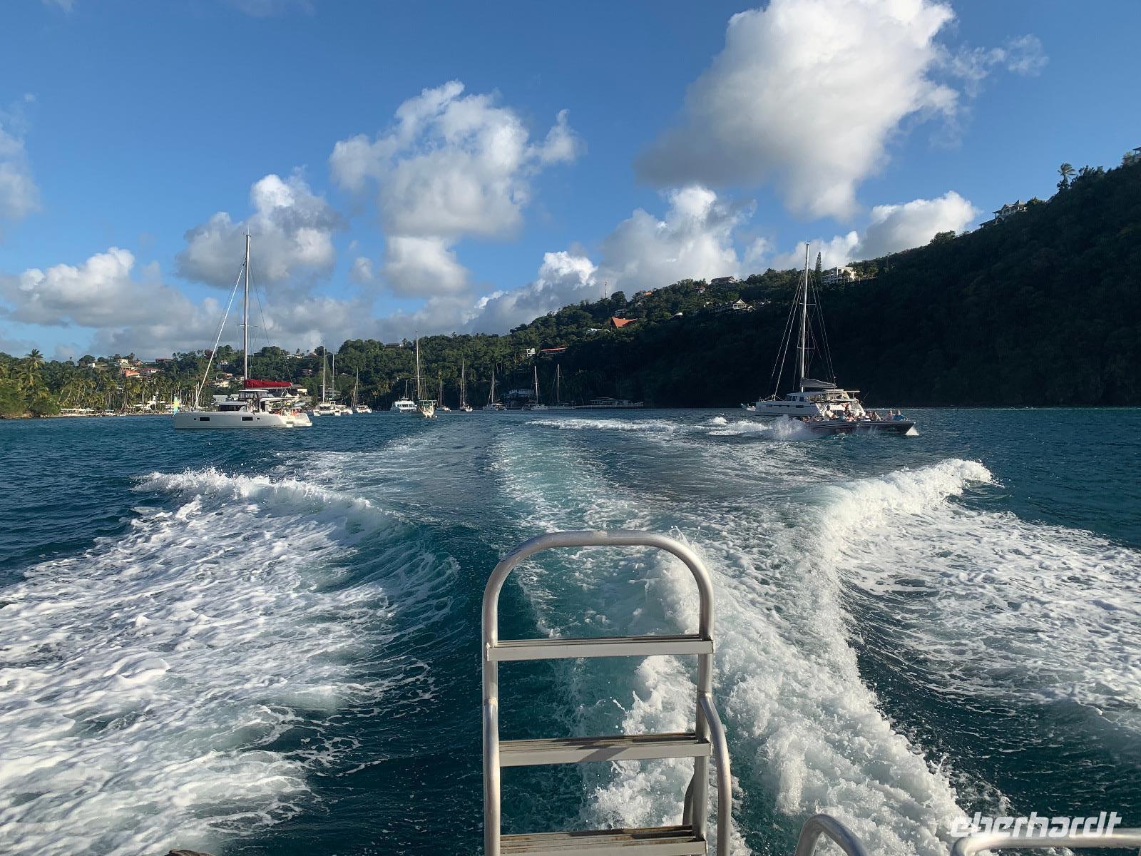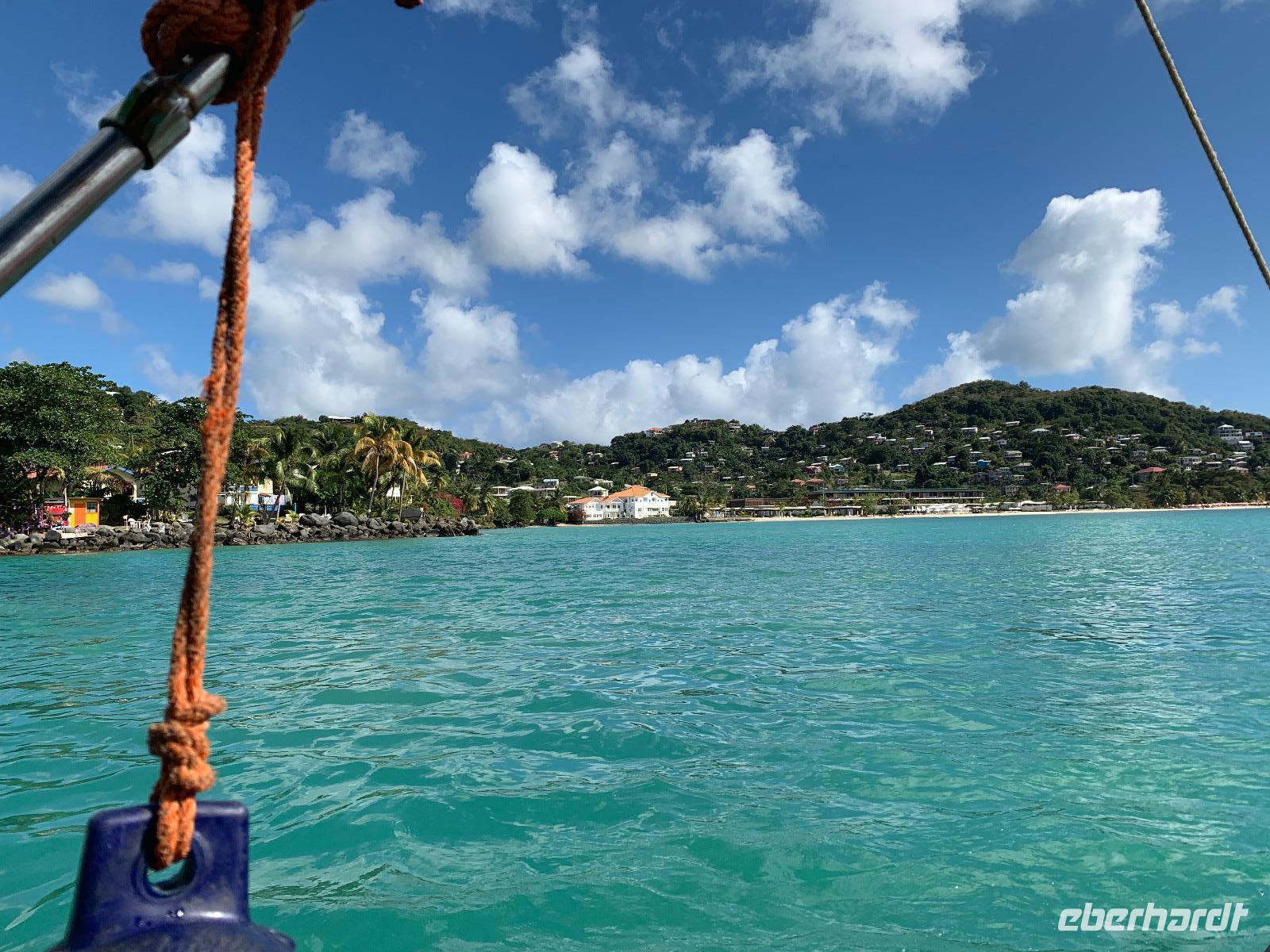 Wir besteigen unser exklusives Eberhardt-Boot und fahren ganz nah an der Star Clipper vorbei, die inzwischen vor Soufrière geankert hat und auch wir halten in der Bucht von Soufrière für einen erfrischenden Badestopp. Wir erfrischen uns im kristallklaren karibischen Meer und genießen den Panoramablick auf die beiden Pitons. Nach dem Bade- und Schnorchelausflug haben wir uns den Rumpunsch wohl verdient ??!Unsere Bootstour führt weiter entlang der Südostküste durch die Marigot-Bay zurück bis nach Castries. Unterwegs genießen wir den Blick auf die traumhaft schöne Küste mit den saftig grünen Palmen, die einen herrlichen Kontrast zu den schwarzen Sandstränden bilden. Begleitet von Reggae- und Salsaklängen sowie kühlem (Rum-) Punsch erreichen wir wieder die Mein Schiff 5.