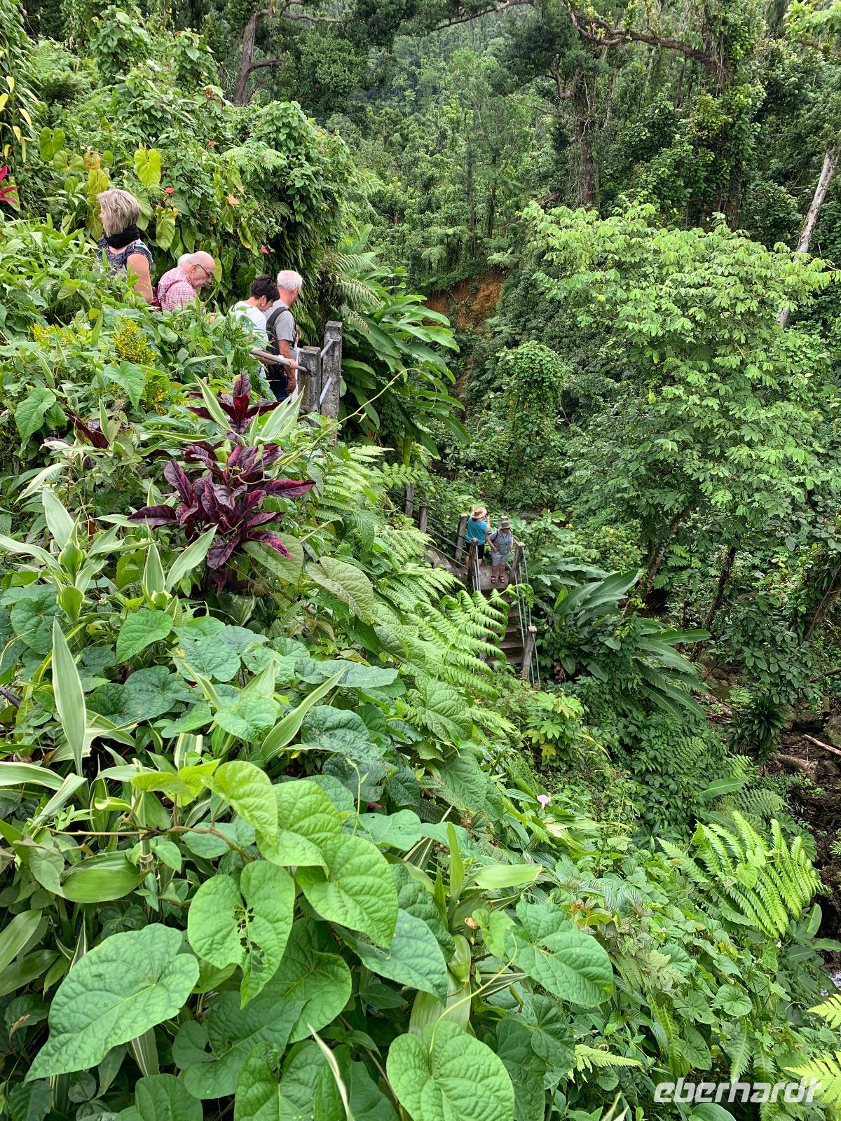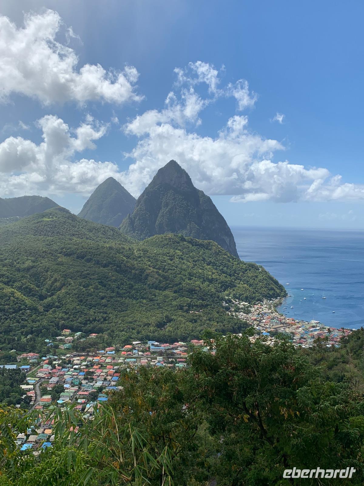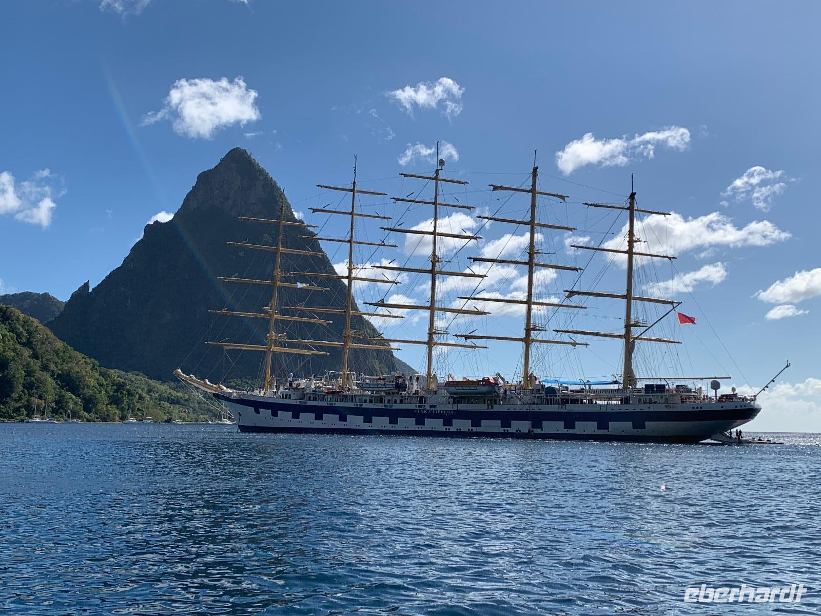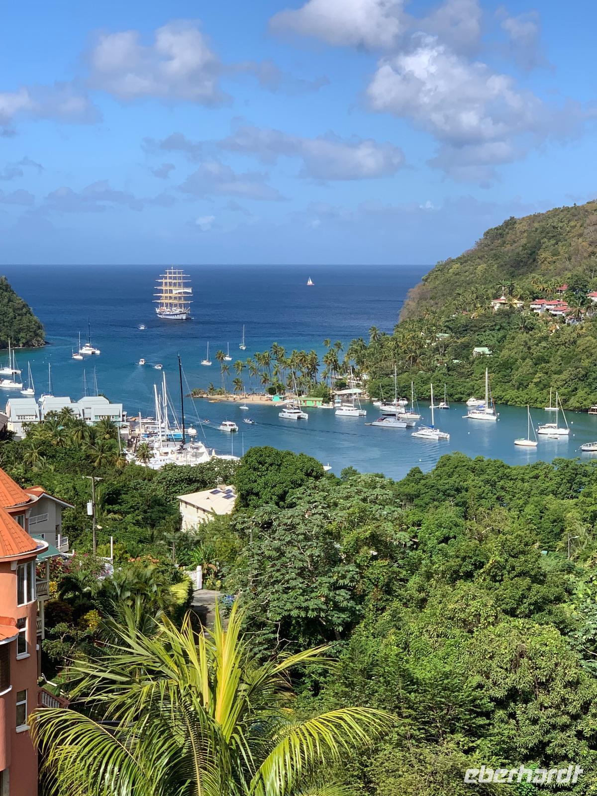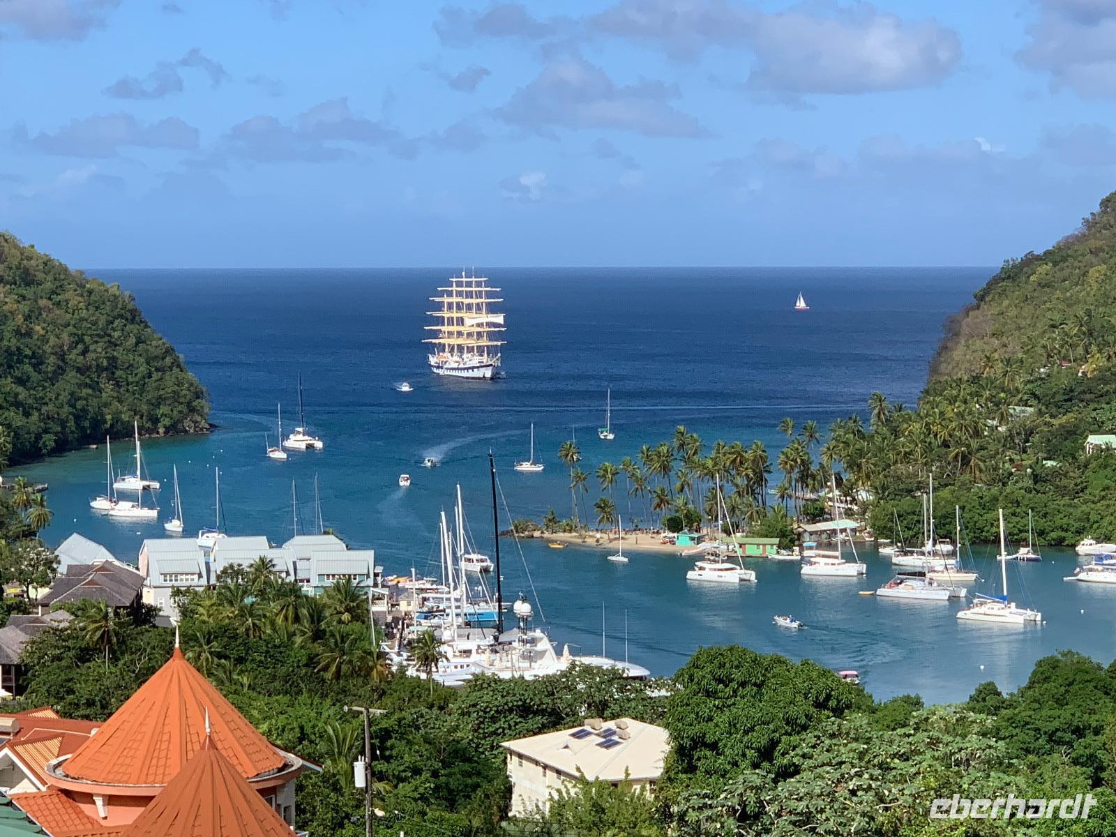 Über Nacht setzten wir nach St. Lucia über, wo wir pünktlich 7.30 Uhr unsere Anker vor der Hauptstadt Castries setzen. Bei unserem Eberhardt-Ganztagesausflug lernen wir die natürliche Vielfalt dieser karibischen Perle kennen. Unsere Reiseleiterin Christiane lebt seit über 10 Jahren auf der Insel und in all ihren Erklärungen hört man die Liebe und Verbundenheit zu ihrer neuen Heimat heraus. Zunächst fahren wir zu einem Aussichtspunkt, von wo wir einen tollen Blick auf unser Schiff im Hafen haben, eingebettet in die hügelige Küstenlandschaft der Bucht. Beim nächsten Stopp eröffnet sich uns der Blick auf die berühmte Marigot-Bay, wo nicht nur zahlreichen Villen prominenter Sternchen stehen, sondern heute auch die Star Clipper vor Anker liegt und ein diesem Foto-Motiv noch das I-Tüpfelchen aufsetzt. Wir fahren durch das alte Fischerdorf Canaries und oberhalb halten wir bei einem kleinen Laden, wo uns Christiane die heimischen exotischen Früchte der Mango- und Bananeninsel zeigt und wir diese sowie leckeres Bananenbrot verkosten dürfen.