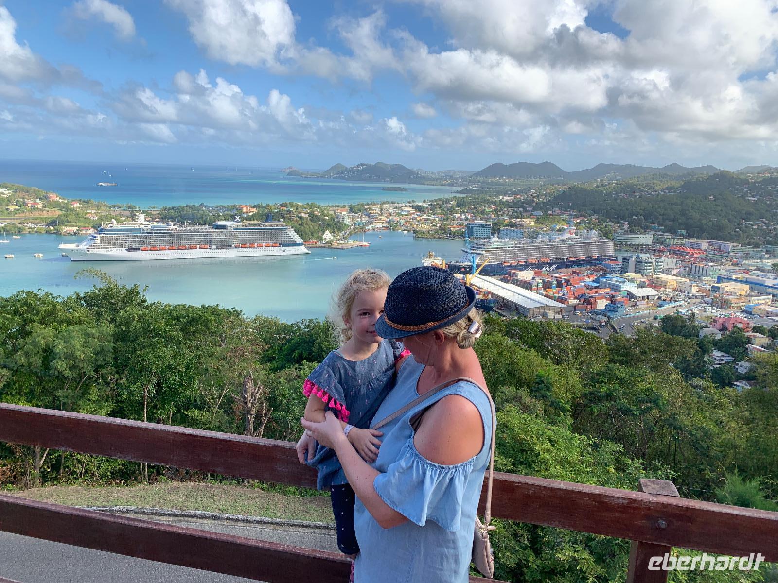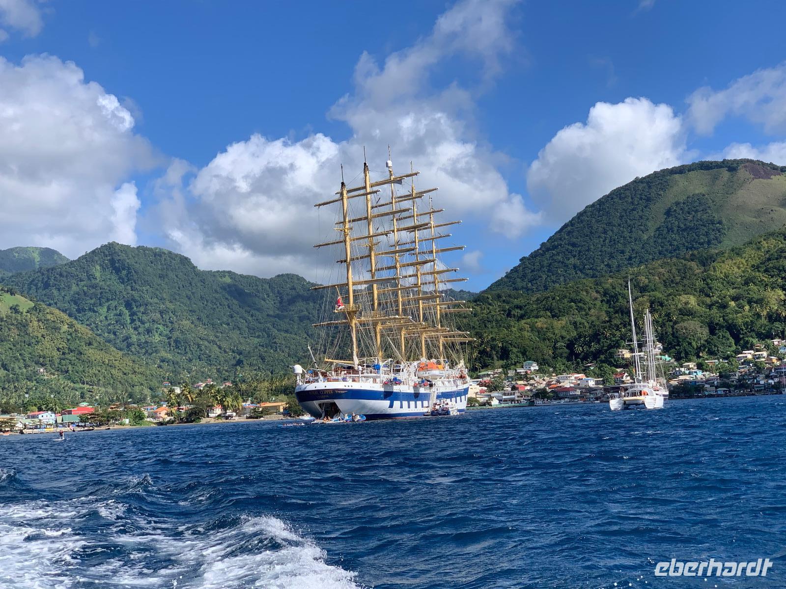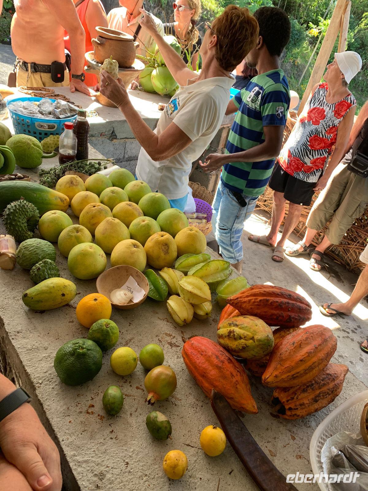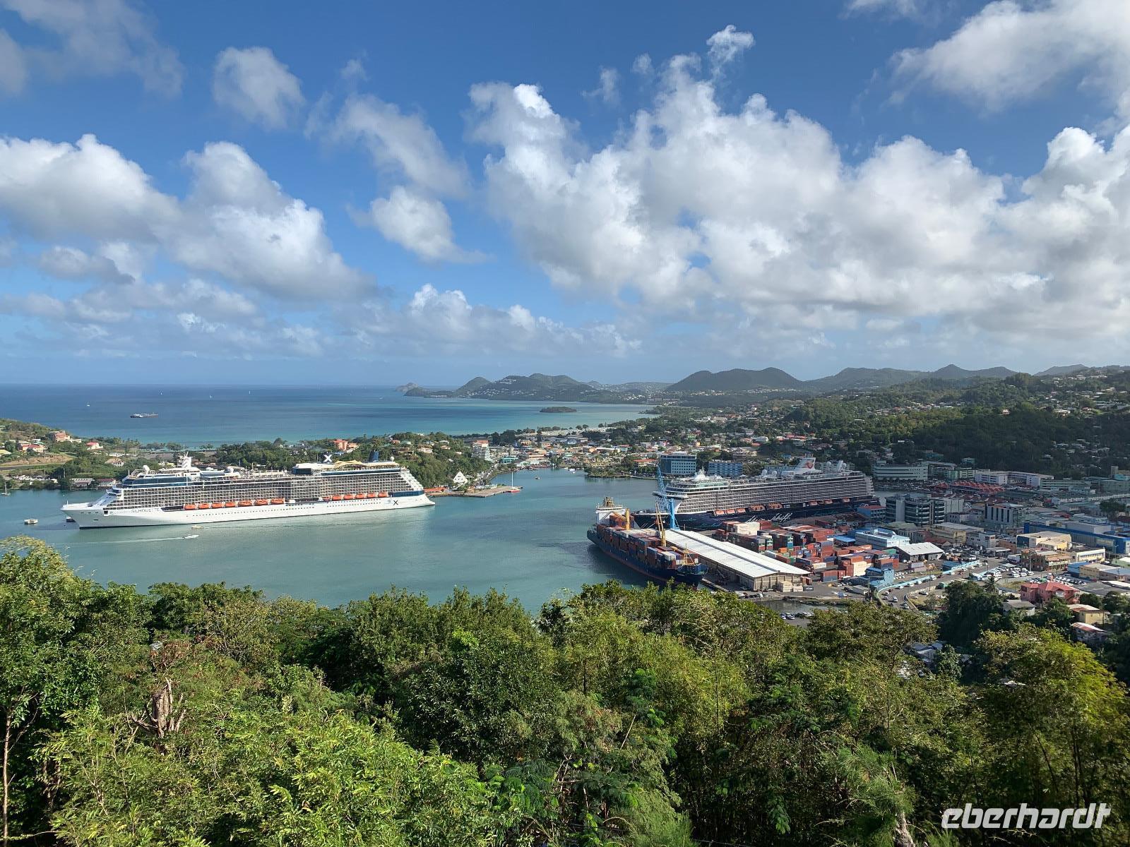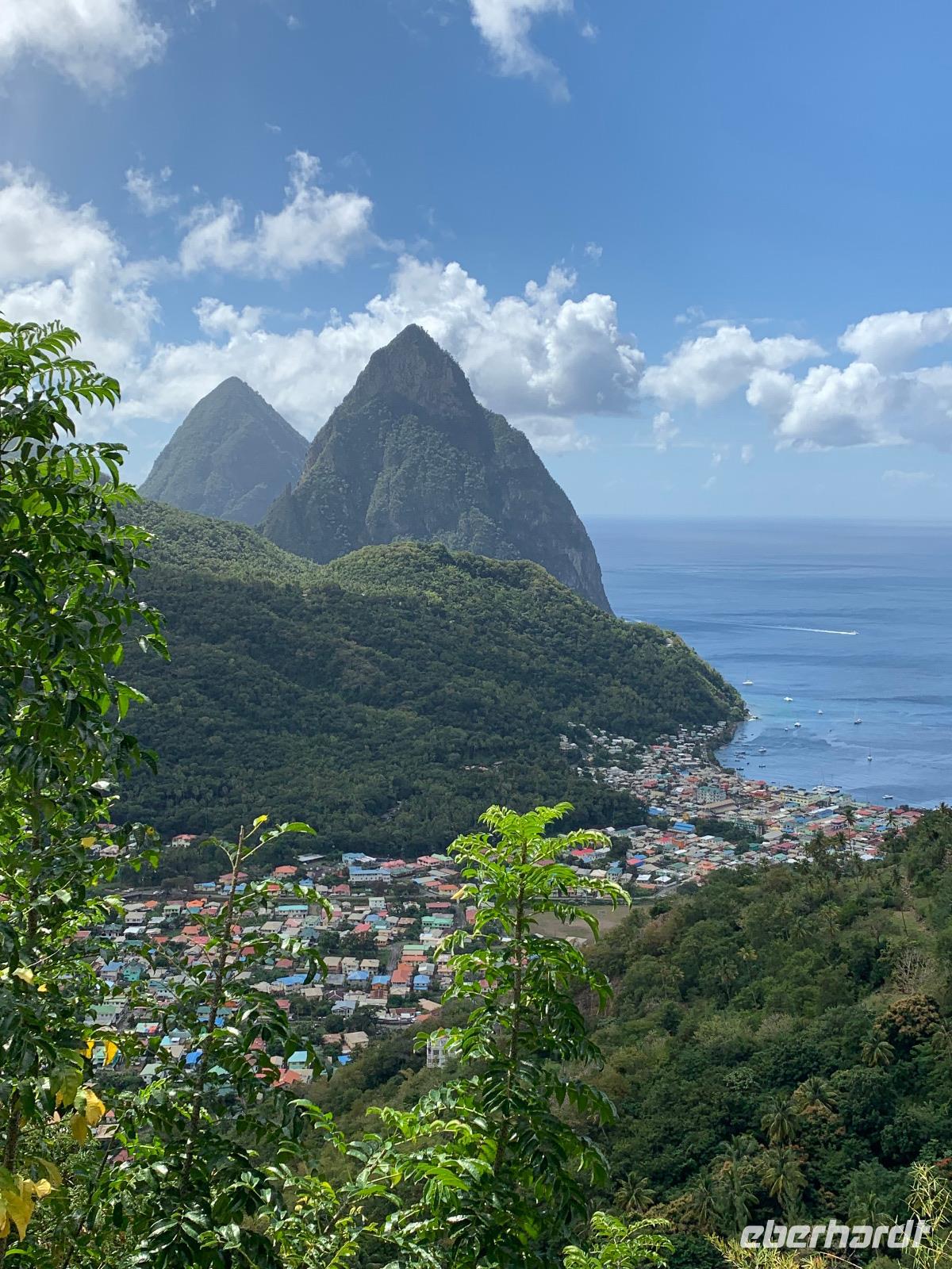 Über Nacht setzten wir nach St. Lucia über, wo wir pünktlich 7.30 Uhr unsere Anker vor der Hauptstadt Castries setzen. Bei unserem Eberhardt-Ganztagesausflug lernen wir die natürliche Vielfalt dieser karibischen Perle kennen. Unsere Reiseleiterin Christiane lebt seit über 10 Jahren auf der Insel und in all ihren Erklärungen hört man die Liebe und Verbundenheit zu ihrer neuen Heimat heraus. Zunächst fahren wir zu einem Aussichtspunkt, von wo wir einen tollen Blick auf unser Schiff im Hafen haben, eingebettet in die hügelige Küstenlandschaft der Bucht. Beim nächsten Stopp eröffnet sich uns der Blick auf die berühmte Marigot-Bay, wo nicht nur zahlreichen Villen prominenter Sternchen stehen, sondern heute auch die Star Clipper vor Anker liegt und ein diesem Foto-Motiv noch das I-Tüpfelchen aufsetzt. Wir fahren durch das alte Fischerdorf Canaries und oberhalb halten wir bei einem kleinen Laden, wo uns Christiane die heimischen exotischen Früchte der Mango- und Bananeninsel zeigt und wir diese sowie leckeres Bananenbrot verkosten dürfen.