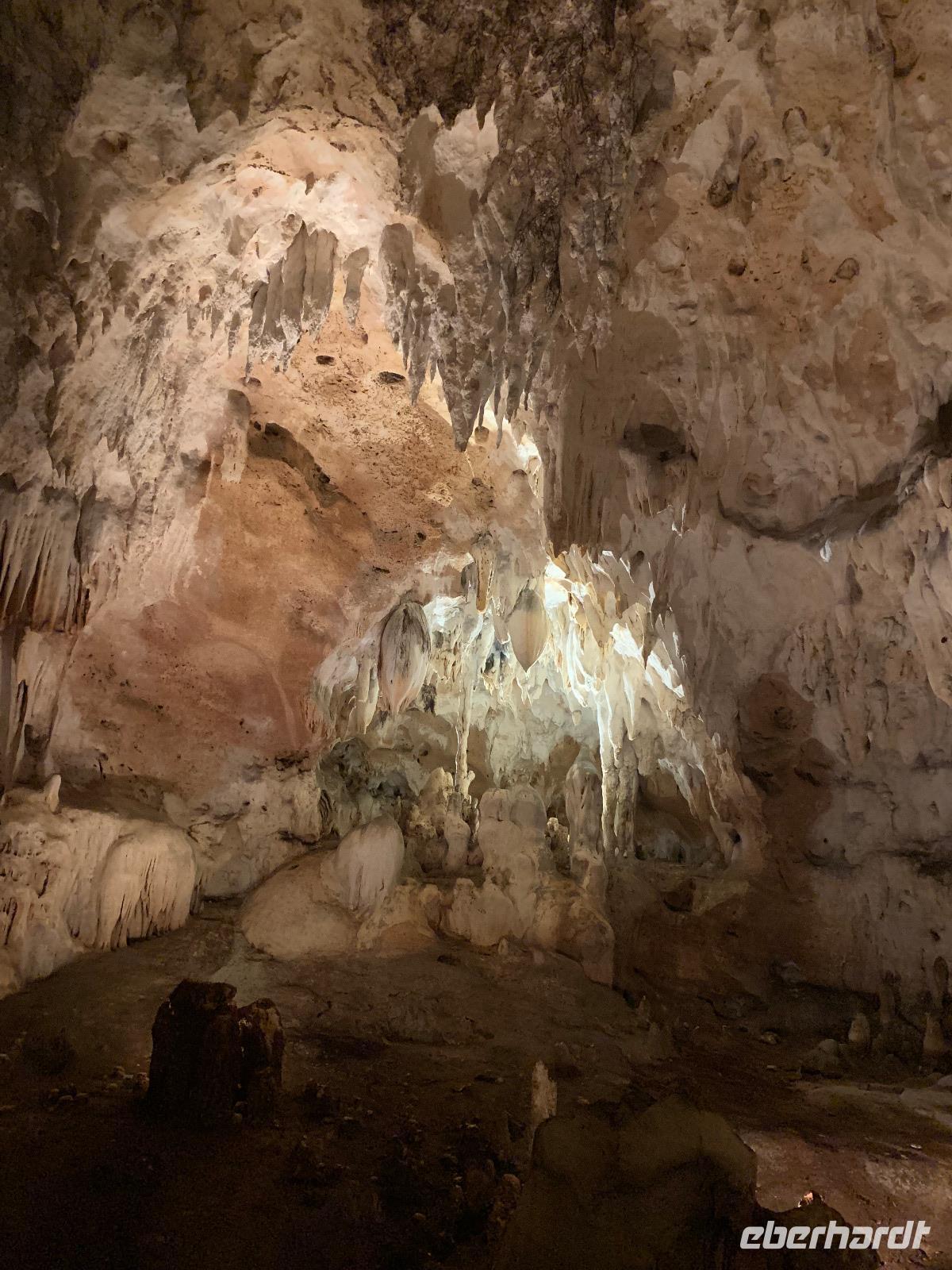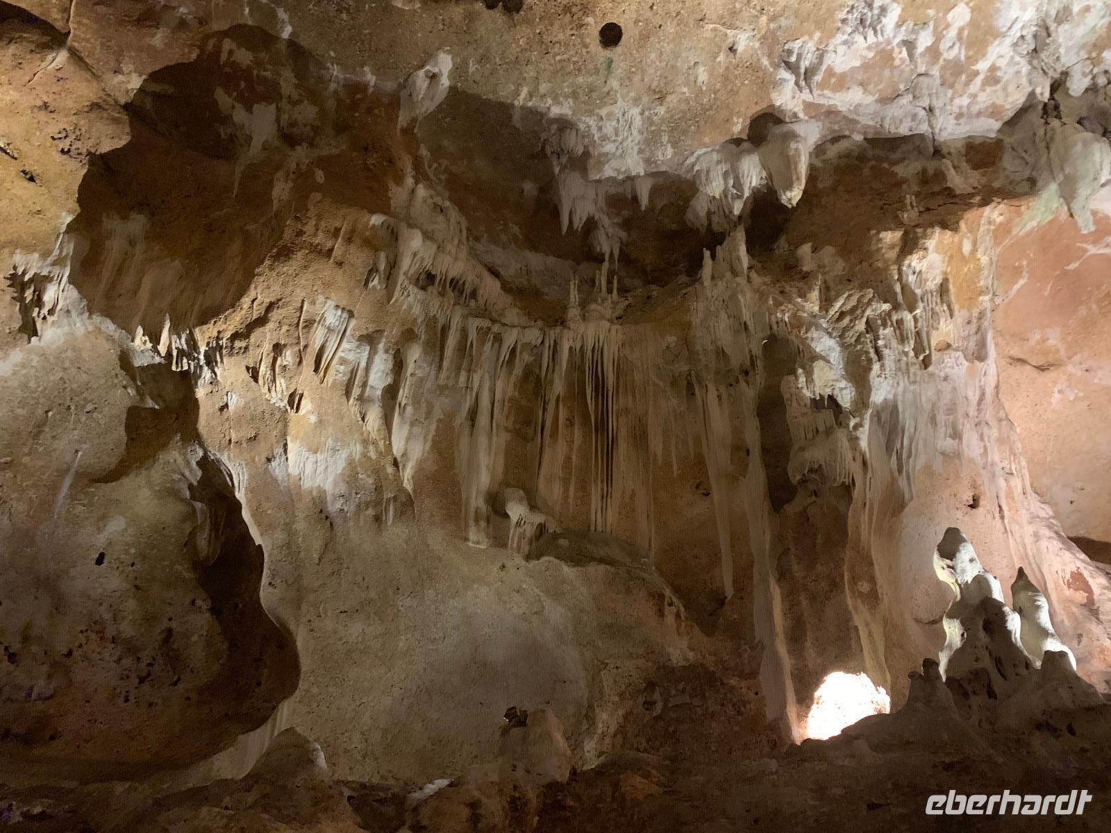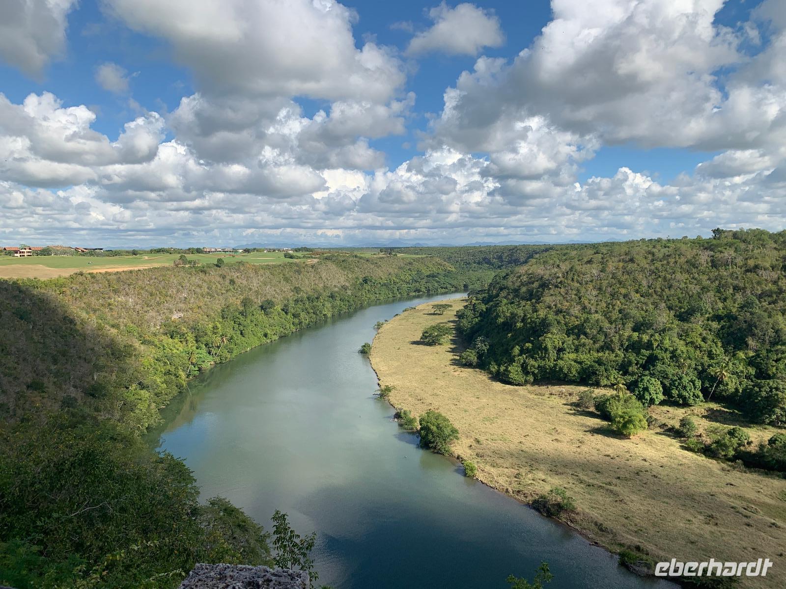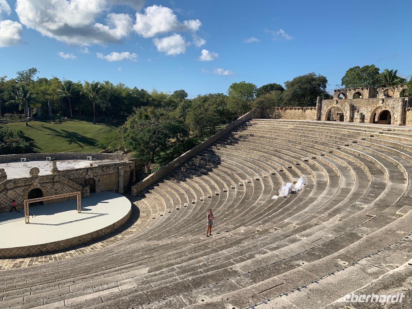 Nach einem reichhaltigen Frühstück im Buffetrestaurant mit exotischen Früchten und zahlreichen frisch gepressten Säften beginnt unser halbtägiger Ausflug mit unserem einheimischen, deutsch sprechenden Reiseleiter José. Wir überqueren bei unserer Busfahrt den Chavon-Fluss und erreichen nach einer halben Stunde das gleichnamige Künstlerdorf Altos de Chavón, welches einer mediterranen Siedlung aus dem 16. Jahrhundert nachempfunden, jedoch erst in den 70er Jahren gebaut wurde. Kunststudenten aus aller Welt studieren hier und können ihrer Kreativität nachgehen. Nach einem kleinen Spaziergang durch die romantischen Gassen und entlang des Pfades der Liebe stehen wir vor dem eindrucksvollen Amphitheater im römischen Stil, welches Platz für 5000 Besucher bietet und regelmäßig für klassische Konzerte genutzt wird. Wir schauen uns die Sammlung und die leuchtend blauen Larimar-Schmucksteine im kleinen Museum an und gehen vorbei an der Kirche Iglesia San Estanislao zurück zum Bus. Nach einer kurzen Fahrt folgt der Besuch der Tropfsteinhöhle Cueva de las Maravillas - Höhle der Wunder, die mit mystischer Beleuchtung und toller Akustik beeindruckt. Bei einem Rundgang genießen wir den Anblick der unterirdischen Welt aus Stalagmiten und Stalagtiten und unser örtlicher Guide Alexis mit schweizerischen Wurzeln zeigt uns die verschiedenen Wandmalereien der Tainos, die die Geschichte der Ureinwohner vor hunderten von Jahren widerspiegelt.