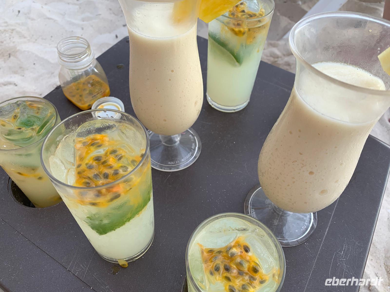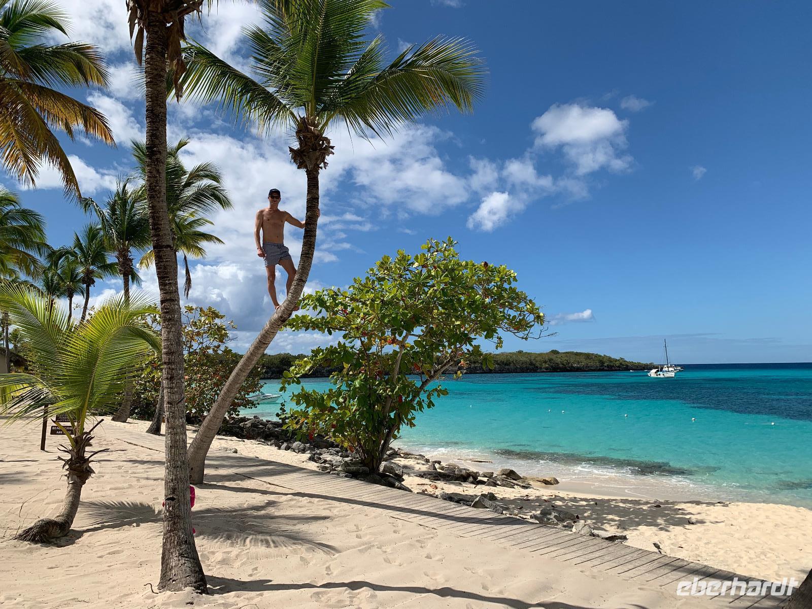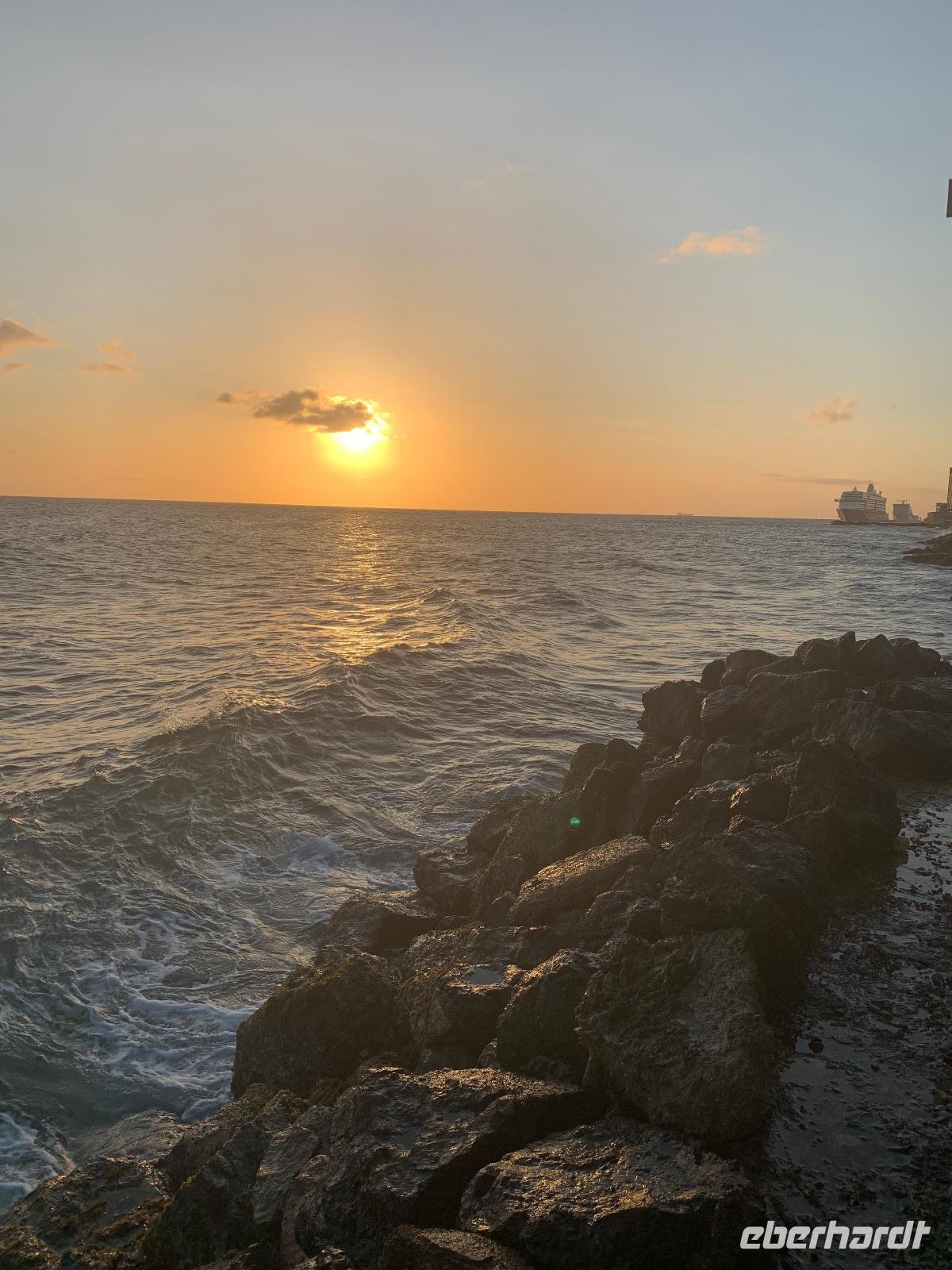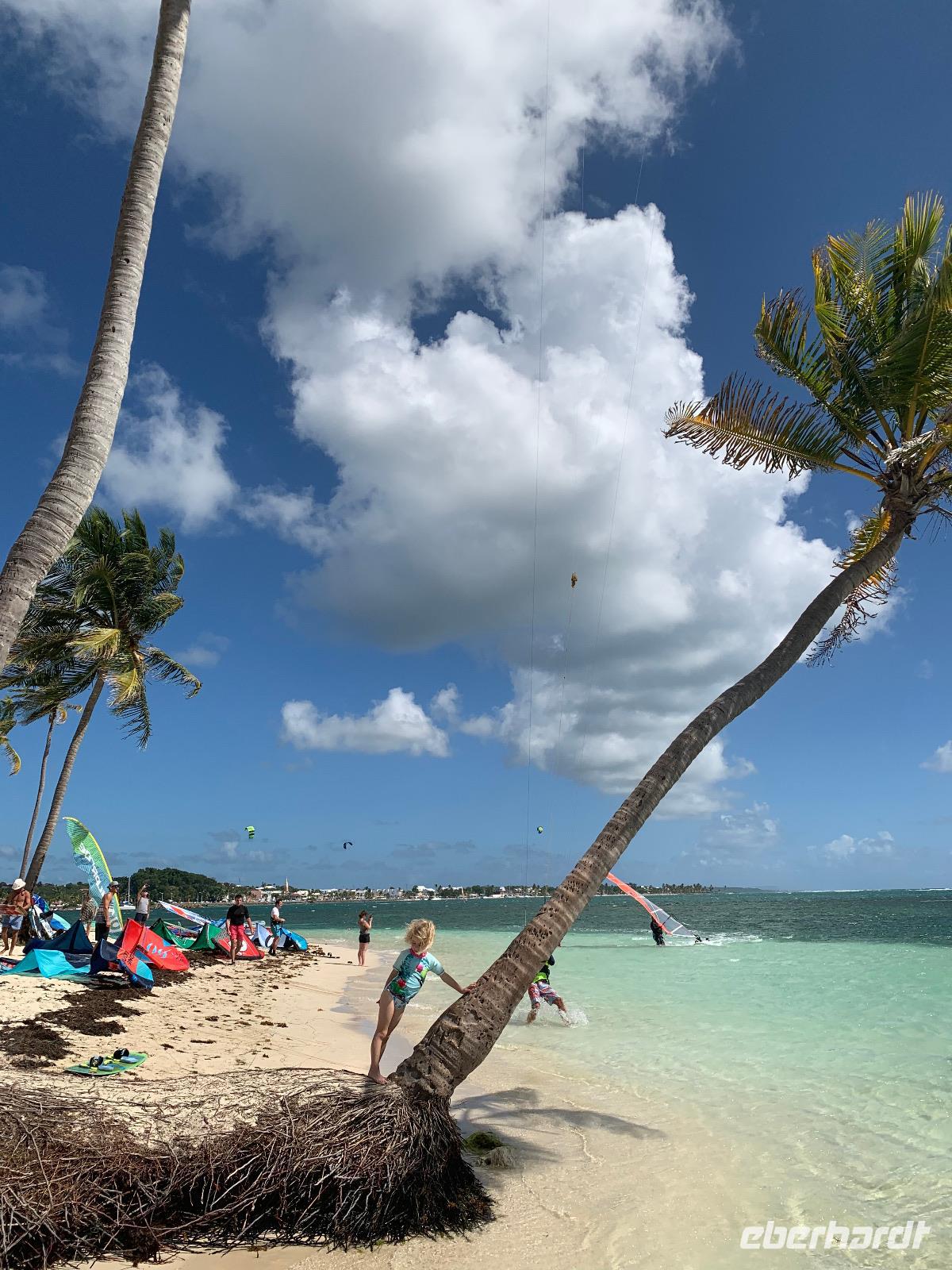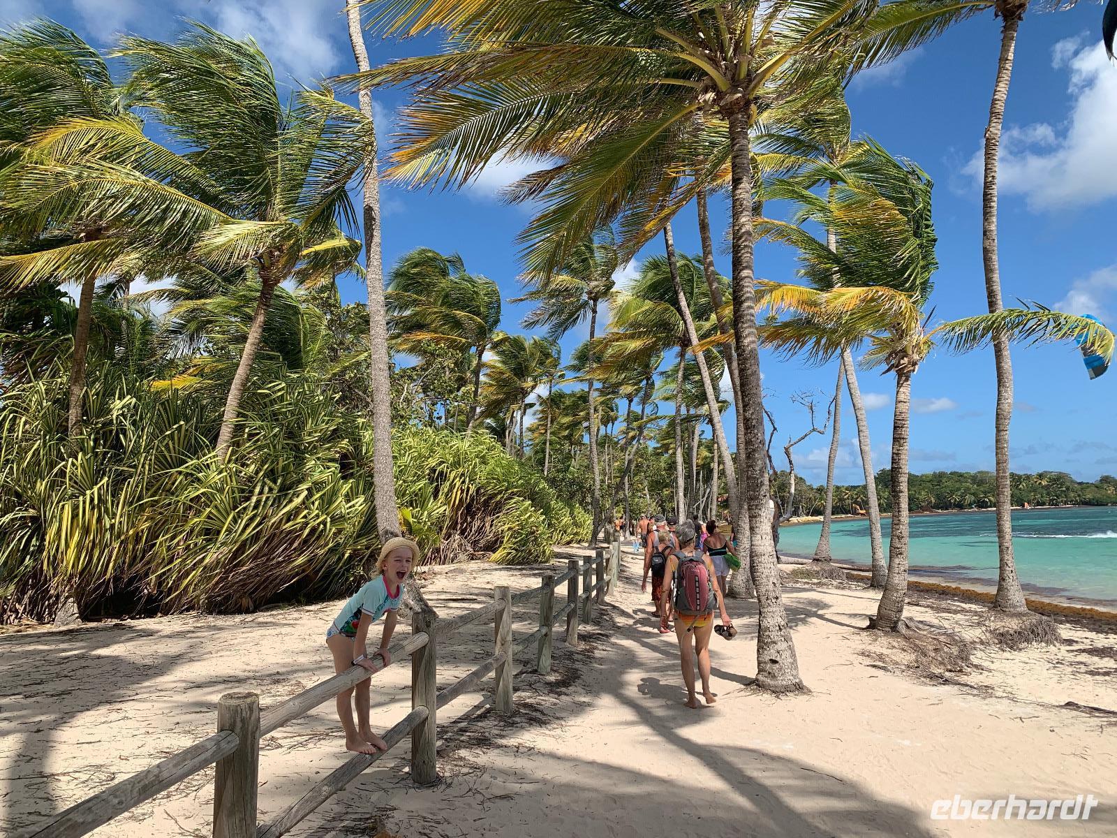 Am Mittag bringt uns der Bus zurück zur Hotelanlage, wo uns ein köstliches Mittagsbuffet erwartet. Gegrilltes Hähnchen, frischen Fisch, frittierte Yuca, gebackene Bananen, karibische Salate und vieles mehr lassen wir uns schmecken. Den Nachmittag lassen die meisten entspannt am Strand mit leckeren Getränken von der Strandbar oder bei einem Spaziergang durch die schöne Hotelanlage ausklingen. Es ist leicht bewölkt und die Sonne gibt uns Zeit, sich an diese Extraportion Vitamin D langsam zu gewöhnen. Wir gehen mit dem Meer auf „Tuchfühlung" - unserem Wegbegleiter Nummer 1 für die nächsten zwei Wochen!