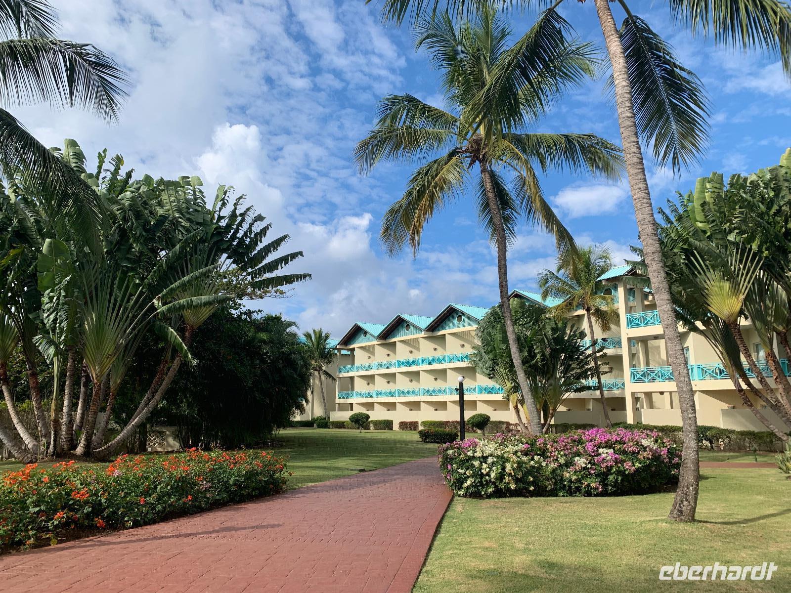 Nach einem kleinen Begrüßungssekt checken wir schnell ein und beziehen unsere großzügigen Zimmer in der weitläufigen Hotelanlage. Nun lassen wir uns nach der langen Anreise das karibische Buffet im Hauptrestaurant schmecken. Wer noch nicht zu müde ist, genießt noch das abendliche Unterhaltungsprogramm am Pool bei einem tropischen Absacker und lässt den ersten Abend bei angenehmen abendlichen Temperaturen um 22 Grad Celsius ausklingen.