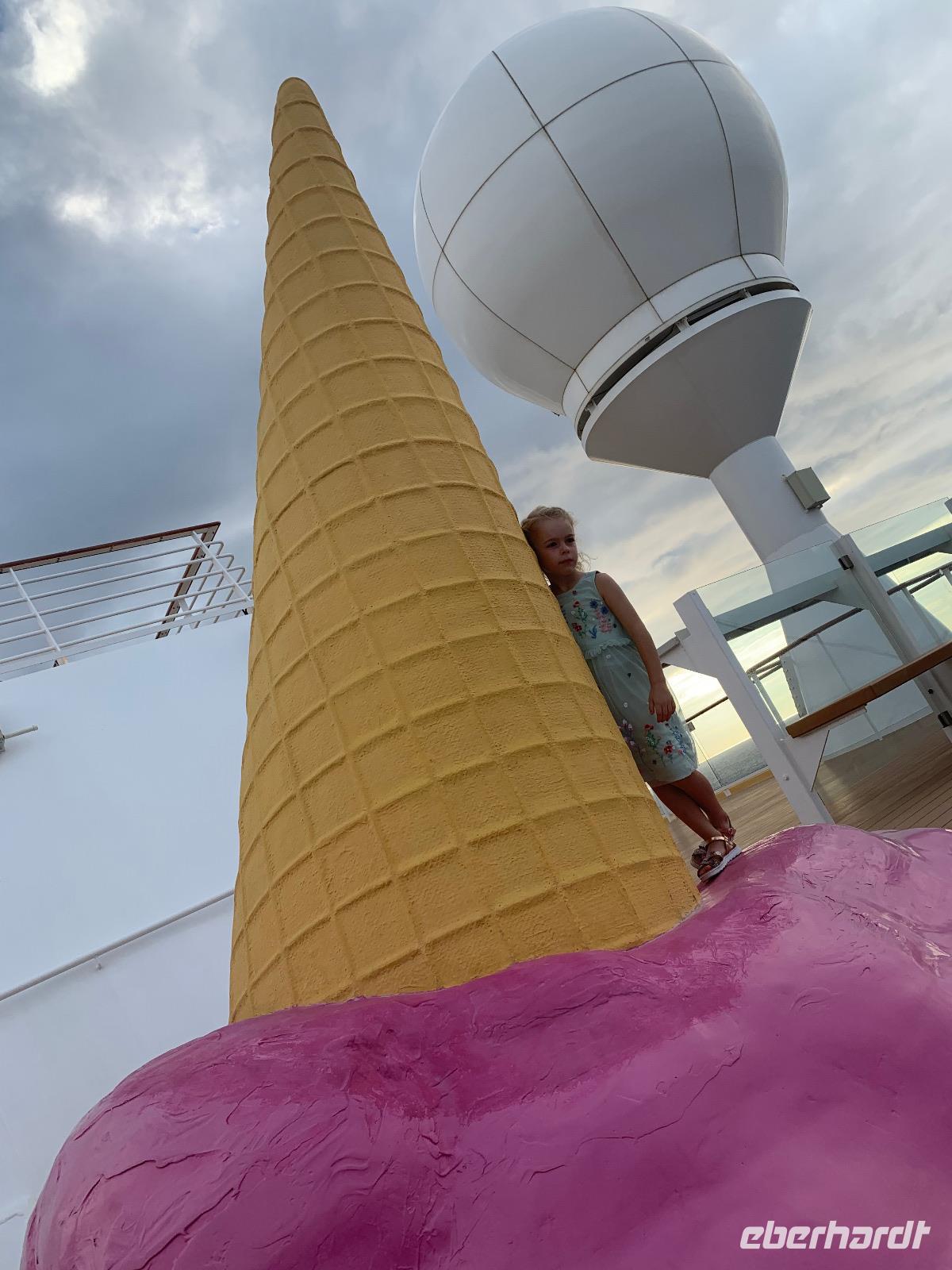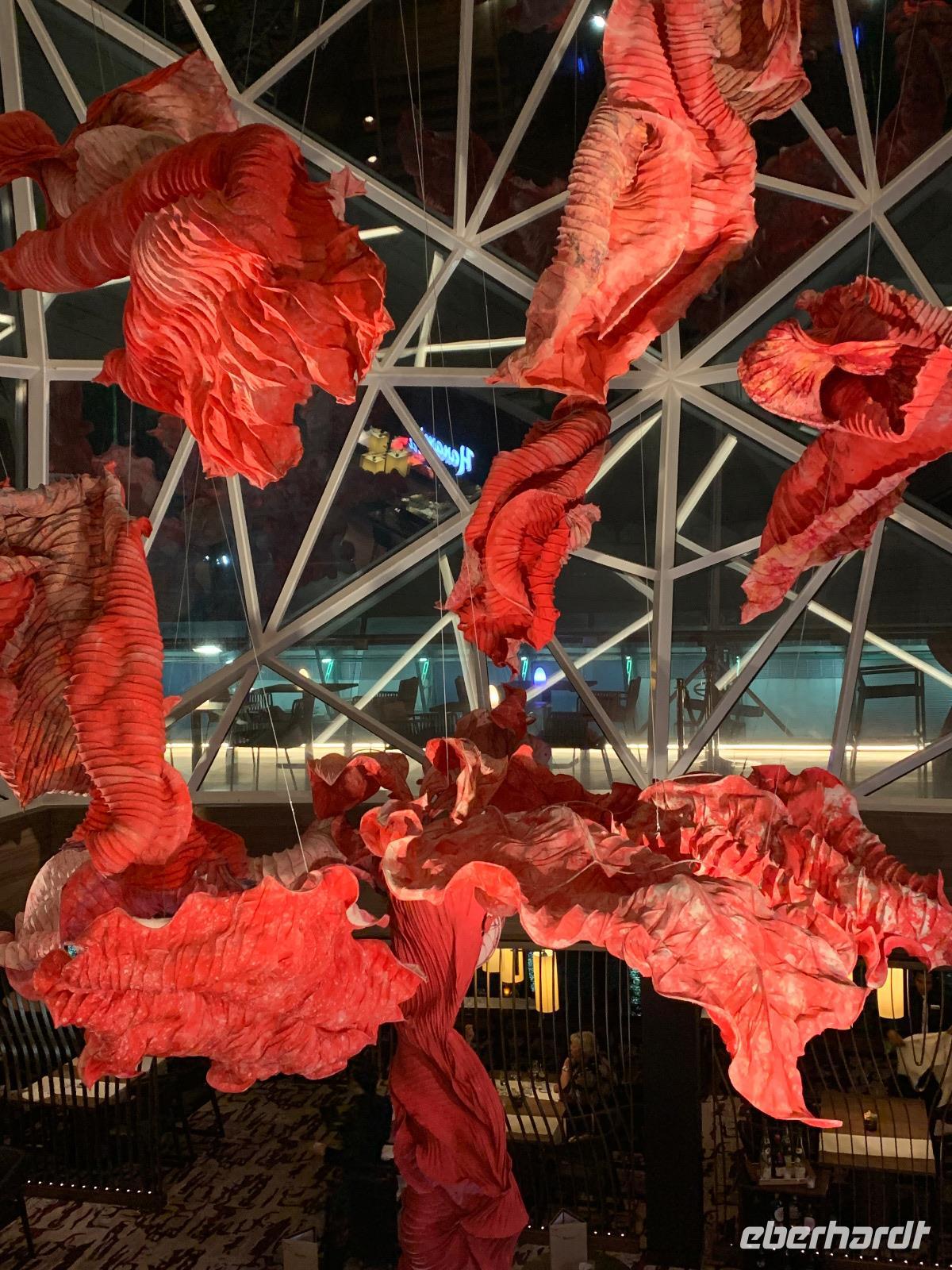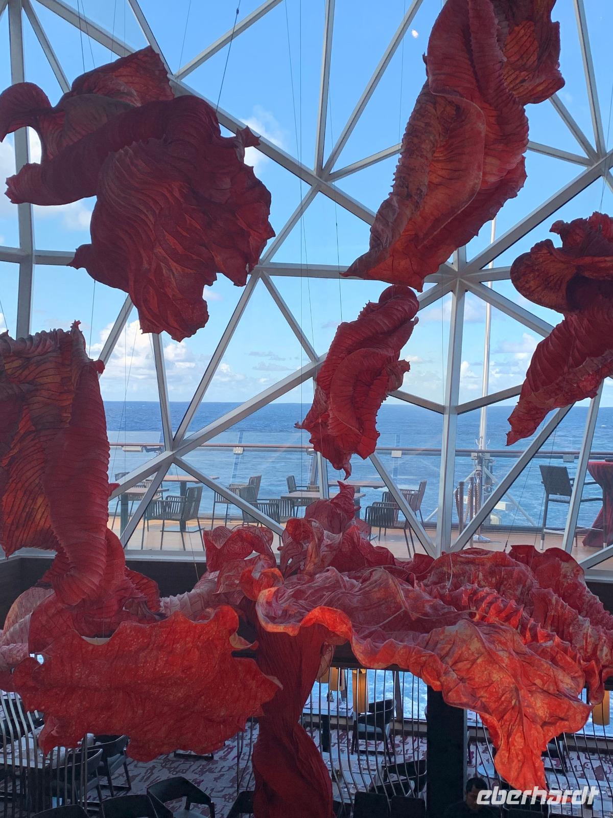 10.30 Uhr startet unser exklusiver Schiffsrundgang mit einem Gläschen Sekt an der LUMAS-Bar auf Deck 4 mit Daniela aus der Schweiz, eine der Rezeptionistinnen an Bord, die uns anderhalb Stunden die wichtigsten öffentlichen Bereiche des Schiffes zeigt. Wir staunen das ein oder andere Mal über die wohl designte Welt dieses schwimmenden Hotels: Ob es der gläserne „Blaue Balkon" auf Deck 14 ist oder der Diamant im Heck des Schiffes mit seinen Spezialitäten-Restaurants und -Bars.