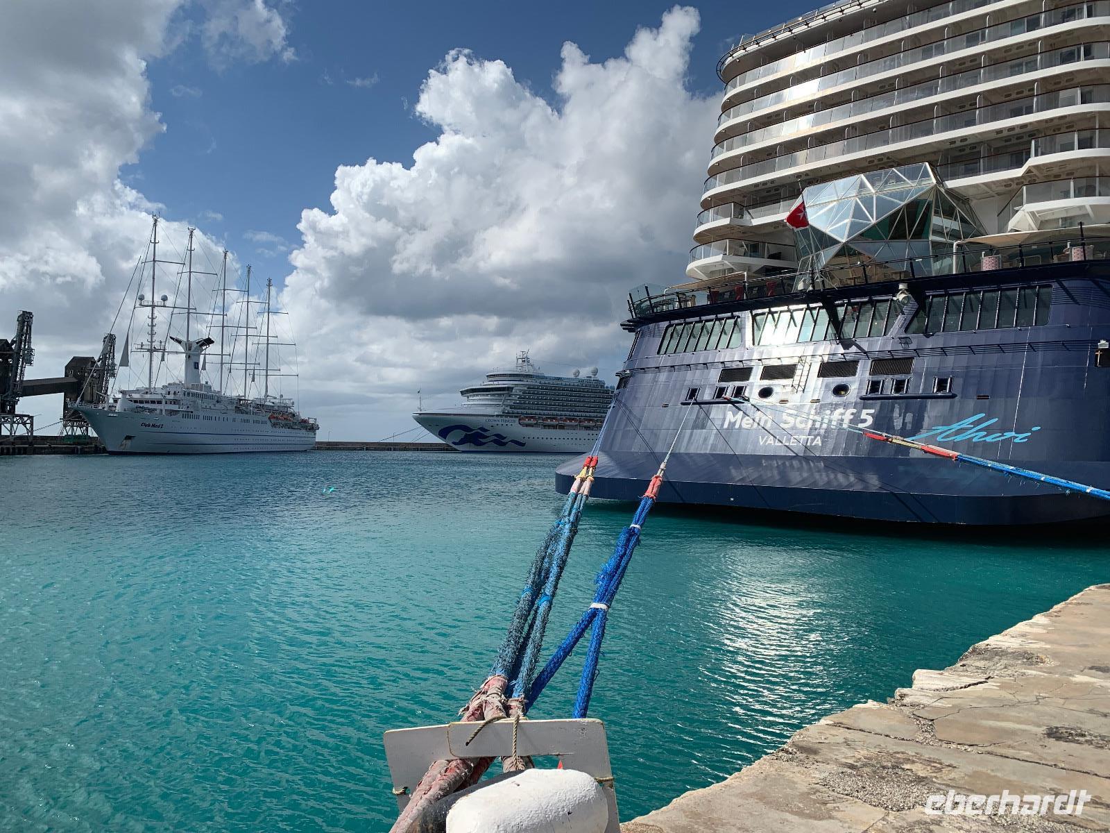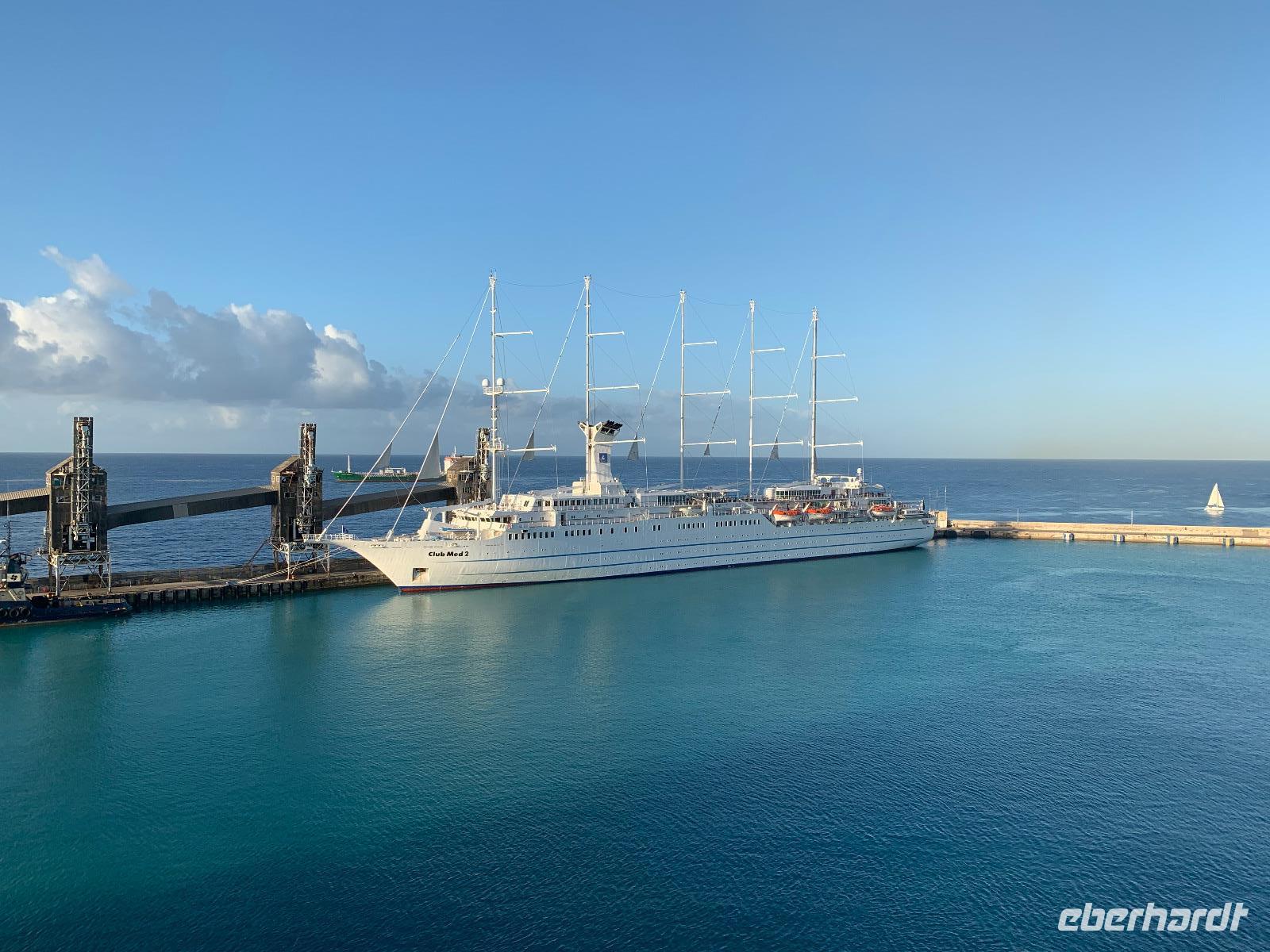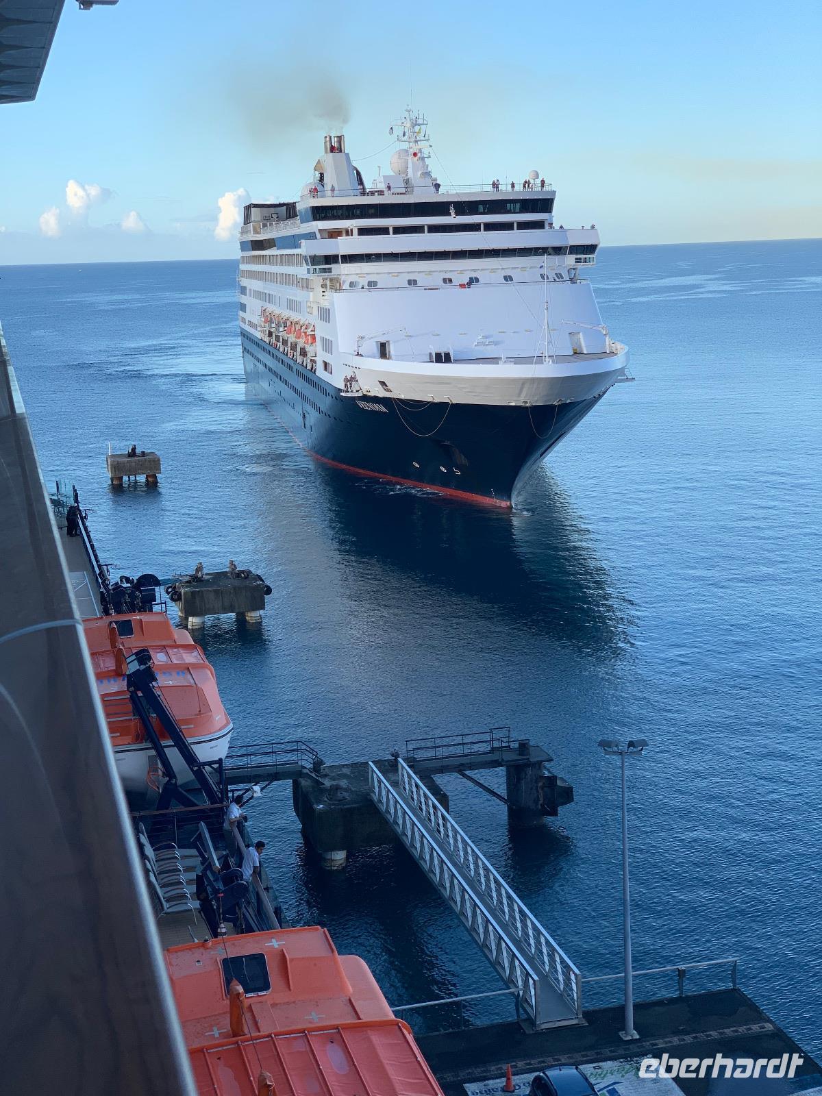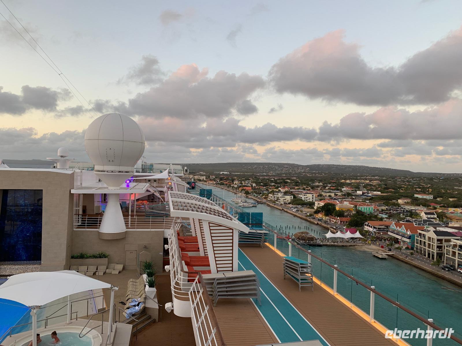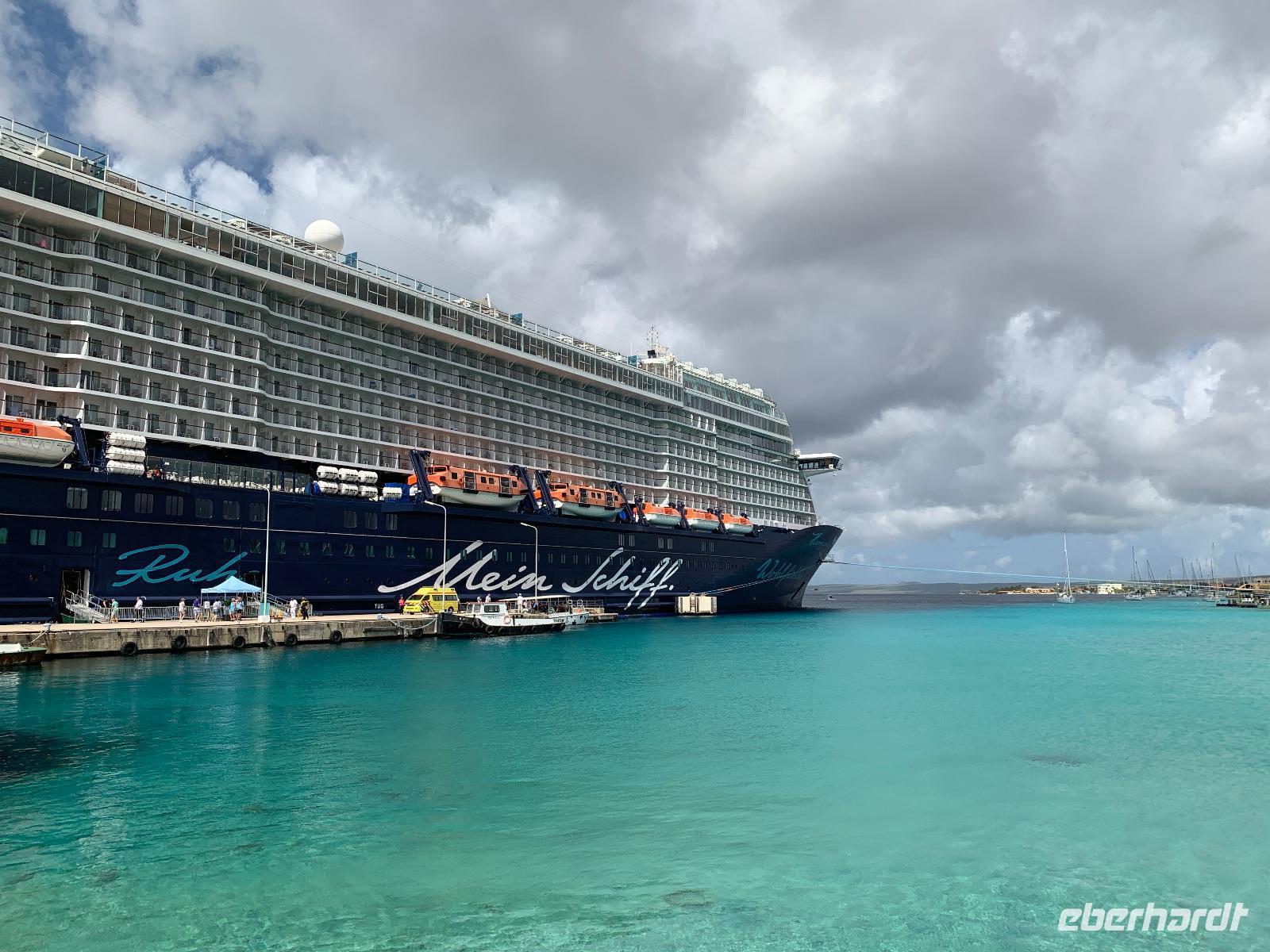 Die Mein Schiff 5 liegt direkt vor dem quirligen Zentrum von Oranjestad mit seinen farbenfrohen Kolonialbauten im alten holländischen Stil. Zwei weitere Schiffe liegen heute mit uns im Hafen, unter anderem das Scientology-Schiff Freewinds, welches auch entsprechend auch uns deutsche Passagiere vor dem Hafen mit Werbung versorgt.