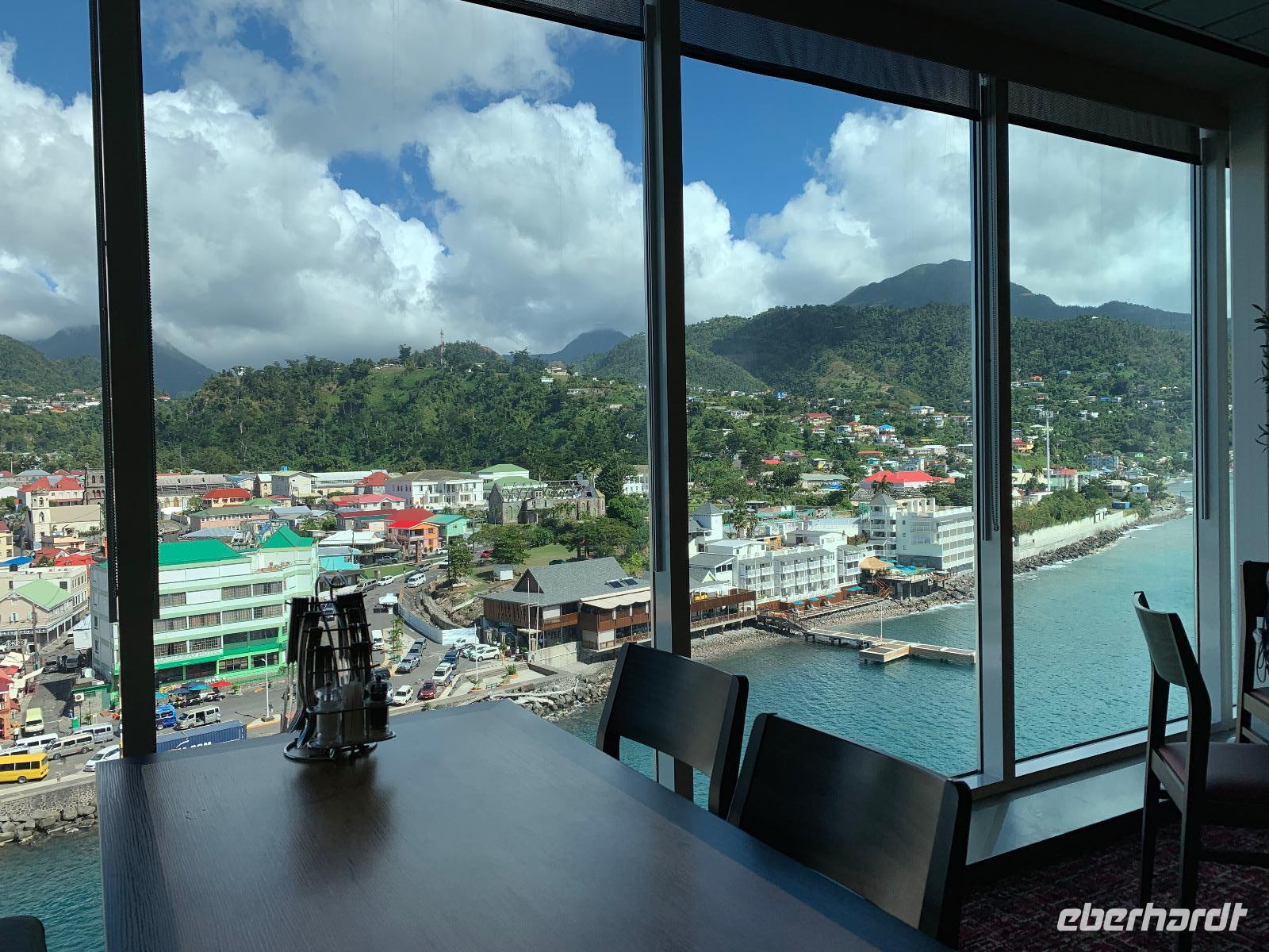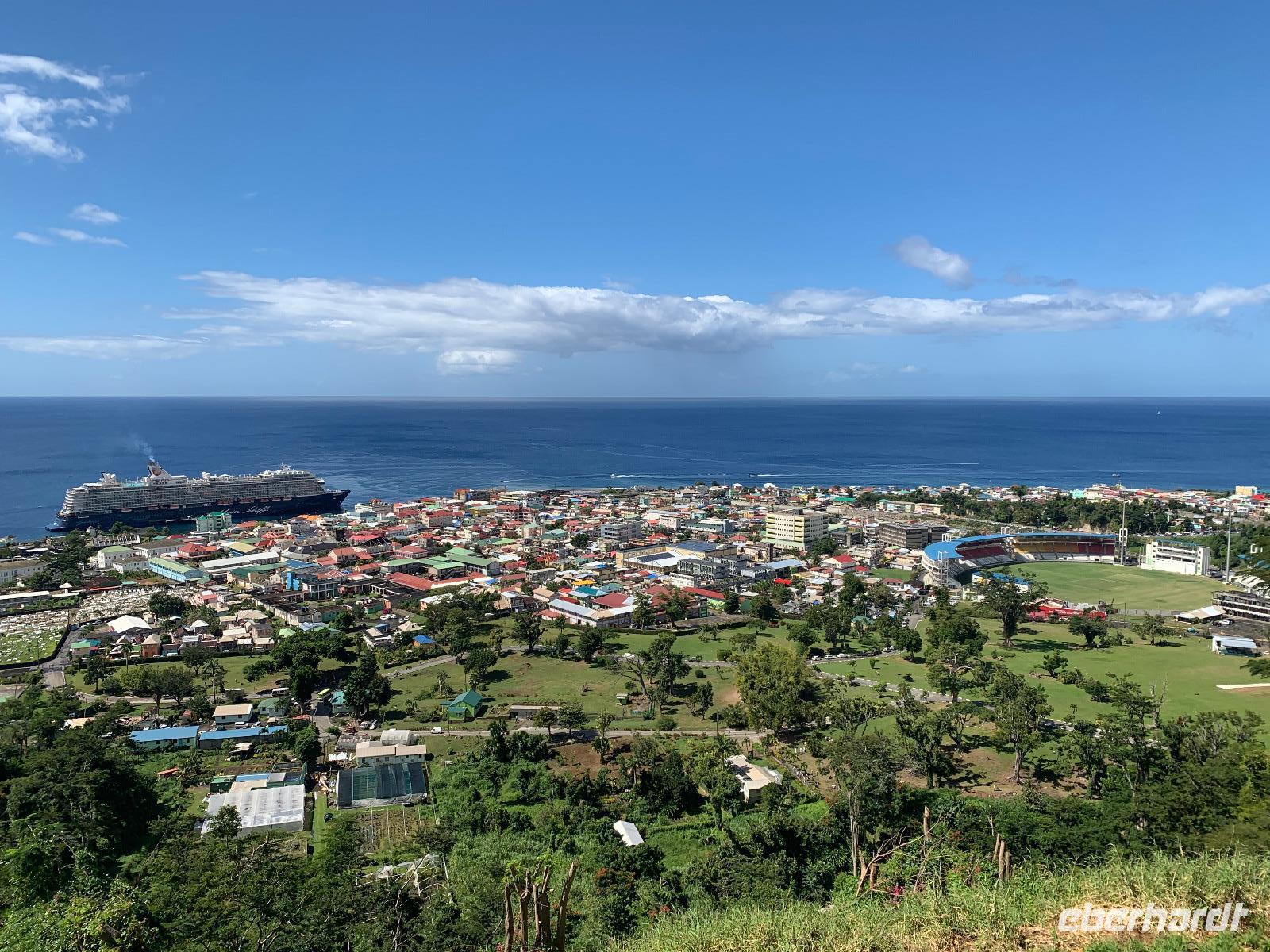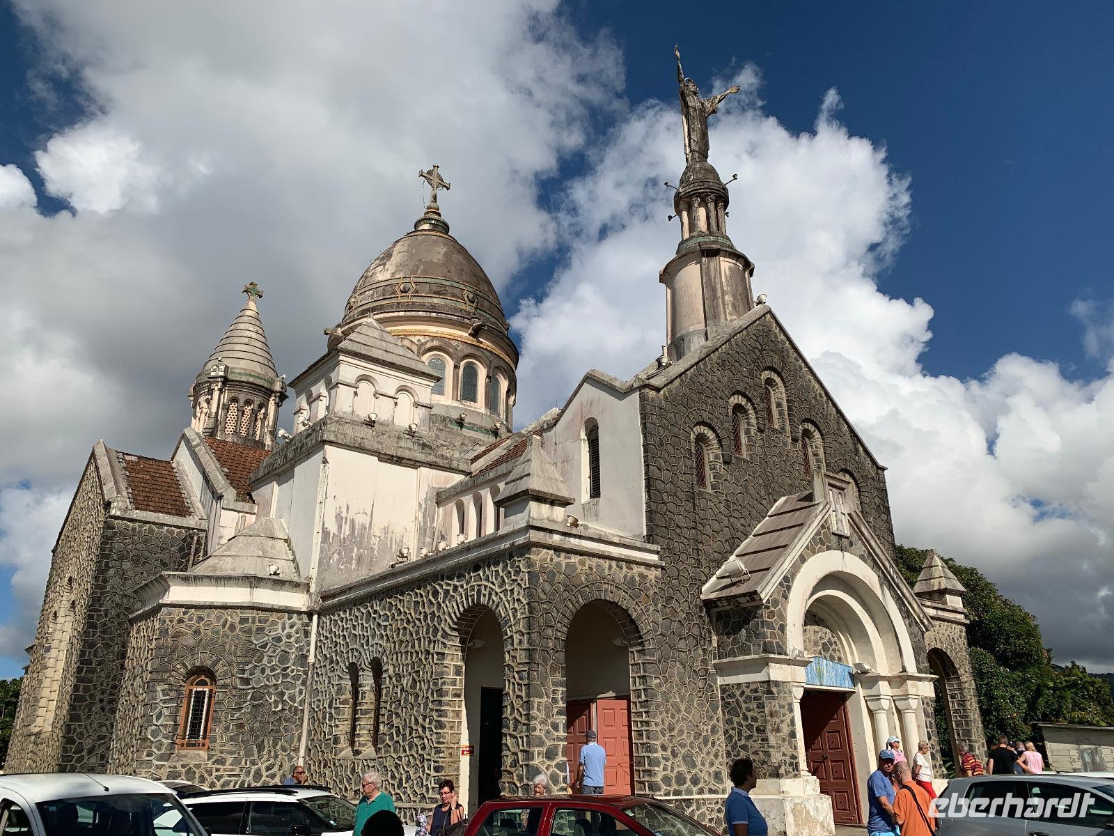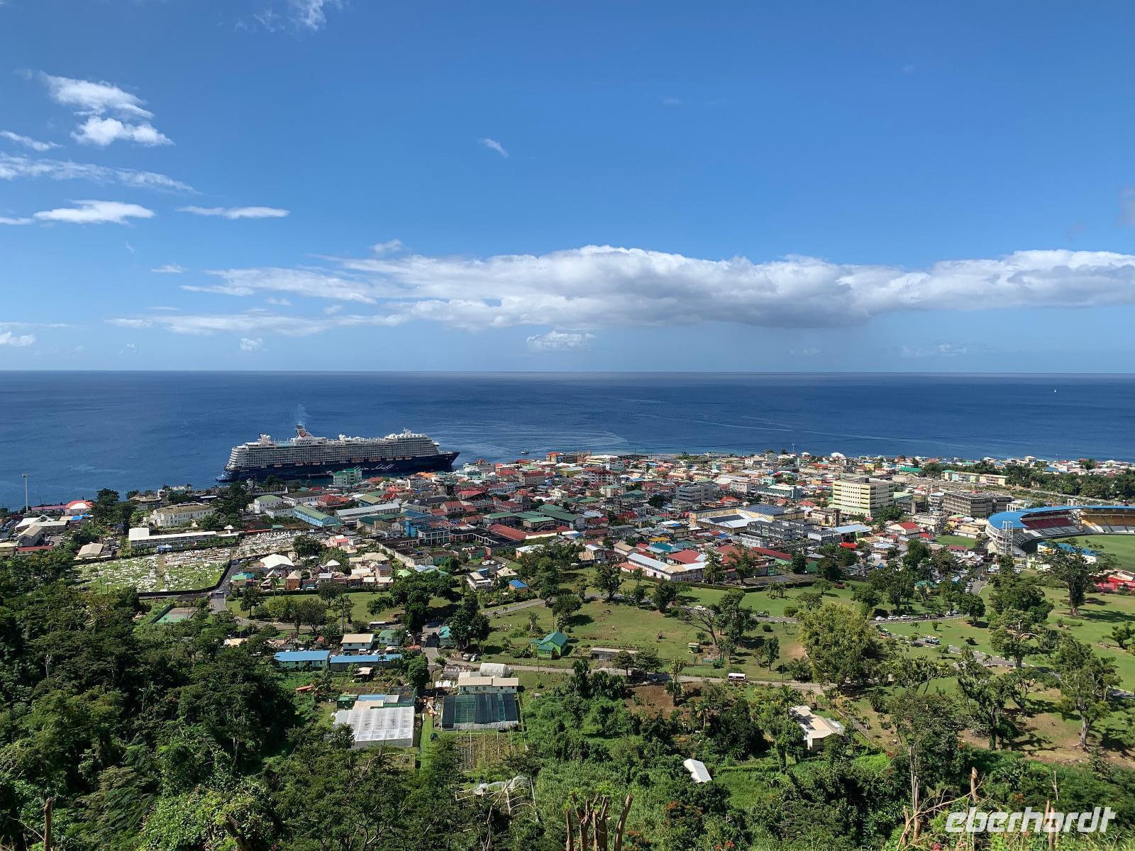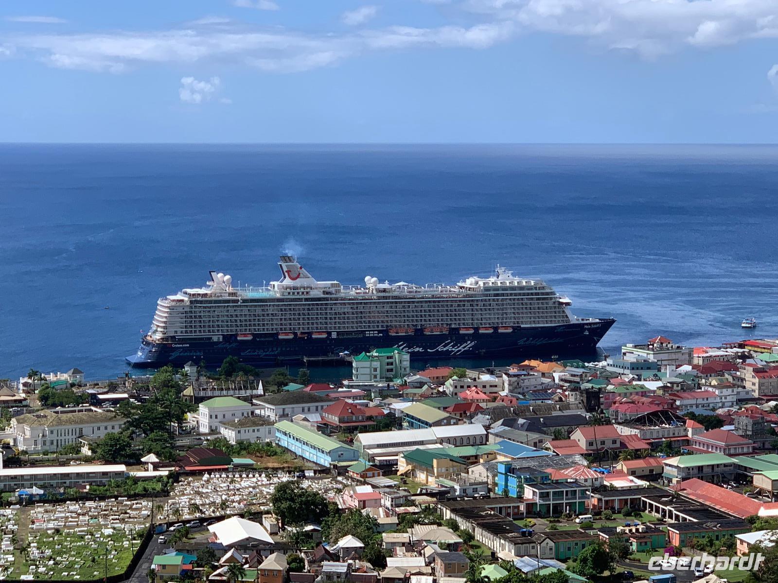 Am Vormittag starten wir unseren Mein Schiff-Ausflug mit dem örtlichen, deutsch sprechenden Reiseleiter Laurent. Erster Stopp ist an der Balata-Kirche, vor der reges Treiben der Einheimischen herrscht, denn der sonntägliche Gottesdienst beginnt gleich. Von hier oben haben wir auch einen herrlichen Panoramablick über die Insel bis hin nach Fort de France zur Mein Schiff 5.
