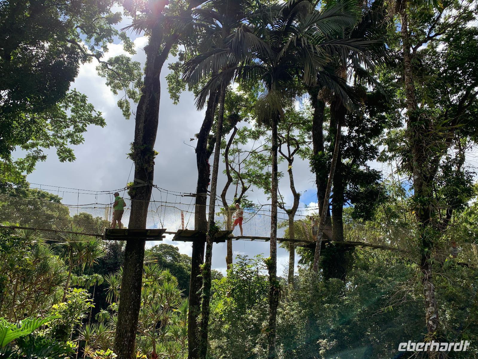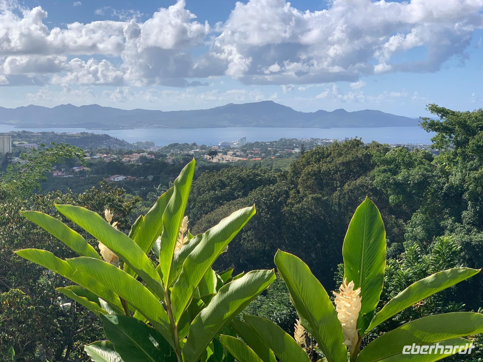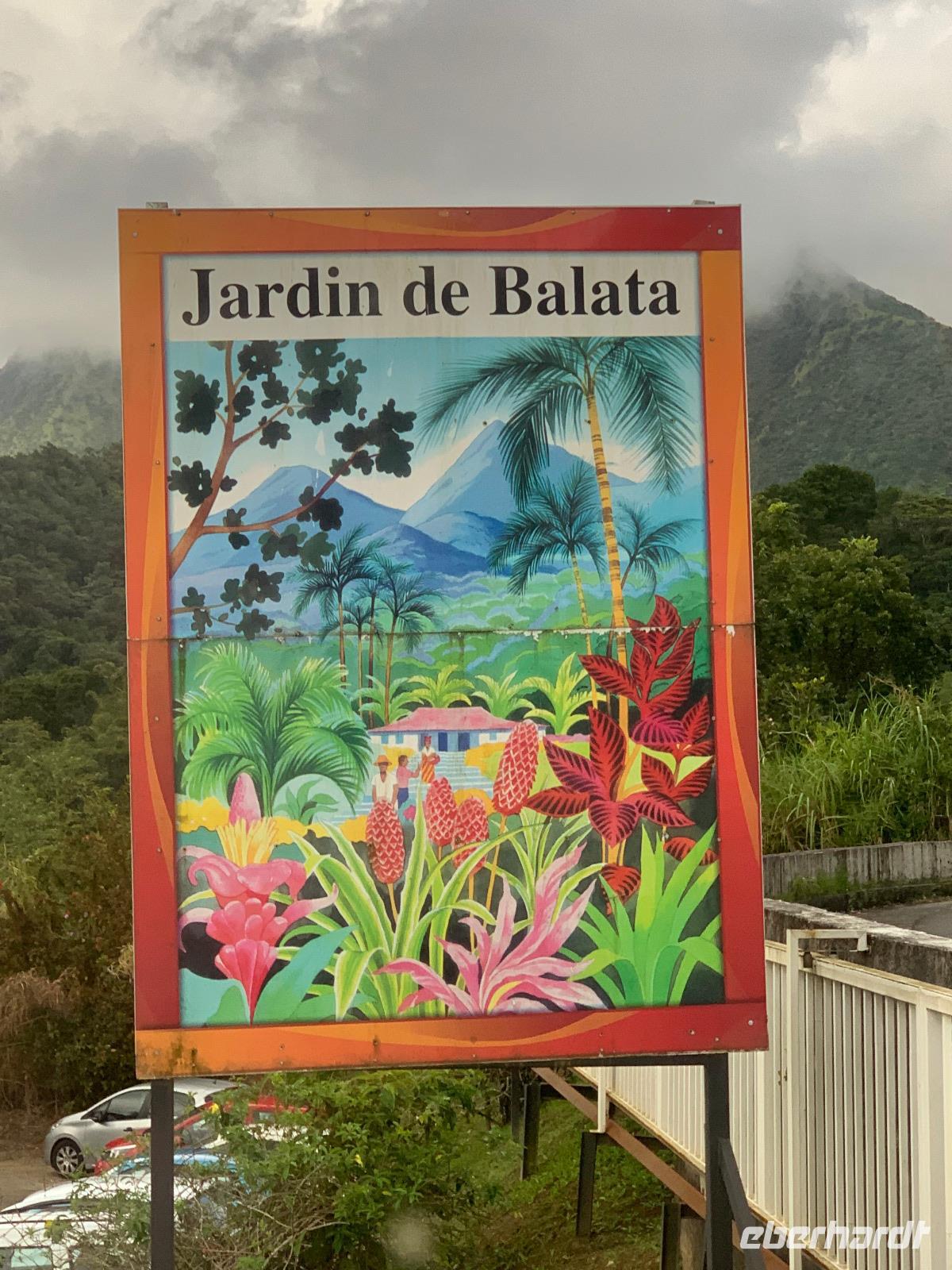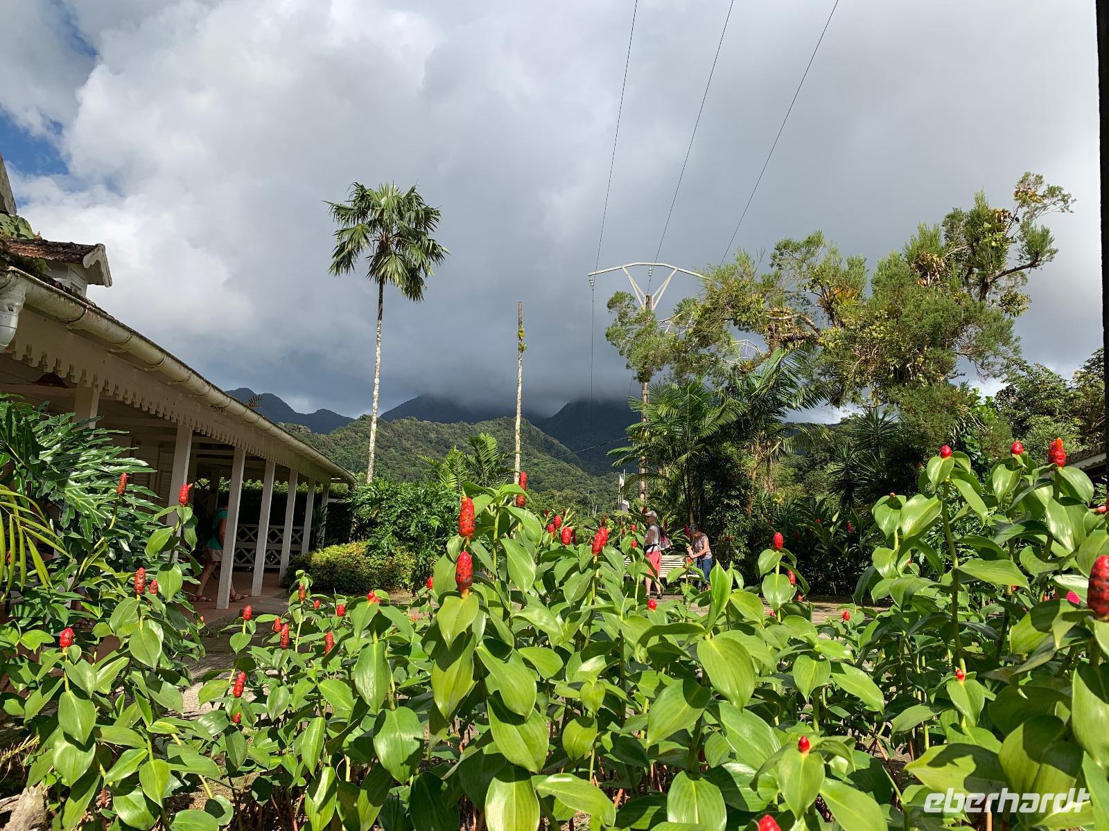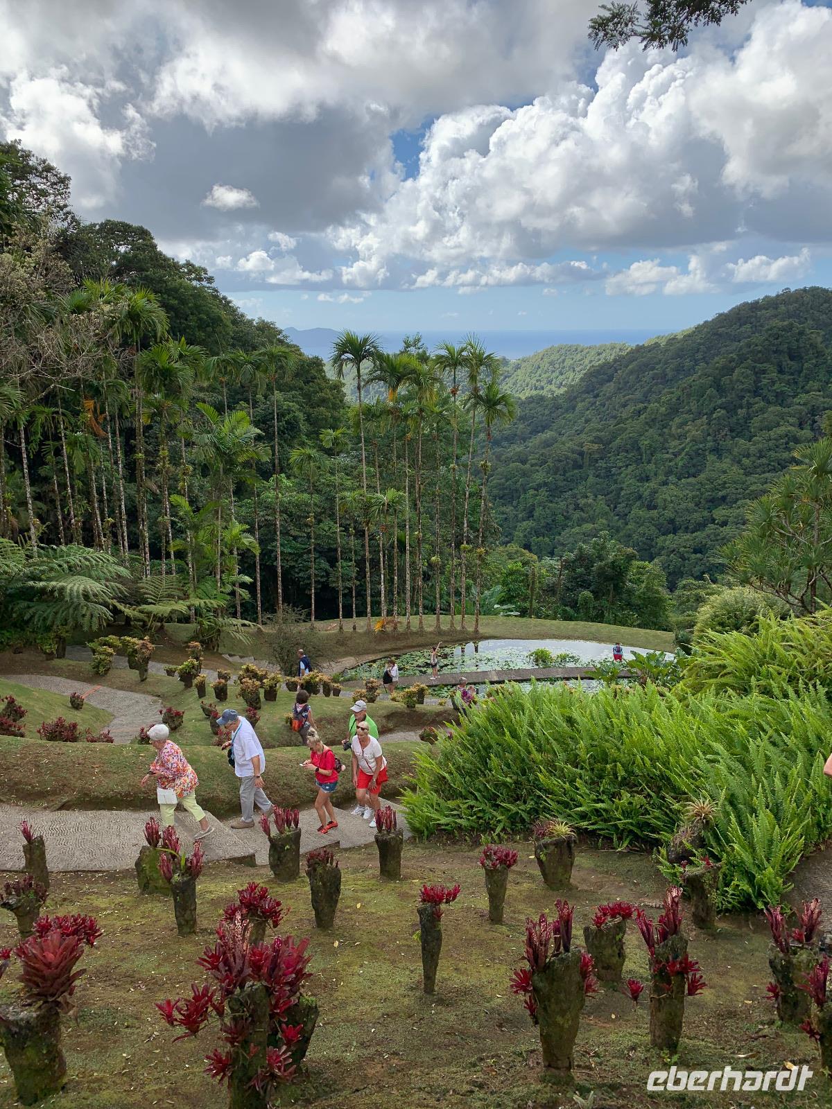 Weiter geht die Fahrt zum Balata-Garten, wo wir entlang eines befestigten Pfades alle tropischen Pflanzen in ihrer exotischen Farbenpracht und Vielfalt bestaunen können. Die Mutigen können über eine abenteuerliche Hängebrücke zwischen den Baumkronen laufen und werden mit einem herrlichen Ausblick von oben belohnt. Am Eingang kann man das rege Treiben der flinken Kolibris beobachten, die von den Wassertränken angelockt werden. Bevor wir in den Bus einsteigen, werden wir von ein wenig „liquid sunshine" überrascht. Aber dieser kleine tropische Regenguss stört bei den heißen Temperaturen nicht wirklich.