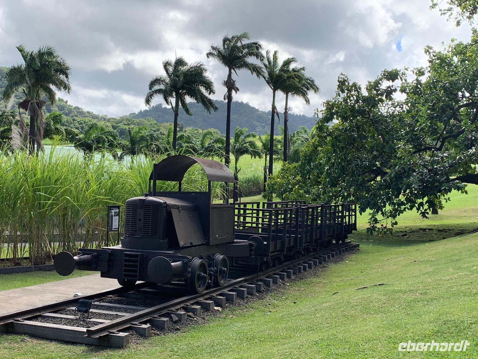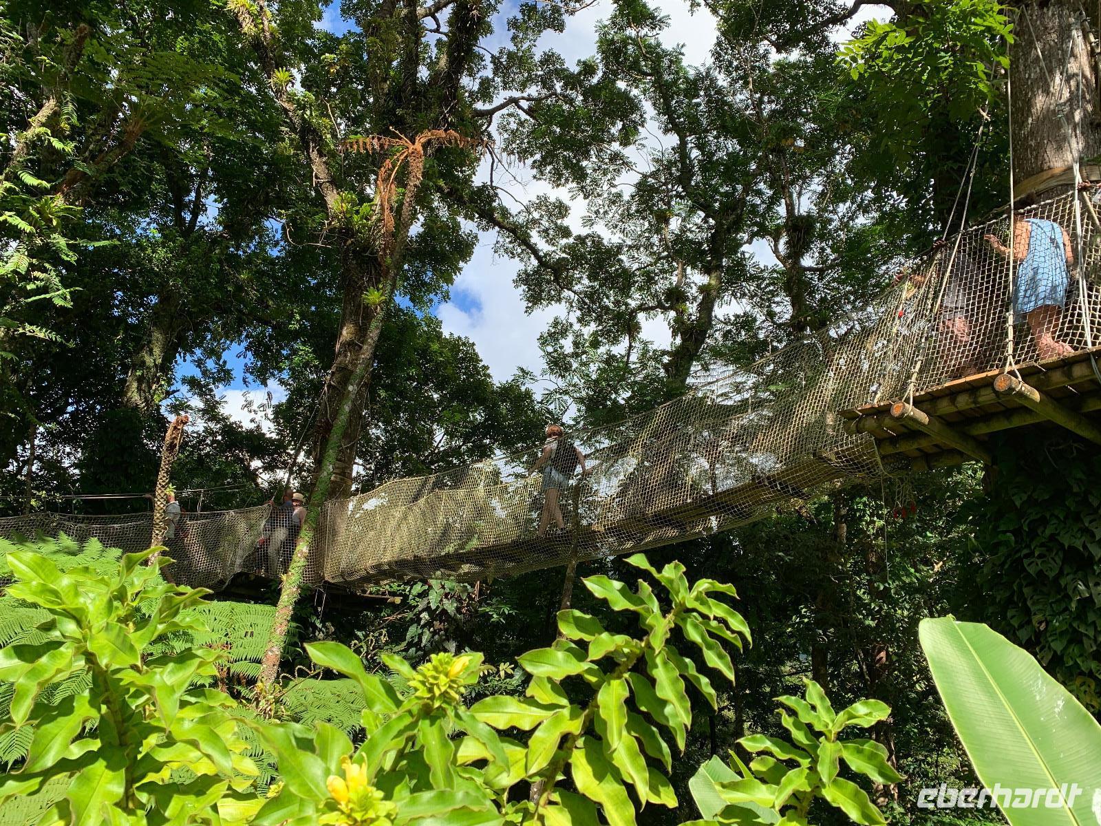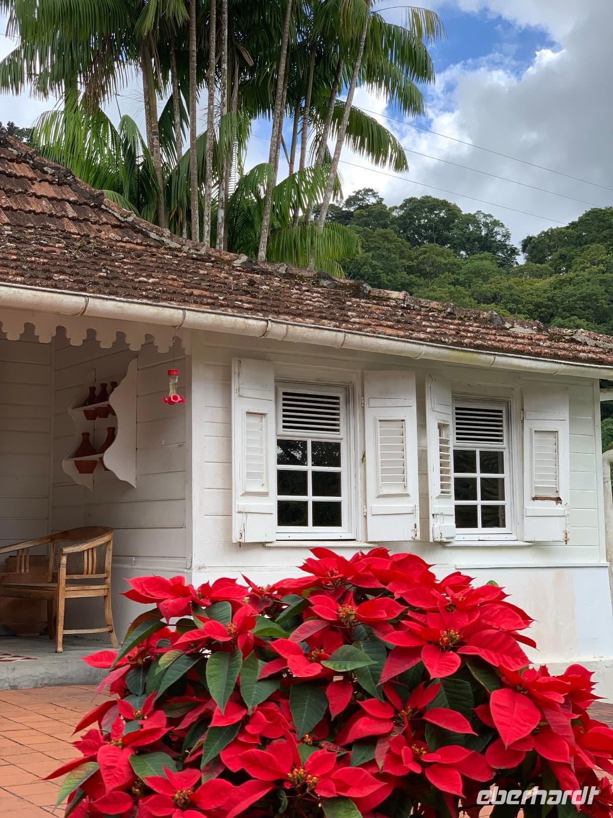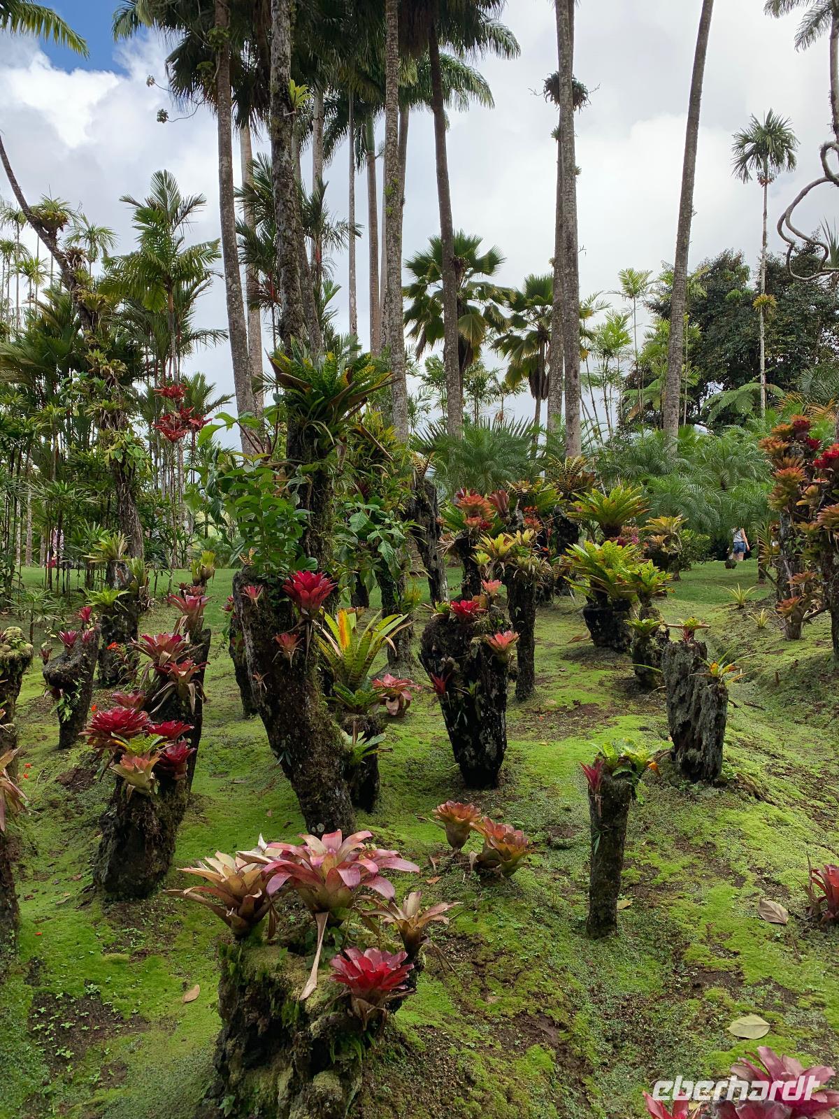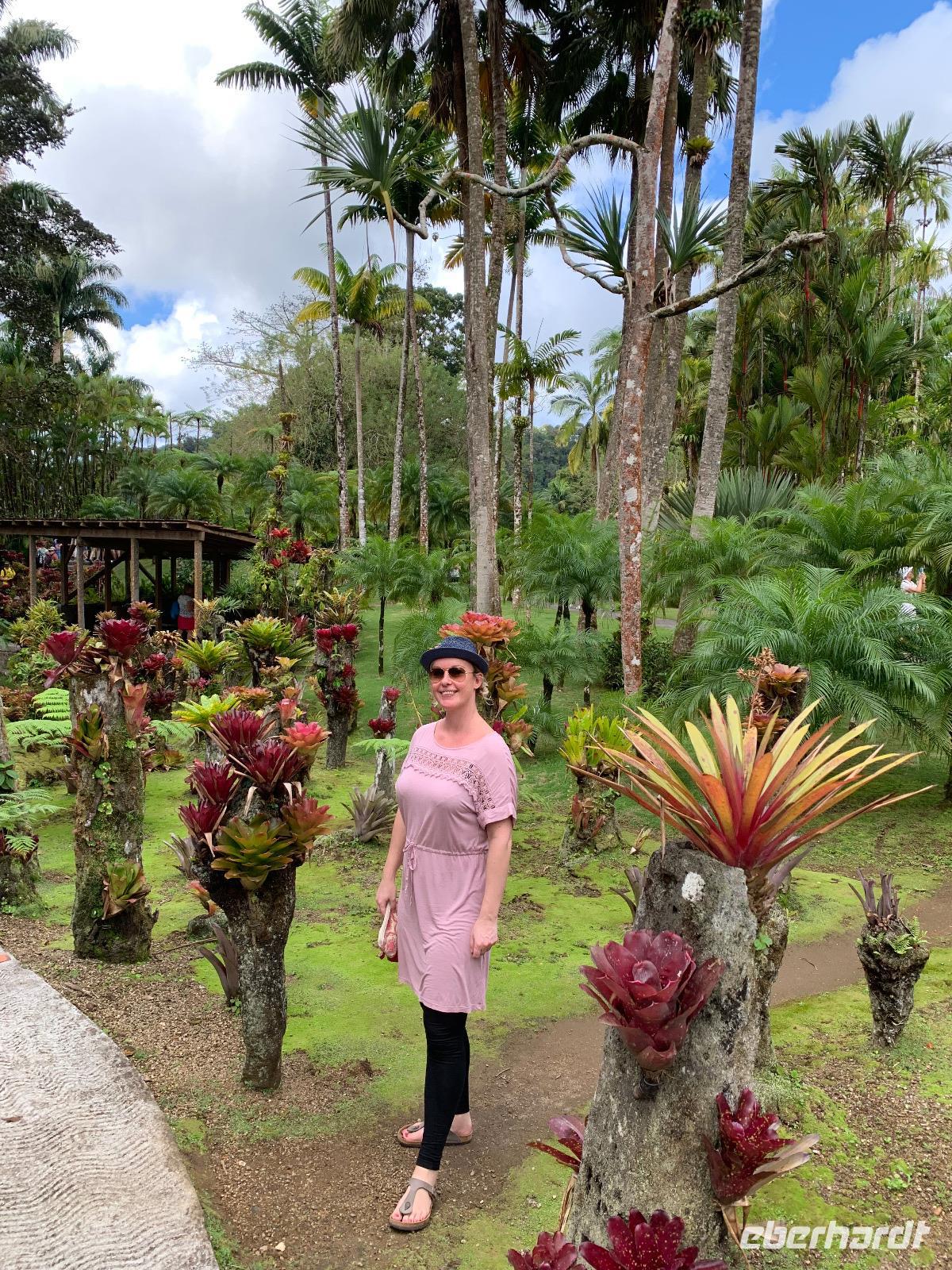 Weiter geht die Fahrt zum Balata-Garten, wo wir entlang eines befestigten Pfades alle tropischen Pflanzen in ihrer exotischen Farbenpracht und Vielfalt bestaunen können. Die Mutigen können über eine abenteuerliche Hängebrücke zwischen den Baumkronen laufen und werden mit einem herrlichen Ausblick von oben belohnt. Am Eingang kann man das rege Treiben der flinken Kolibris beobachten, die von den Wassertränken angelockt werden. Bevor wir in den Bus einsteigen, werden wir von ein wenig „liquid sunshine" überrascht. Aber dieser kleine tropische Regenguss stört bei den heißen Temperaturen nicht wirklich.