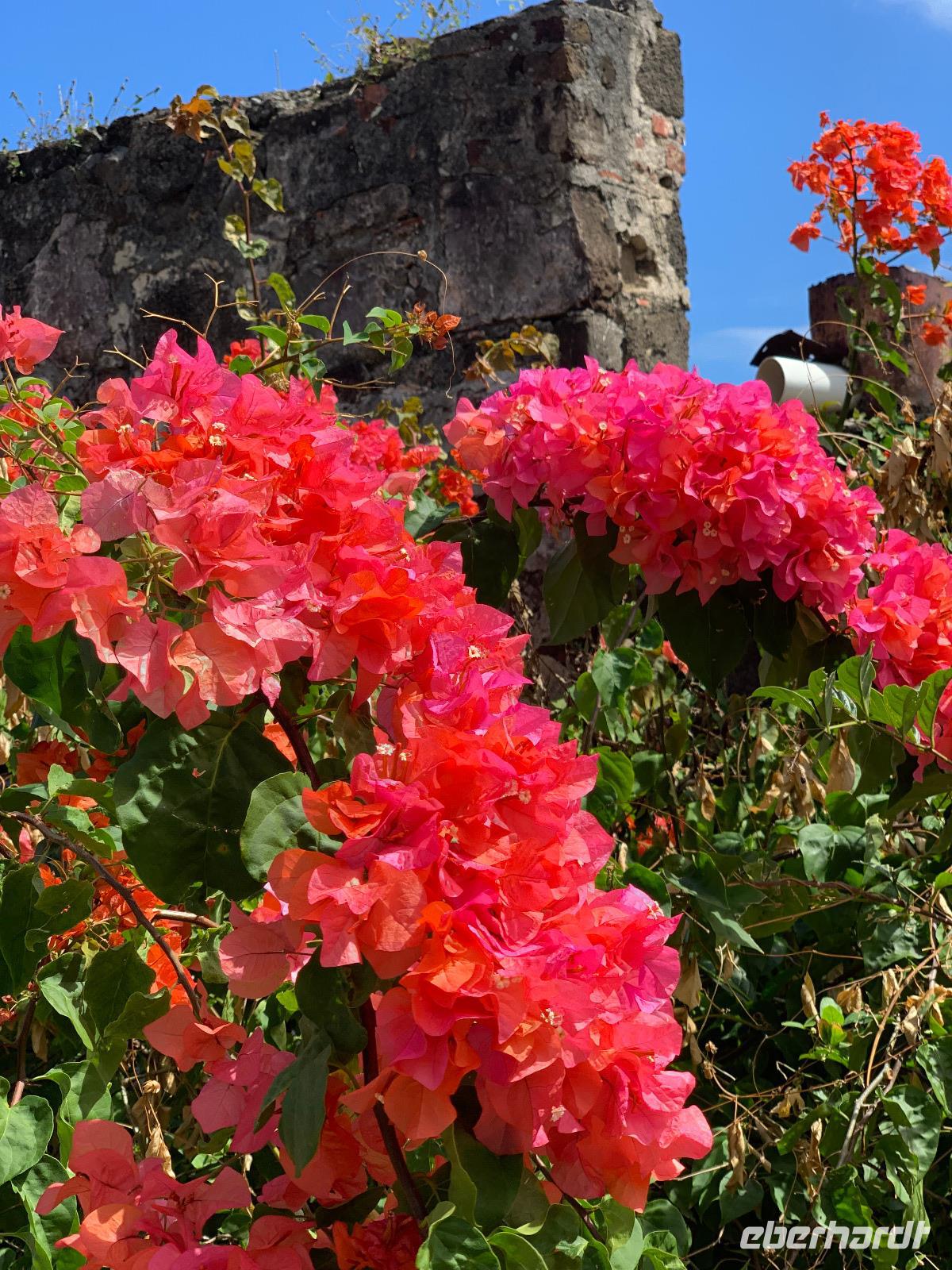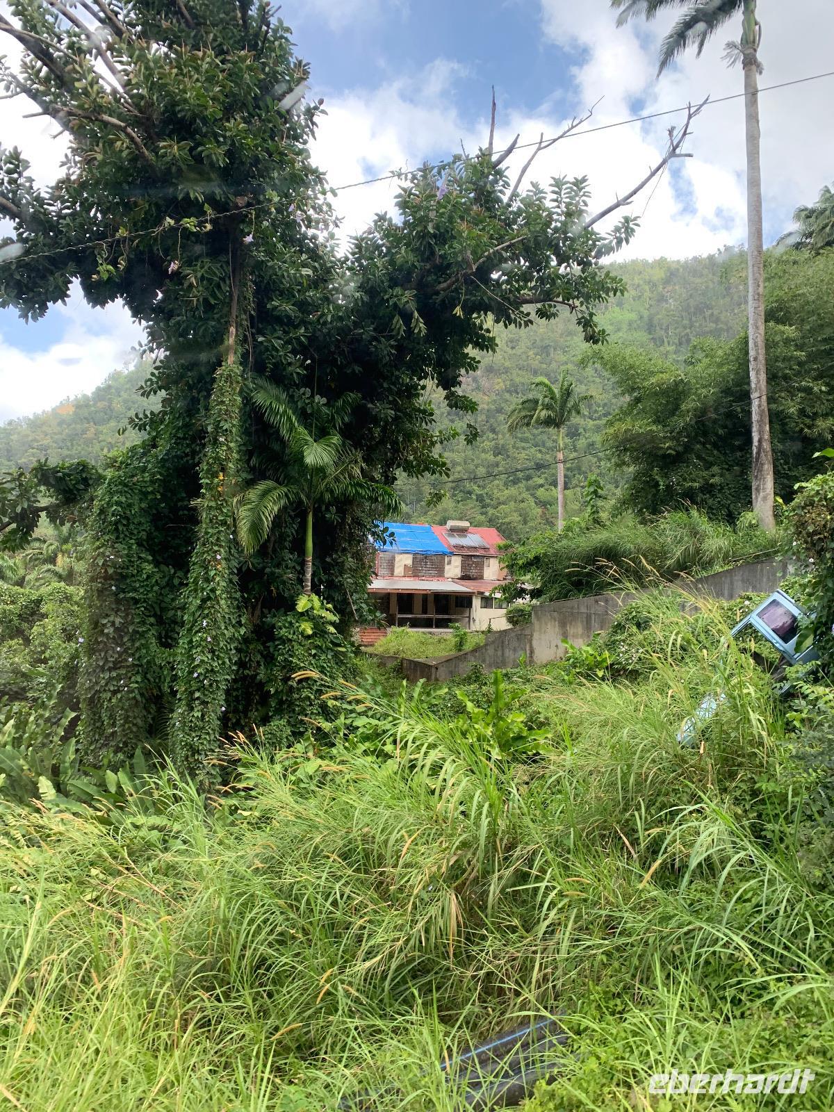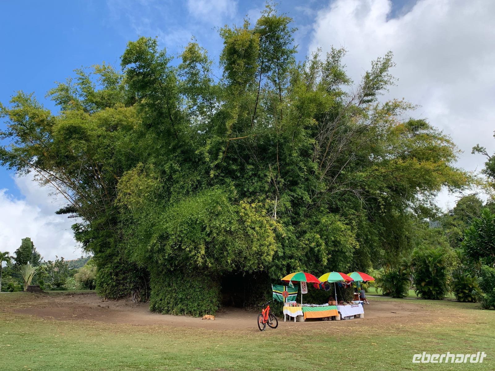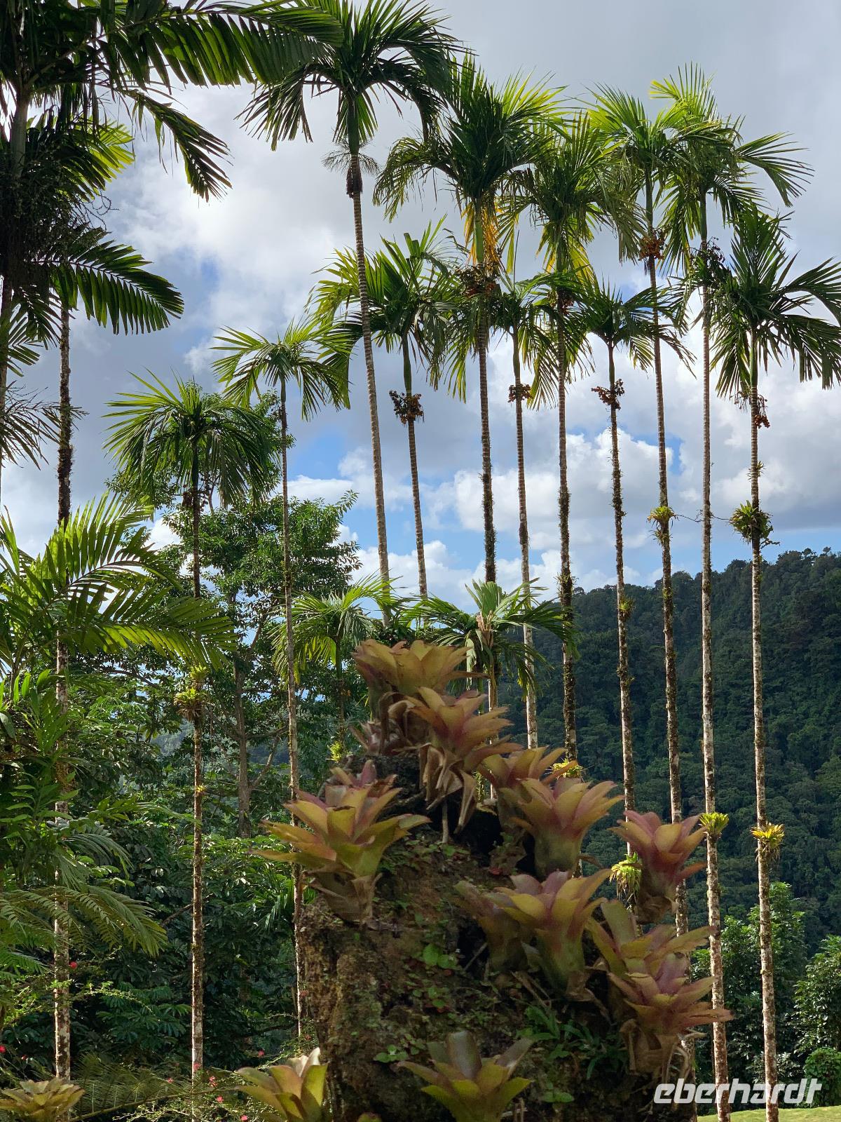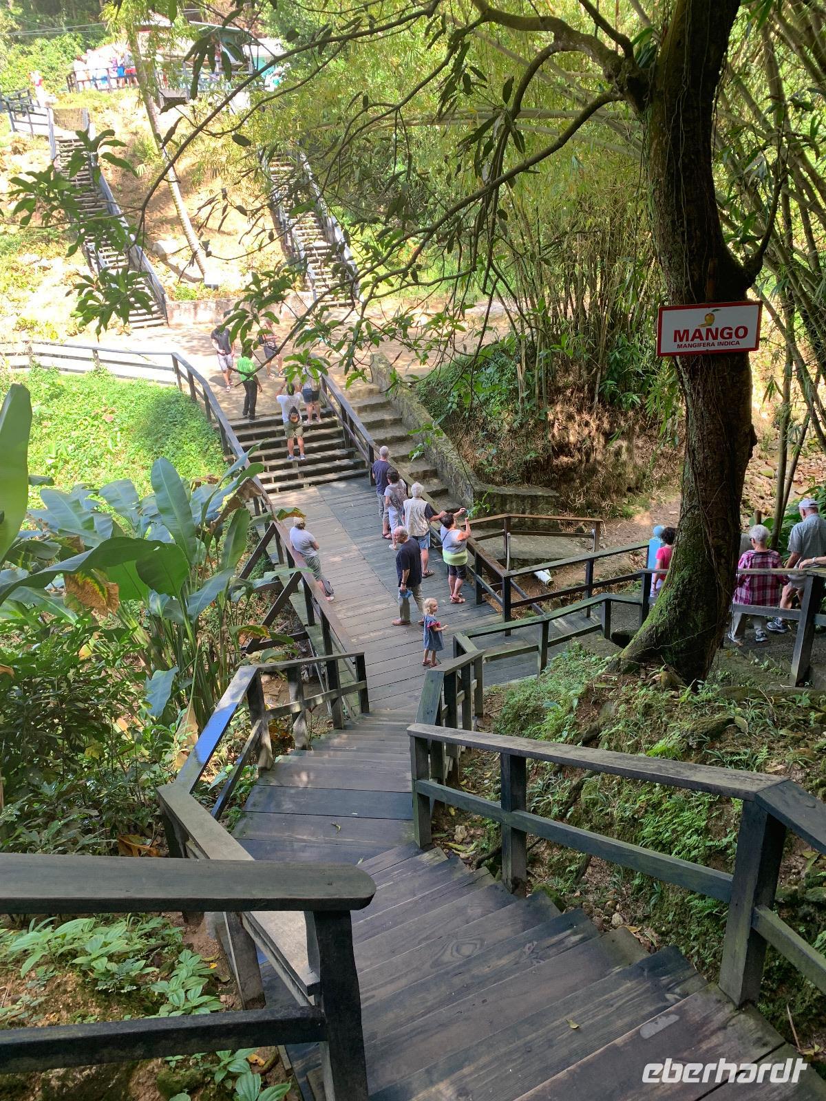 Weiter geht die Fahrt zum Balata-Garten, wo wir entlang eines befestigten Pfades alle tropischen Pflanzen in ihrer exotischen Farbenpracht und Vielfalt bestaunen können. Die Mutigen können über eine abenteuerliche Hängebrücke zwischen den Baumkronen laufen und werden mit einem herrlichen Ausblick von oben belohnt. Am Eingang kann man das rege Treiben der flinken Kolibris beobachten, die von den Wassertränken angelockt werden. Bevor wir in den Bus einsteigen, werden wir von ein wenig „liquid sunshine" überrascht. Aber dieser kleine tropische Regenguss stört bei den heißen Temperaturen nicht wirklich.