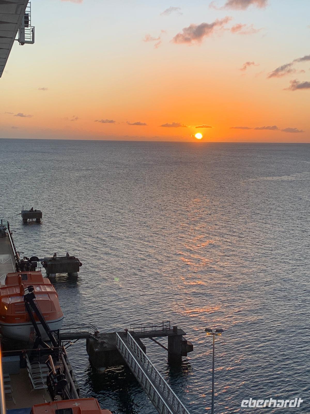 Bereits am späten Abend haben wir unsere Koffer vor die Kabine gestellt, damit wir diese heute Nachmittag am Kreuzfahrt-Terminal in Empfang nehmen können. Ein letztes üppiges Frühstück an Bord, dann müssen wir spätestens 9.00 Uhr unsere Kabinen verlassen und uns den Ausreisestempel bei den Dominikanischen Behörden im Atelier abholen. Wir genießen die letzten Stunden auf unserem Wohlfühlschiff an unseren jeweiligen Lieblingsplätzen, schlemmen noch eine Kugel Schoko-Chili- und Raspberry-Cheesecake-Eis am Pool und bummeln übers Schiff ...
