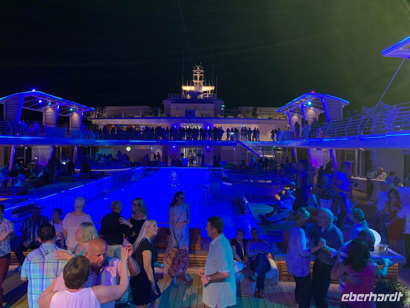 Nach dem Abendessen erfolgt die obligatorische Seenotrettungsübung. Das Auslaufen erleben wir 22.00 Uhr auf dem Pooldeck und stoßen gemeinsam mit dem sympathischen Kreuzfahrtdirektor auf die kommende Wohlfühl-Kreuzfahrt an. Während die Mein Schiff-Hymne „Große Freiheit" von James Last und Unheilig gespielt wird, genießen wir das erste Ablegen. Willkommen im Urlaub! ...