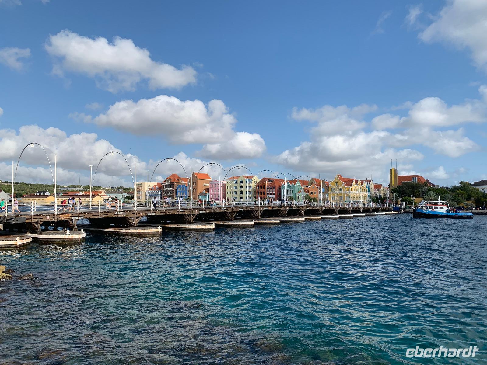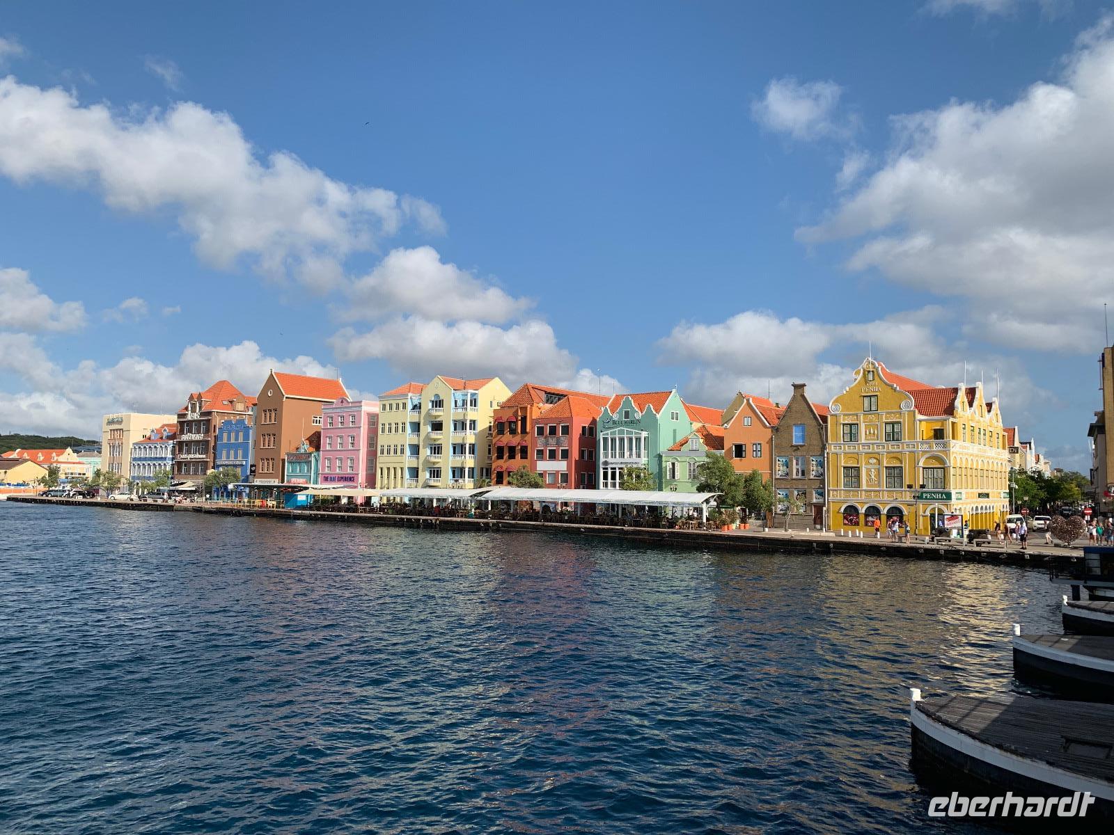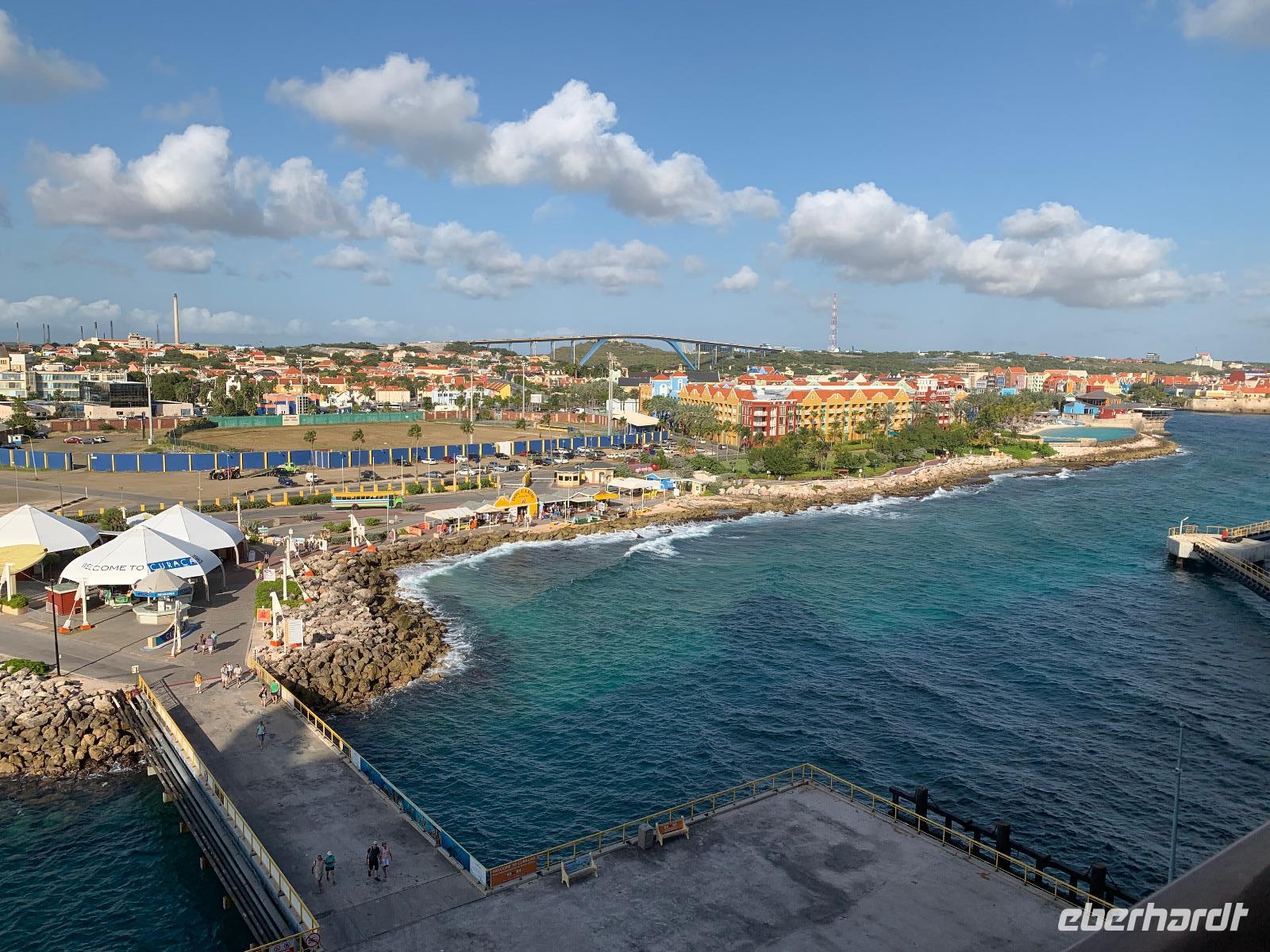 Wir liegen heute als einziges Schiff im Hafen von Willemstad. Vom Schiff aus sieht man den Meeresarm Sint Annabaai, der die Stadt in zwei Teile trennt: Otrobanda und Punda, das eigentliche Herz der Stadt. Zu Fuß erreicht man in 15 Minuten die Königin-Emma-Brücke und ist damit mitten im traumhaft schönen Zentrum von Willemstad.