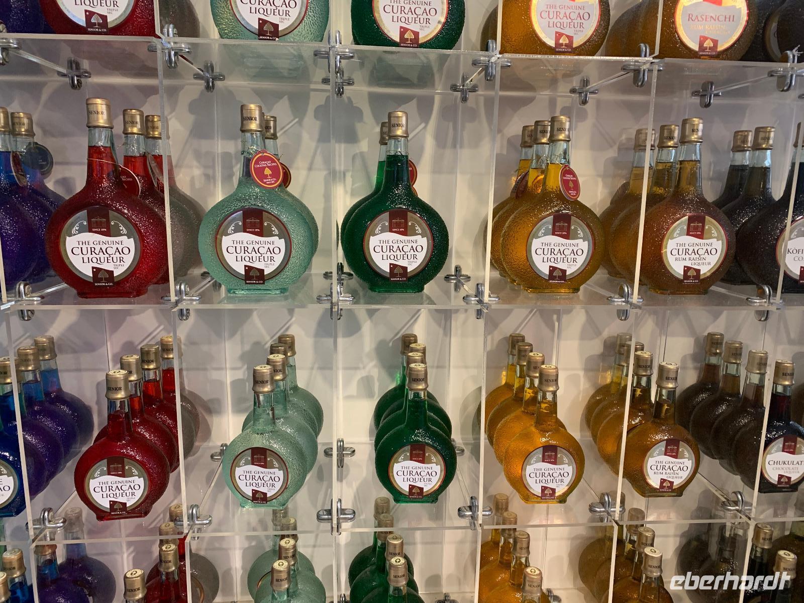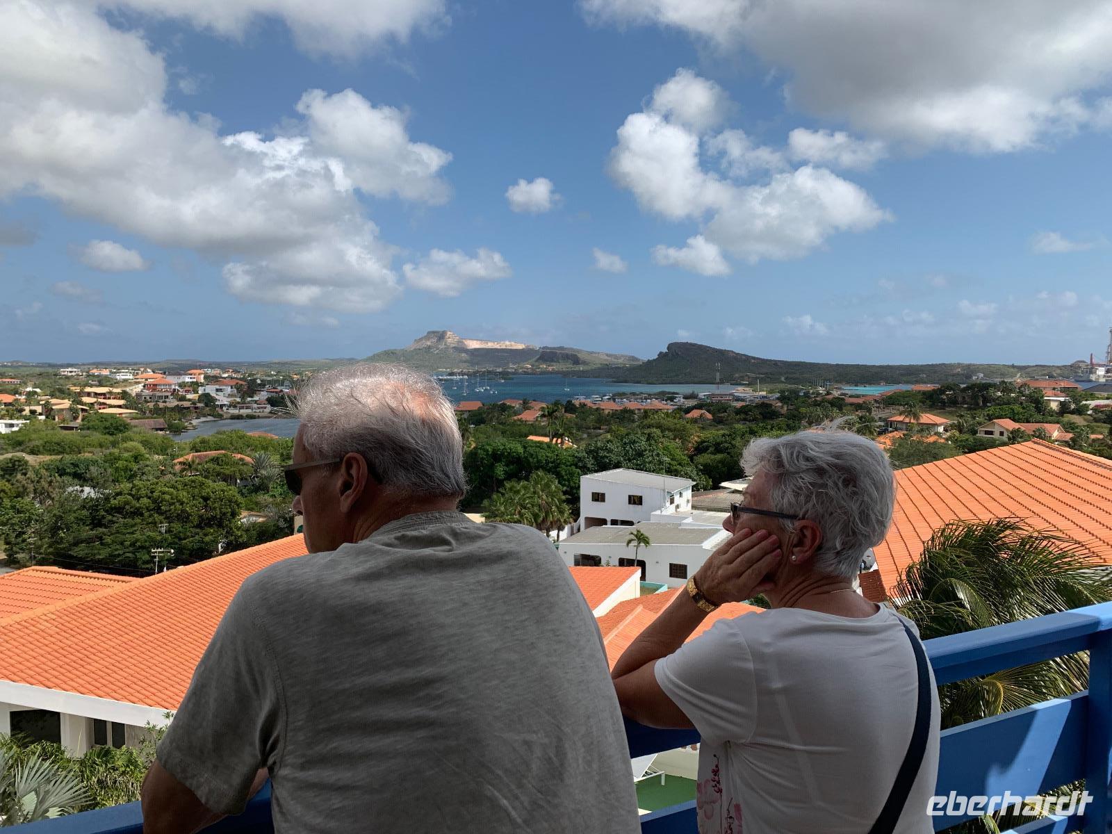 Nach dem Mittagessen an Bord starten wir zu einer kleinen Inselrundfahrt. Unsere örtliche Reiseleiterin Corinne spricht sehr gut deutsch und vermittelt uns in drei Stunden das Wissen von sechs Stunden. Zunächst fahren wir über die Königin-Juliana-Brücke, mit 56 Metern die höchste Brücke der Karibik. Dabei erhaschen wir schon einen eindrucksvollen Blick auf die Altstadt von Willemstad. Erster Halt ist die Chobolobo-Fabrik, wo wir mehr über die Produktion des berühmten Bitterlikörs Blue Curacao erfahren. Seit mehr als 100 Jahren wird hier nach geheimem Rezept destilliert. Natürlich darf eine Kostprobe nicht fehlen und wir lassen uns Grenadine und Schokolade in flüssiger Form schmecken. Weiter geht die Fahrt mit dem Bus zum Caribbean Handcraft Store. Hier können wir nicht nur Souvenirs erstehen, sondern vor allem einen malerischen Blick über das Inselinnere genießen.