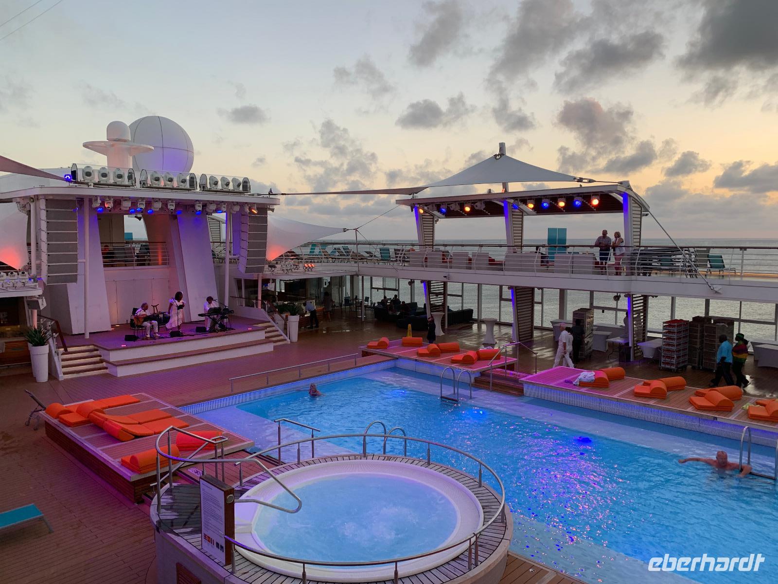In geselliger Runde sitzen wir einmal mehr beim Abendessen im Atlantik-Klassik - einfach lecker! Danach zieht es einige von uns zur Schlagershow ins Theater, andere lauschen lateinamerikanischen Klängen auf dem Pooldeck unter dem karibischen Sternenhimmel.