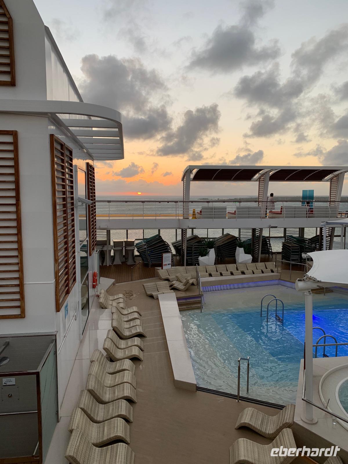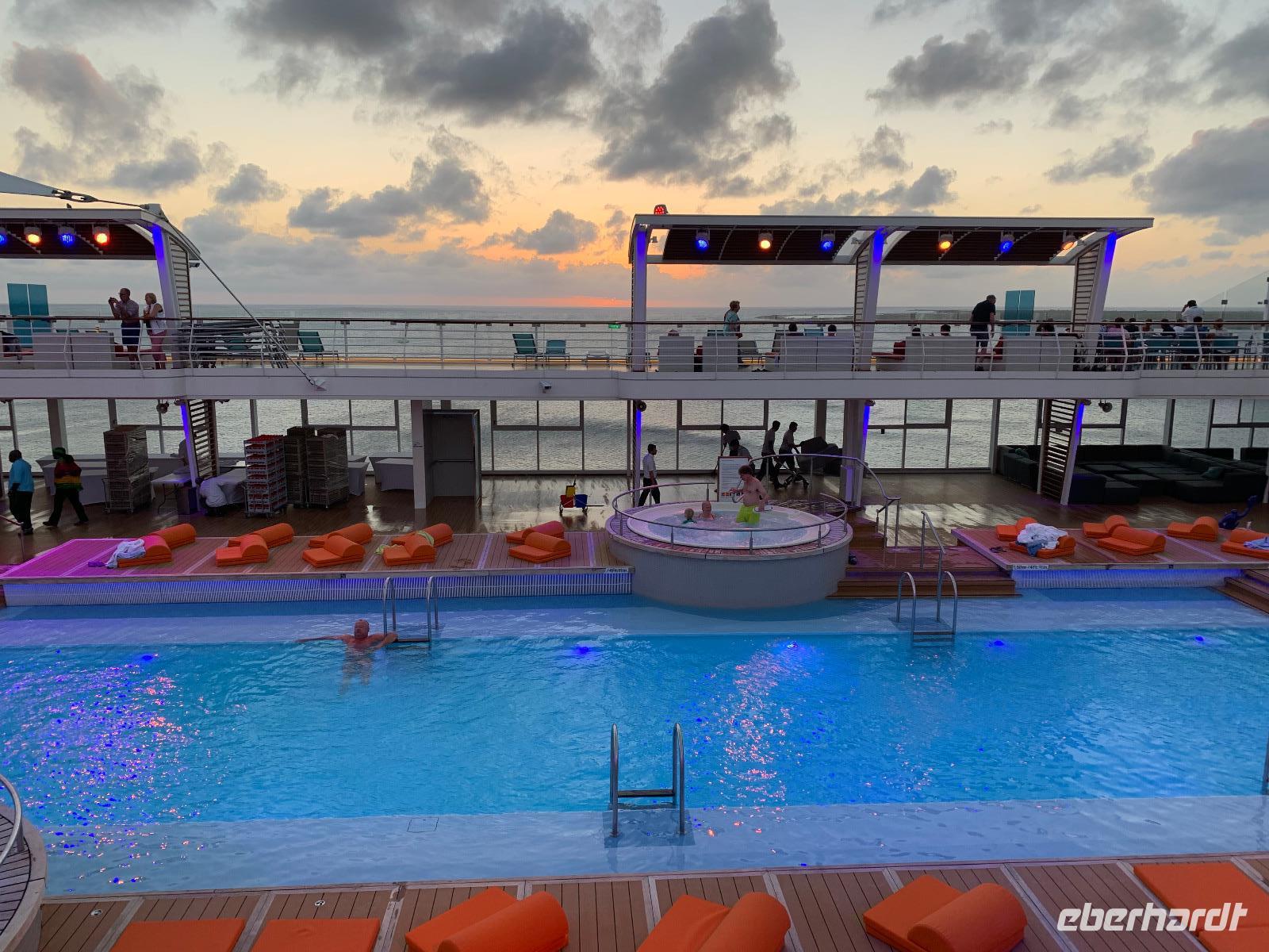 Nun sucht sich jeder wieder sein Lieblingsplätzchen an Bord. Eine Sonnenstunde am Swimmingpool verbringen, der eingebettet von bequemen Liegemöglichkeiten und Sitzlounges das Aqua-Deck dominiert. Oder doch lieber ein frisch gemixter Smoothie in der Himmel & Meer Lounge mit Blick aufs Meer? Der intimste Platz am Wasser ist jedoch immer noch der eigene Balkon vor der Kabine.