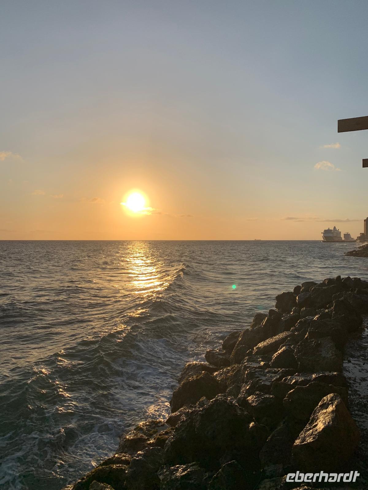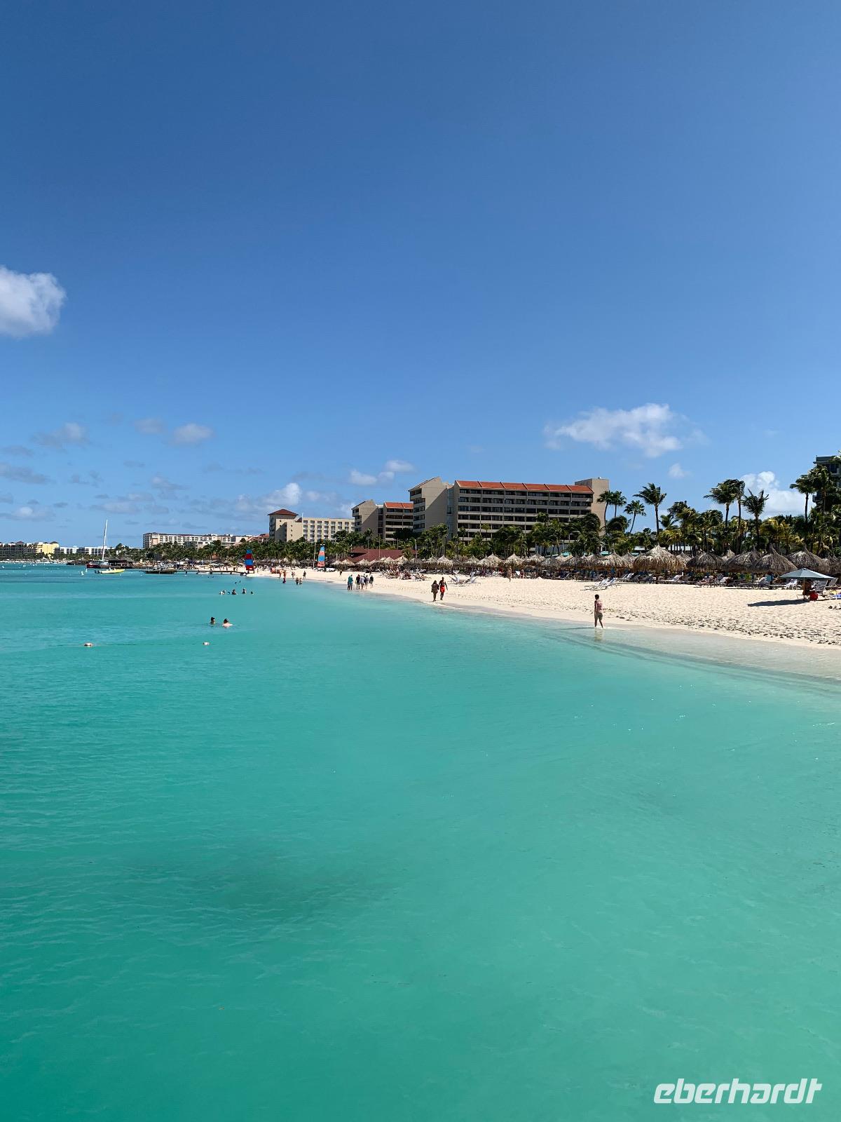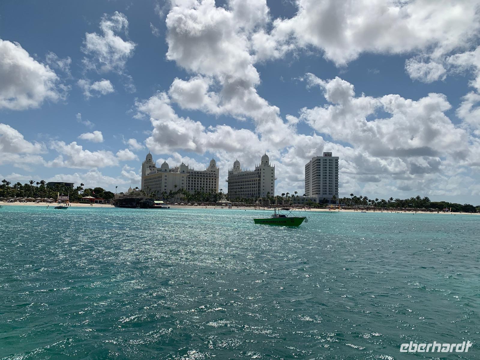 Mit dem Bus fahren wir weiter zum Palm Beach, der von riesigen Hotels gesäumt wird. Hier steigen wir in ein Transferboot um, mit welchem wir nach kurzer Fahrt den Seaworld-Explorer erreichen, der über ein Deck unter Wasser mit Panoramafenstern verfügt. Wir sehen hin und wieder ein Stück des 112 Meter langen deutschen Schiffswracks Antilla und der ein oder andere Fischschwarm lässt sich auch blicken und im Foto einfangen. Zurück geht es wieder mit dem Transferboot zum Palm Beach, von wo wir mit dem Bus unser letztes Ziel anfahren, das im Norden der Insel gelegene California Lighthouse, ein Leuchtturm, der schon von weitem sehr gut sichtbar ist. Von hier hat man nochmal einen schönen Blick über die Insel und die Küste. Mit zahlreichen Eindrücken geht es zurück zur Mein Schiff 5, wo wir den Nachmittag für einen individuellen Bummel in die Stadt nutzen. Badefreunde finden am nahe gelegenen Eagle Beach türkisblaues Meer und einen breiten Puderzuckerstrand vor.