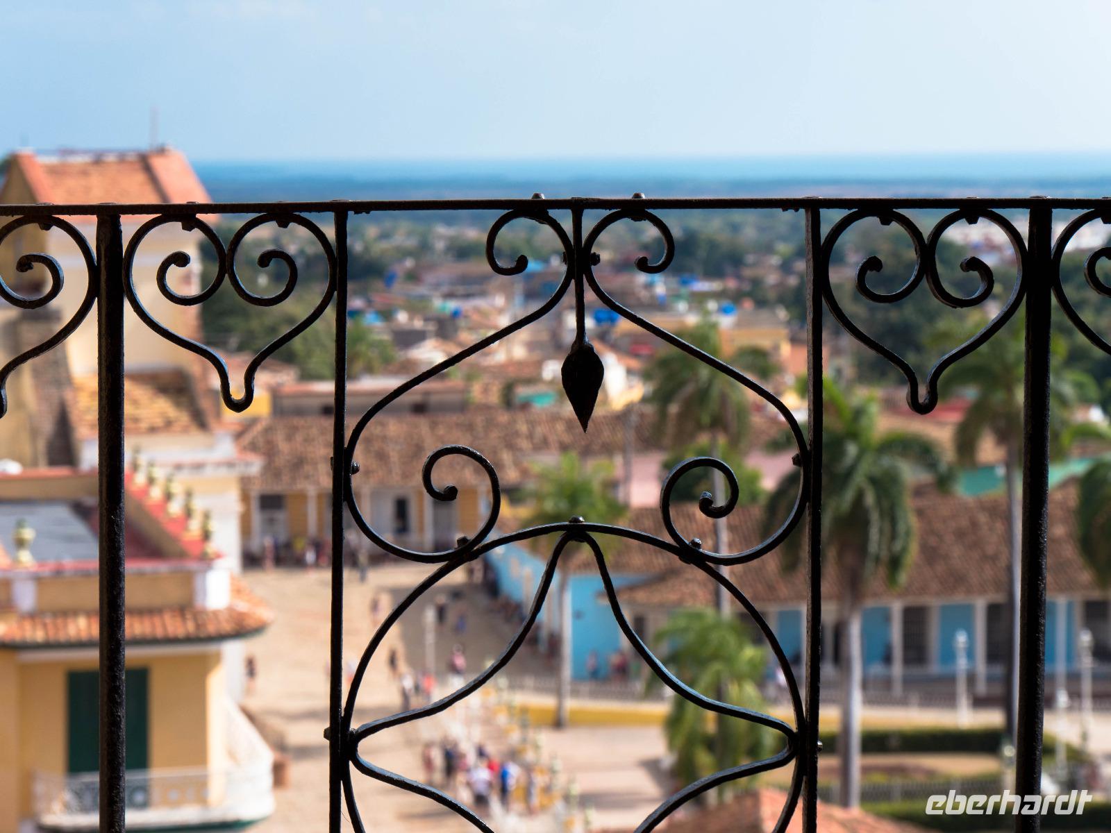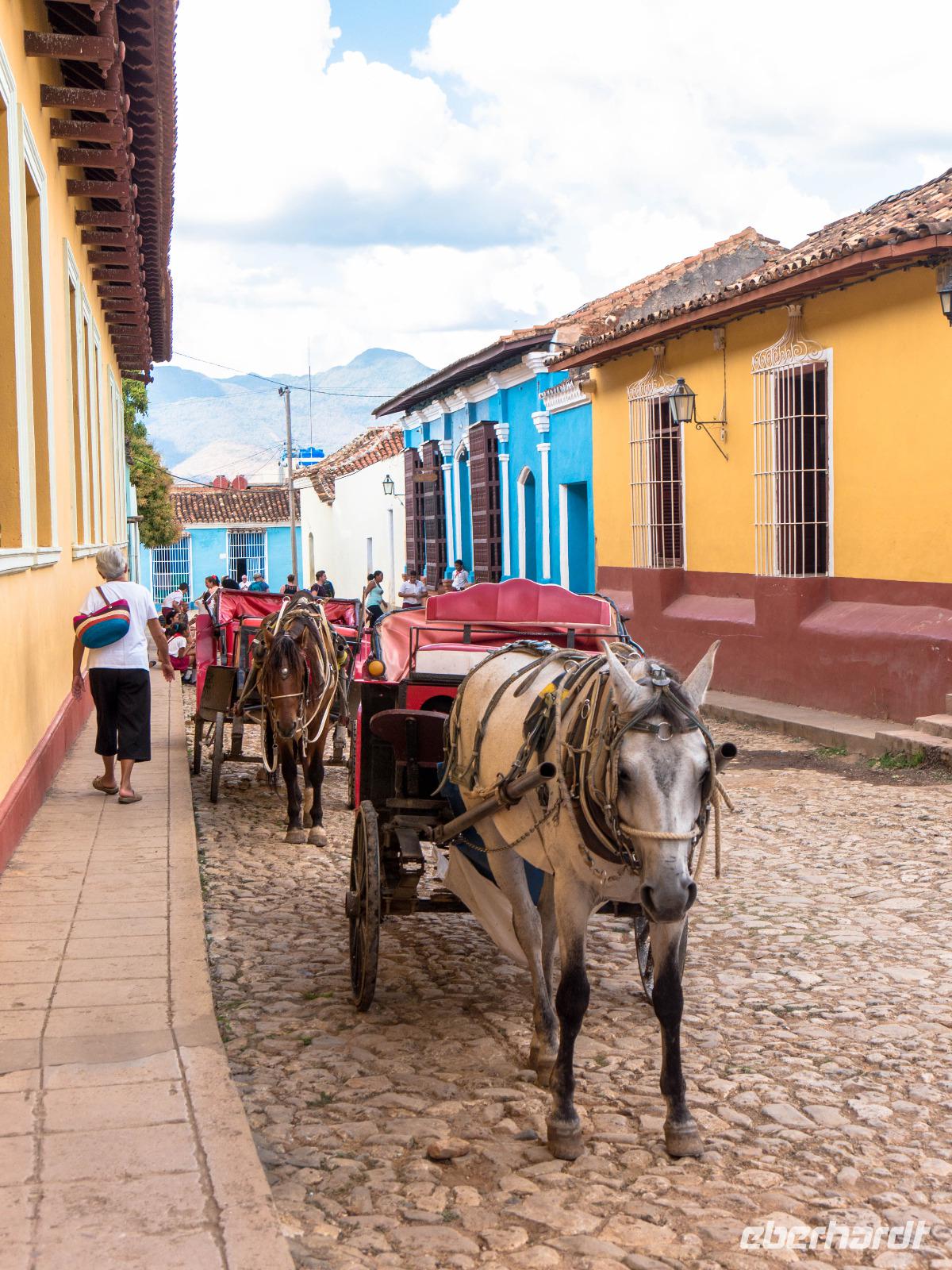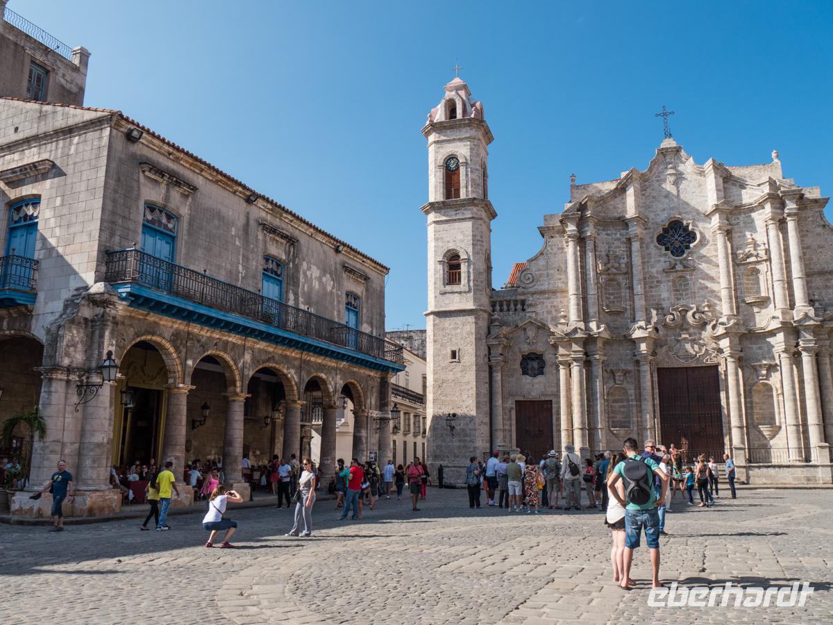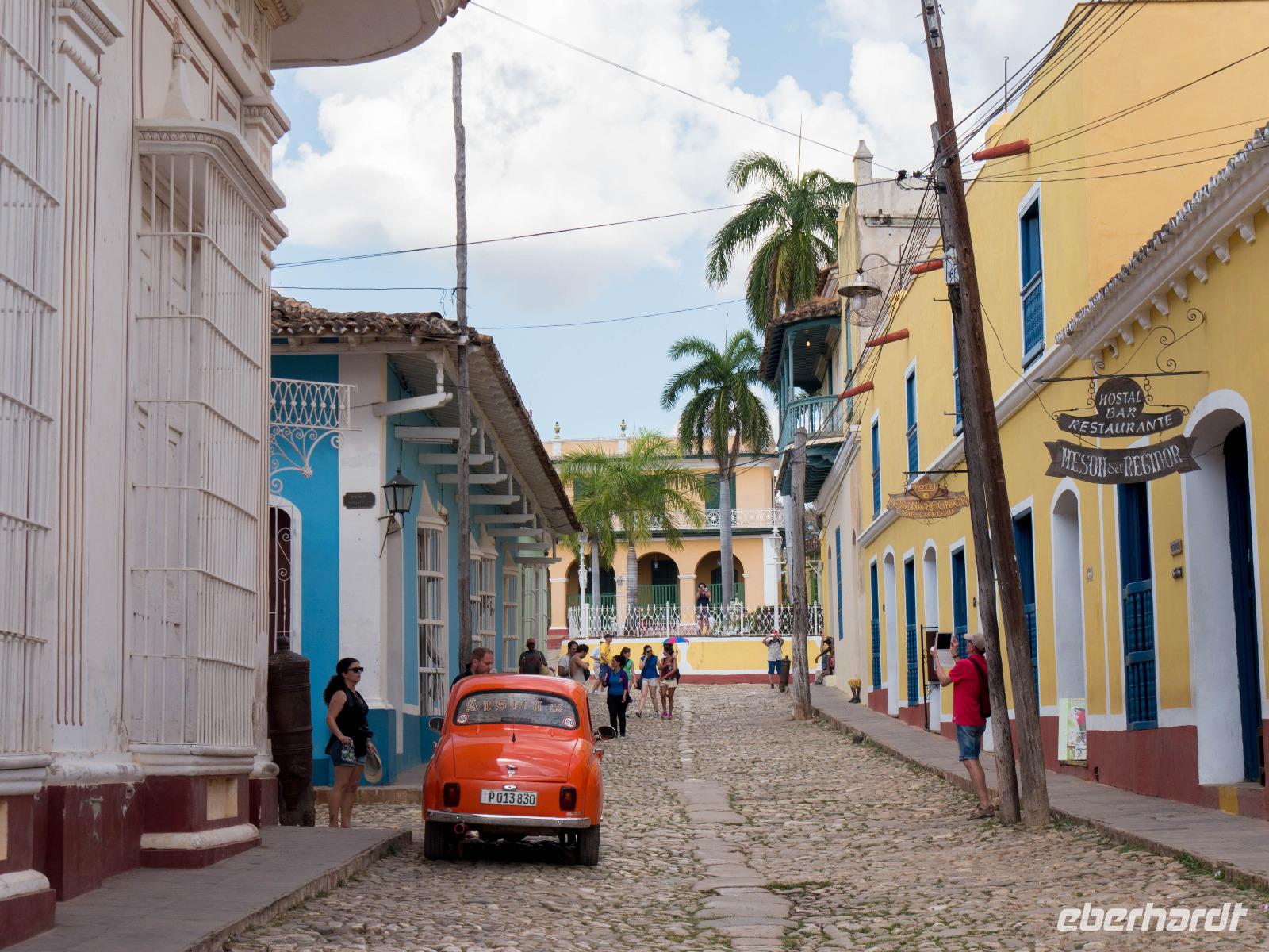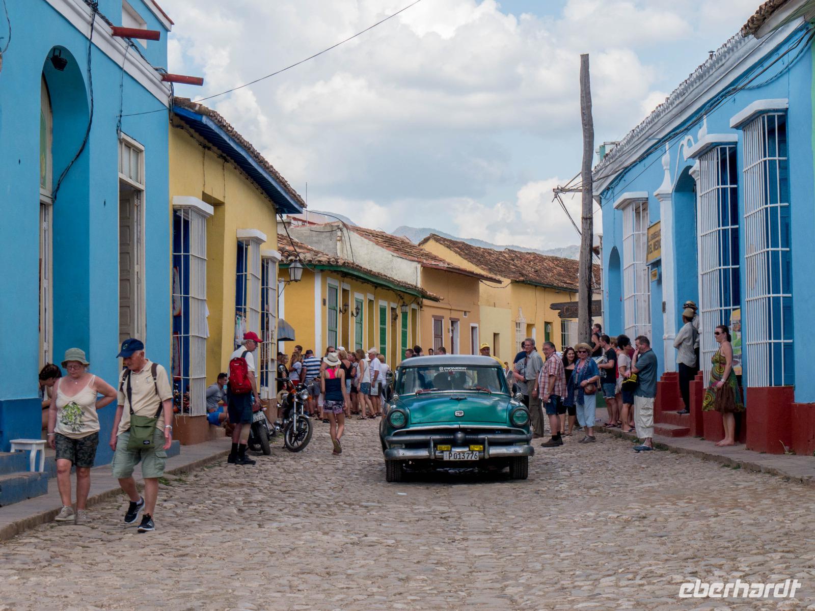 Der letzte Hafen unserer Reise ist Cienfuegos. Schon die Einfahrt durch den Kanal ist sehenswert und heute erleben wir zum ersten und einzigen Mal das Anlege-Manöver im Hafen. Bevor wir von Bord gehen, können wir Kapitän Yuriy noch für ein Eberhardt-Gruppenfoto gewinnen - bitte lächeln! Danach gibt es noch ein leichtes Mittagessen und so können wir gut gestärkt unseren Ausflug nach Trinidad (Welterbe der UNESCO) antreten. Auf unserer Fahrt von Cienfuegos nach Trinidad passieren wir zahlreiche Zuckerrohrfelder und sehen unzählige Pferdekutschen. Naja, die klapprigen Pferde (um nicht zu sagen Gäule) ziehen hölzerne Gestelle (um nicht zu sagen Kutschen) hinter sich her. Selbst auf den Autobahnen ist immer noch eine Spur für Pferdekutschen und Fahrradfahrer frei. Hier erleben wir noch einmal Kubas unverwechselbaren Charme - es scheint, als wäre die Zeit stehen geblieben. Seinen Aufstieg zu einer wohlhabenden Stadt verdankt Trinidad dem Zucker und dem damit verbundenen Sklavenhandel. Bis Mitte des 19. Jahrhunderts war Trinidad eine der bedeutendsten Zuckermetropolen Kubas und dieses Erbe hat sich die Stadt bis heute bewahrt. Die kopfsteingepflasterten Straßen sind gesäumt mit schmucken Fassaden in allen Pastelltönen. Die Prachtbauten rund um die Plaza Major erinnern noch stark an die glanzvolle Kolonialzeit. Vom Glockenturm des ehemaligen Franziskanerklosters bietet sich ein grandioser Blick auf die Dächer der Stadt und das Umland. Es herrscht eine lebendige Atmosphäre in der man sich treiben lassen kann. Wir beobachten Schulkinder in ihren Uniformen, Pferdekutschen und Oldtimer, die durch die Straßen rollen, fliegende Händler und jede Menge Touristen. Der Besuch von Trinidad ist ein Muss einer jeden Kuba-Reise. Zurück in Cienfuegos heißt es nun schon Koffer packen, denn das Ende unserer Segelkreuzfahrt steht bevor. Nach dem Abendessen stoßen wir an Deck noch einmal auf die schöne Reise an und lassen die vergangenen Tage Revue passieren.