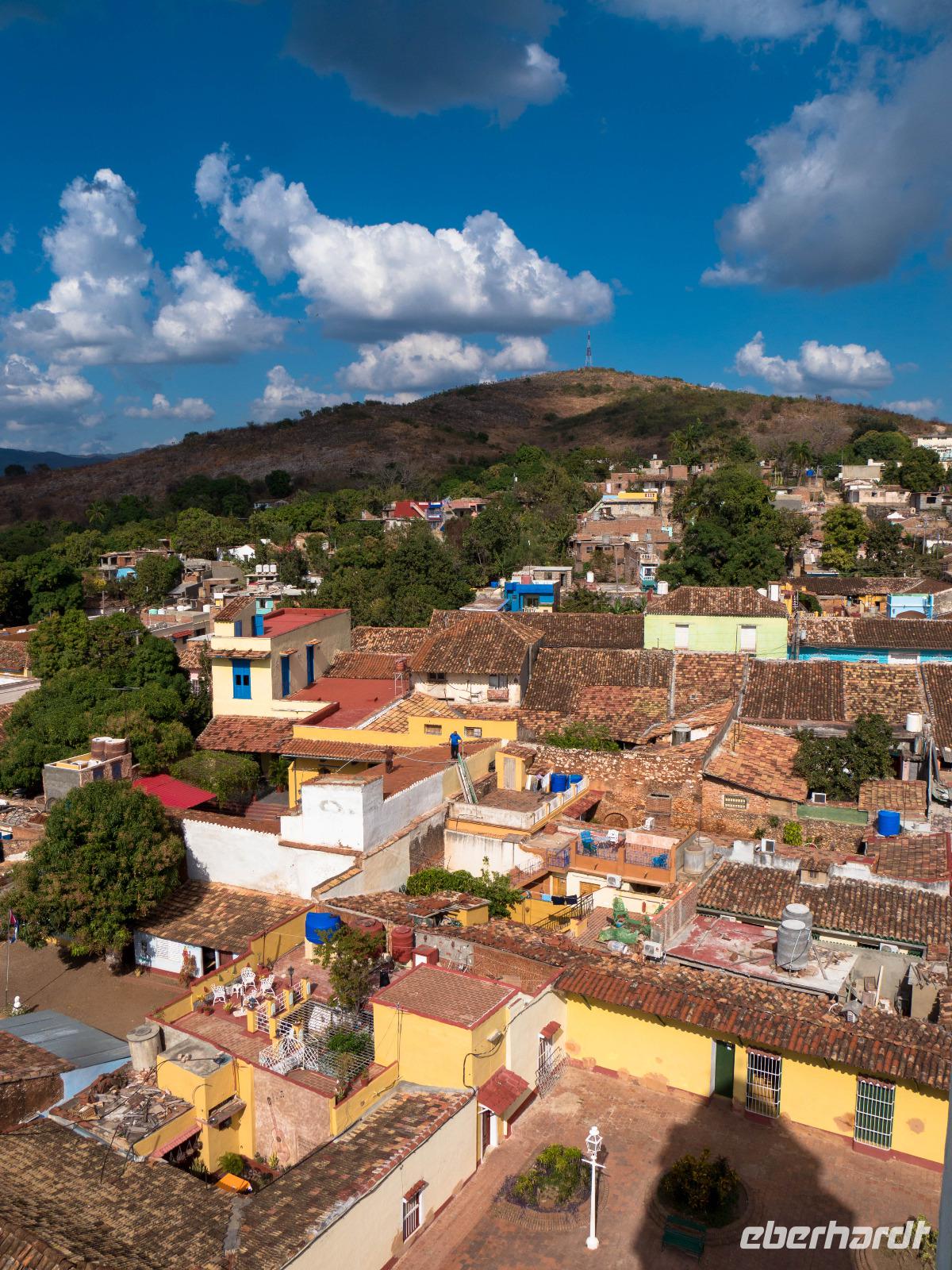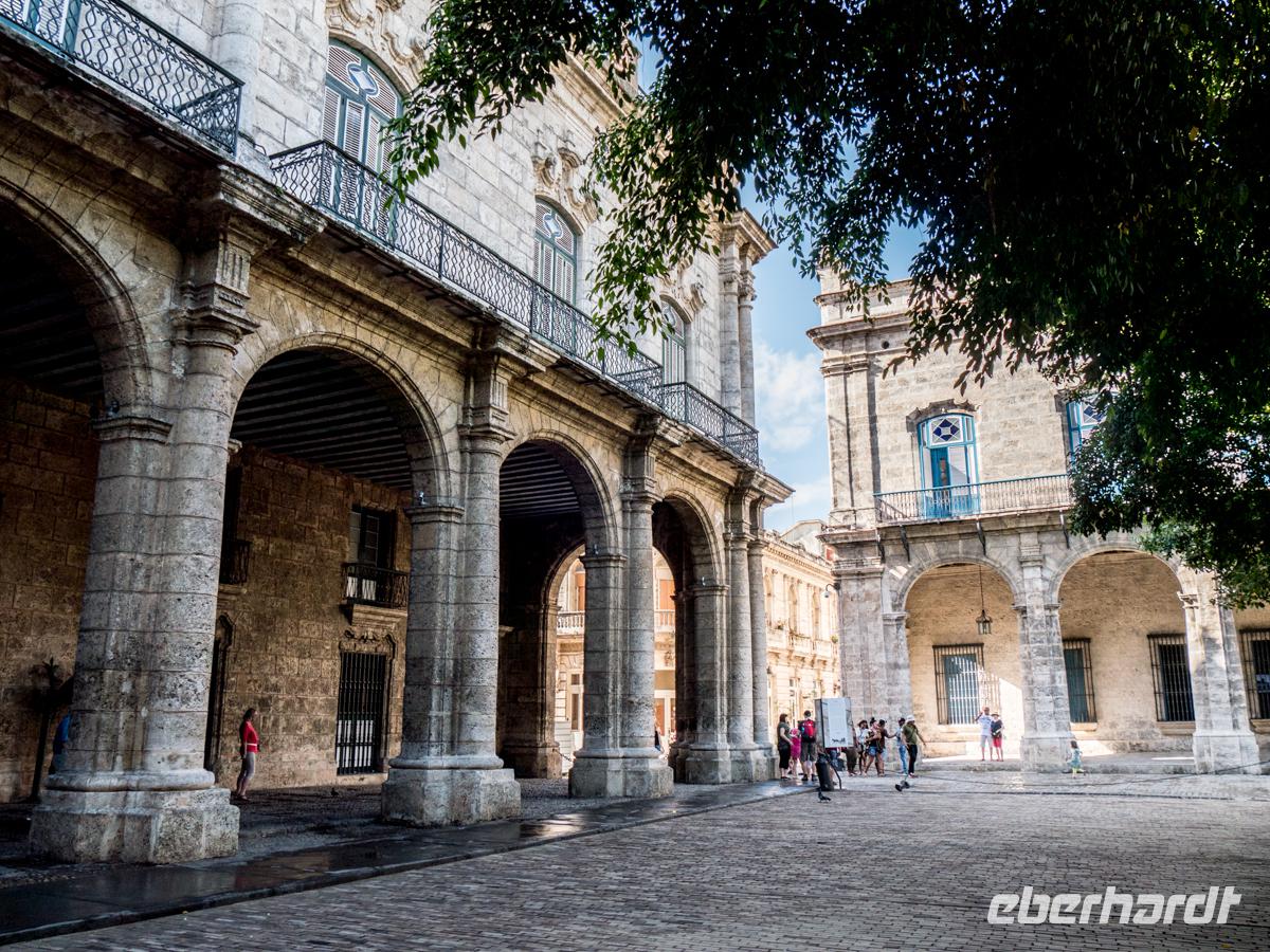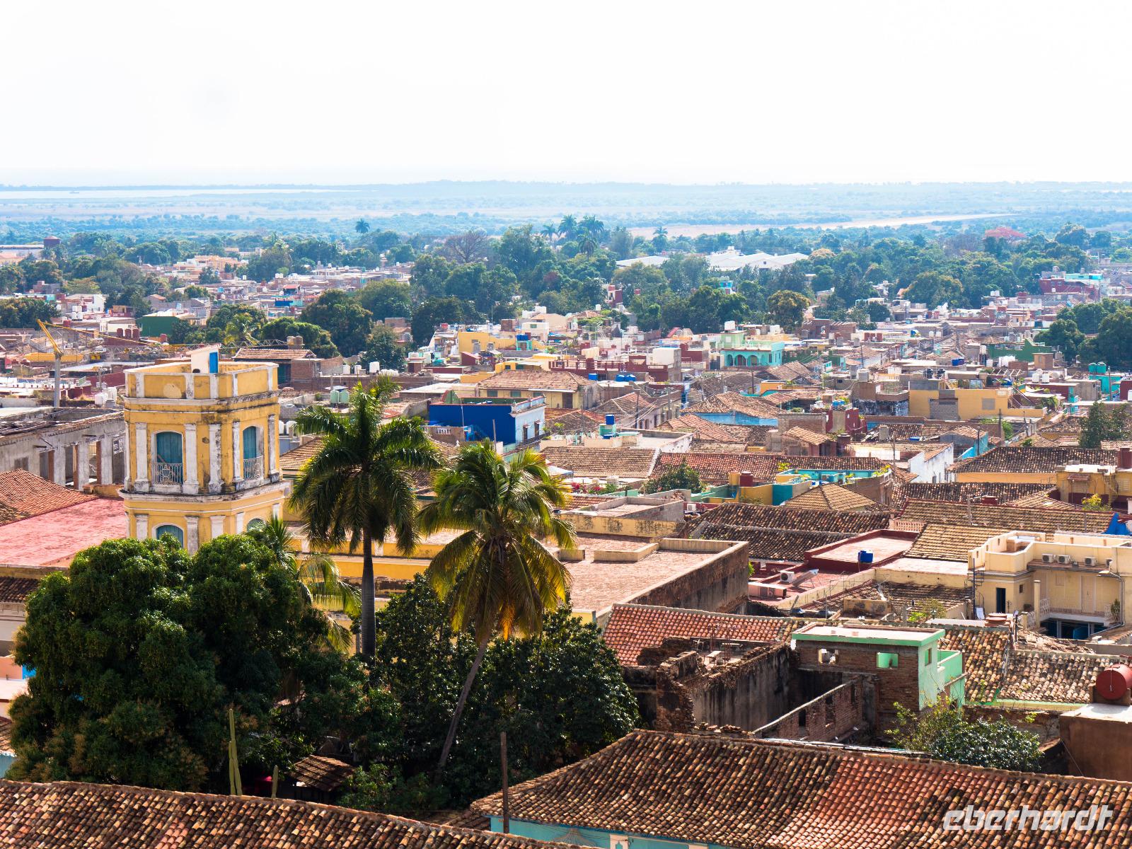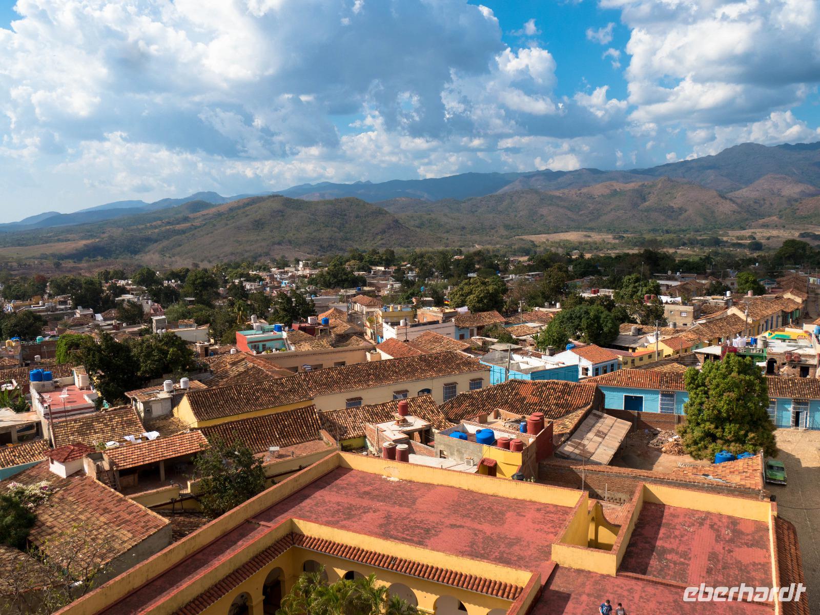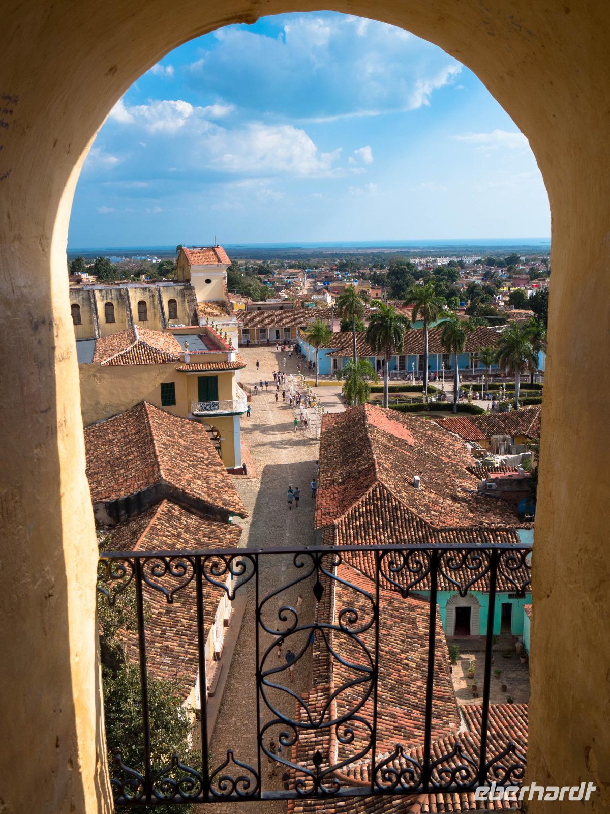 Der letzte Hafen unserer Reise ist Cienfuegos. Schon die Einfahrt durch den Kanal ist sehenswert und heute erleben wir zum ersten und einzigen Mal das Anlege-Manöver im Hafen. Bevor wir von Bord gehen, können wir Kapitän Yuriy noch für ein Eberhardt-Gruppenfoto gewinnen - bitte lächeln! Danach gibt es noch ein leichtes Mittagessen und so können wir gut gestärkt unseren Ausflug nach Trinidad (Welterbe der UNESCO) antreten. Auf unserer Fahrt von Cienfuegos nach Trinidad passieren wir zahlreiche Zuckerrohrfelder und sehen unzählige Pferdekutschen. Naja, die klapprigen Pferde (um nicht zu sagen Gäule) ziehen hölzerne Gestelle (um nicht zu sagen Kutschen) hinter sich her. Selbst auf den Autobahnen ist immer noch eine Spur für Pferdekutschen und Fahrradfahrer frei. Hier erleben wir noch einmal Kubas unverwechselbaren Charme - es scheint, als wäre die Zeit stehen geblieben. Seinen Aufstieg zu einer wohlhabenden Stadt verdankt Trinidad dem Zucker und dem damit verbundenen Sklavenhandel. Bis Mitte des 19. Jahrhunderts war Trinidad eine der bedeutendsten Zuckermetropolen Kubas und dieses Erbe hat sich die Stadt bis heute bewahrt. Die kopfsteingepflasterten Straßen sind gesäumt mit schmucken Fassaden in allen Pastelltönen. Die Prachtbauten rund um die Plaza Major erinnern noch stark an die glanzvolle Kolonialzeit. Vom Glockenturm des ehemaligen Franziskanerklosters bietet sich ein grandioser Blick auf die Dächer der Stadt und das Umland. Es herrscht eine lebendige Atmosphäre in der man sich treiben lassen kann. Wir beobachten Schulkinder in ihren Uniformen, Pferdekutschen und Oldtimer, die durch die Straßen rollen, fliegende Händler und jede Menge Touristen. Der Besuch von Trinidad ist ein Muss einer jeden Kuba-Reise. Zurück in Cienfuegos heißt es nun schon Koffer packen, denn das Ende unserer Segelkreuzfahrt steht bevor. Nach dem Abendessen stoßen wir an Deck noch einmal auf die schöne Reise an und lassen die vergangenen Tage Revue passieren.