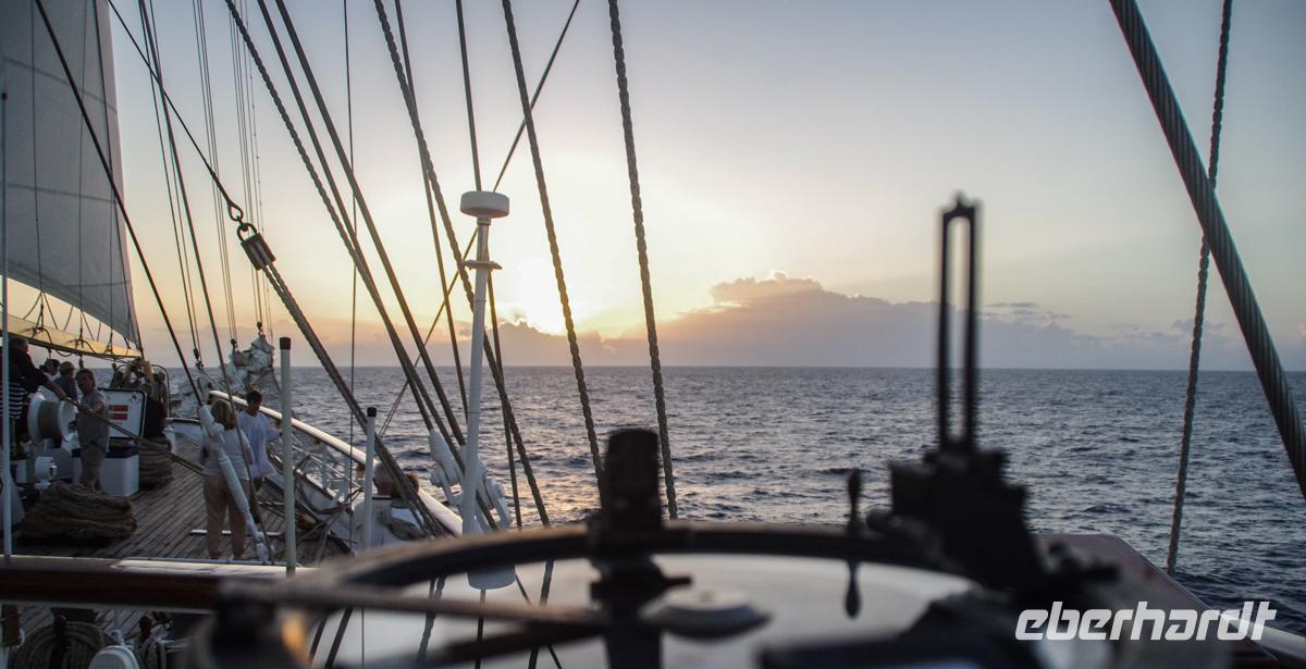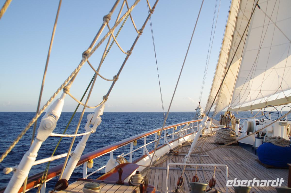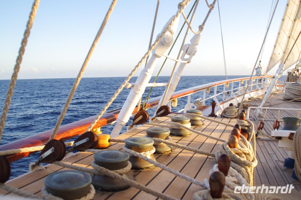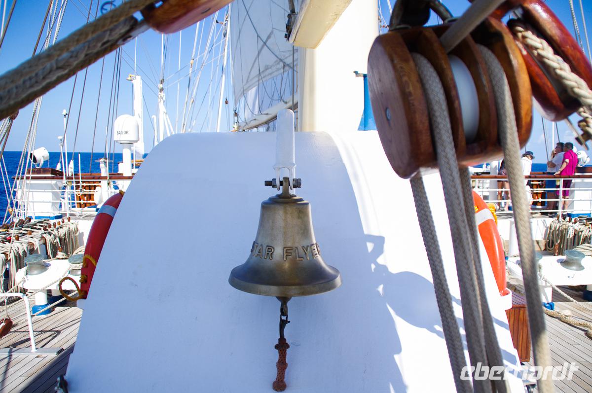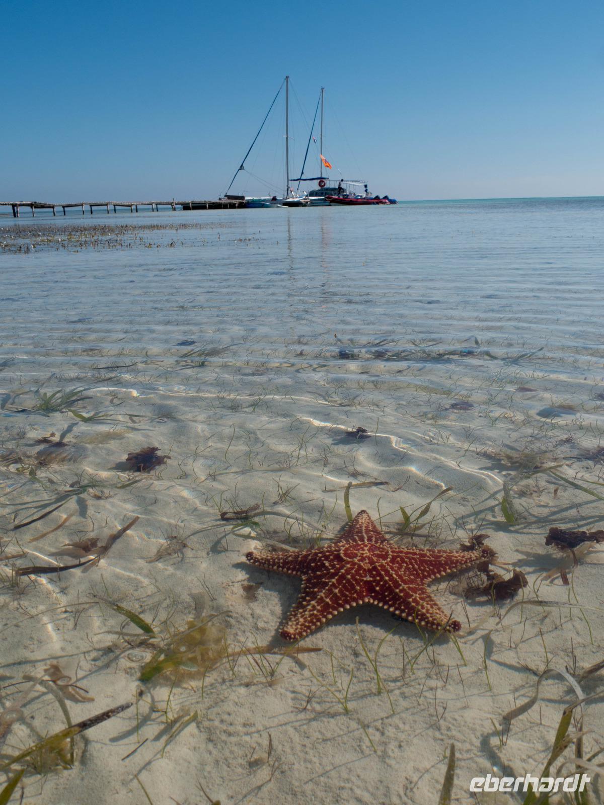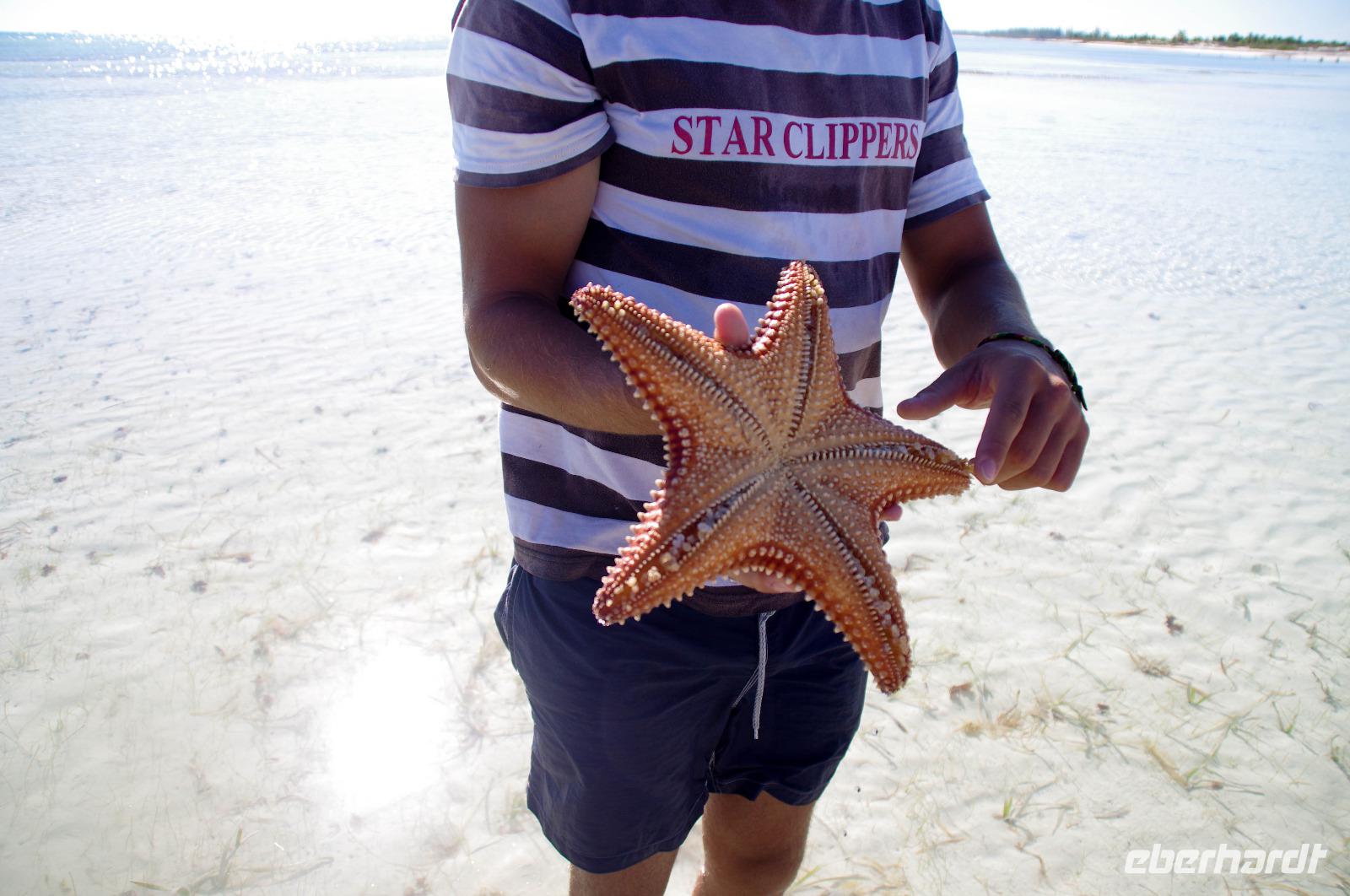 Heute ist der Landgang etwas aufwändiger: zunächst fahren wir mit den Tenderbooten Richtung Cayo Rico. Da es hier aber keinen tiefen Hafen gibt, müssen wir auf See noch einmal in die Zodiacs umsteigen - kein Problem bei ruhiger See! Mit Ankunft an der hölzernen Pier fühlen wir uns wie Robinson Crusoe - eine Insel fast für uns allein mit Puderzuckerstrand und kristallklarem Wasser. Neben dem Rancho entdecken wir Leguane und im seichten Wasser Rochen und Seesterne. Willkommen im kleinen Paradies! Auch für unser leibliches Wohl wird gesorgt - während wir uns die Sonne auf den Bauch scheinen lassen oder am Strand spazieren, bereitet die Crew der Star Flyer ein fantastisches BBQ vor. Dazu ein kühles Bier, was will man mehr?! Zurück an Bord weiht uns Gerald, der 1. Offizier, in die Geheimnisse der Nautik ein (...naja zumindest im Grundkurs). Auf dem Segelschiff gilt anders als auf klassischen Kreuzfahrtschiffen das System der offenen Brücke und so kann jeder hinein schauen und seine Fragen los werden. Immerhin sind hier an Bord 17 Mann zuständig für das Setzen der Segel! Nun müssen wir uns aber etwas hübsch machen, denn heute Abend ist Captains Dinner! Dennoch geht es hier an Bord immer leger zu und der schicke Zwirn kann getrost zu Hause gelassen werden. Das Menü ist wieder einmal vorzüglich, man hat nur die Qual der Wahl zwischen den leckeren Gerichten: Hummer oder Entenbrust? Anschließend zeigt die Crew bei der Talent Show was in ihnen steckt: von Gesang über Comedy bis zu Zauberei ist alles dabei!