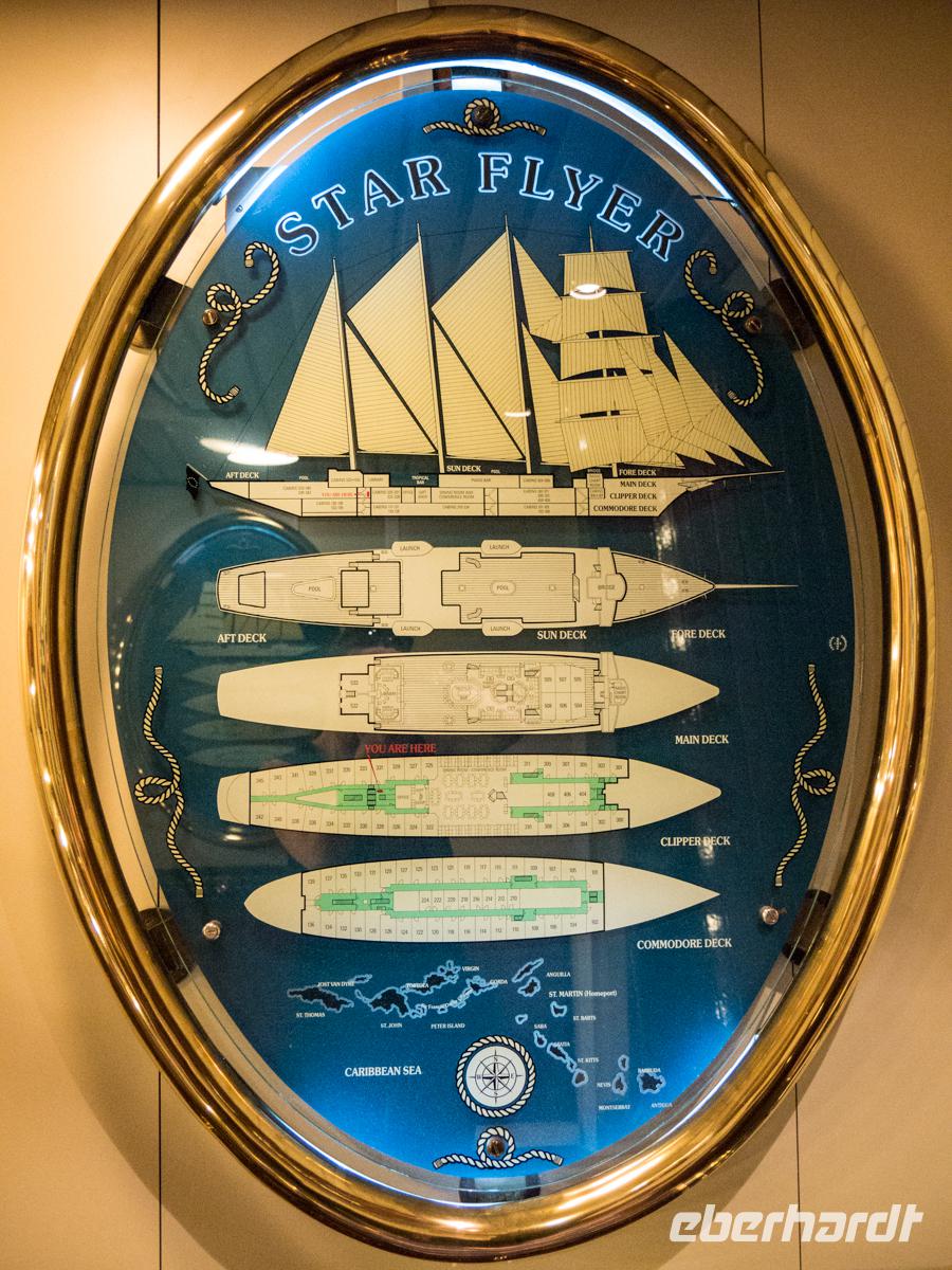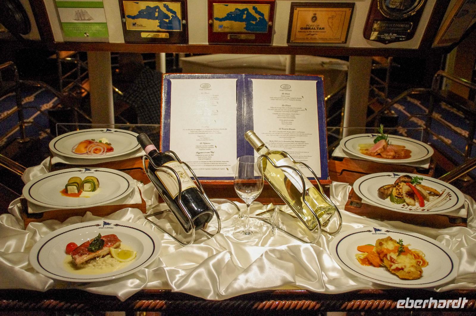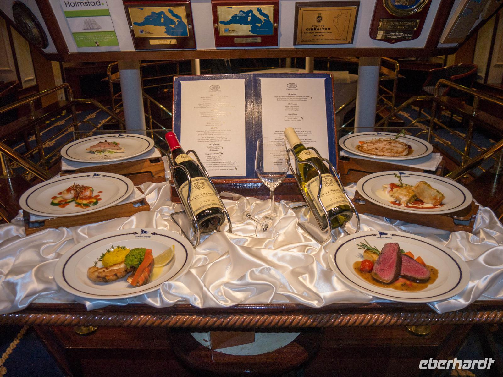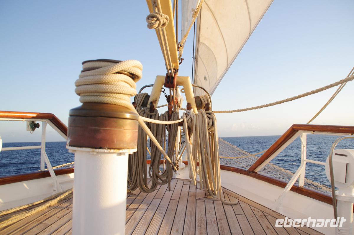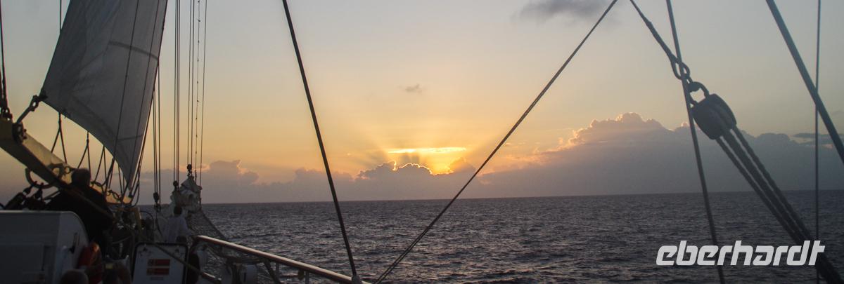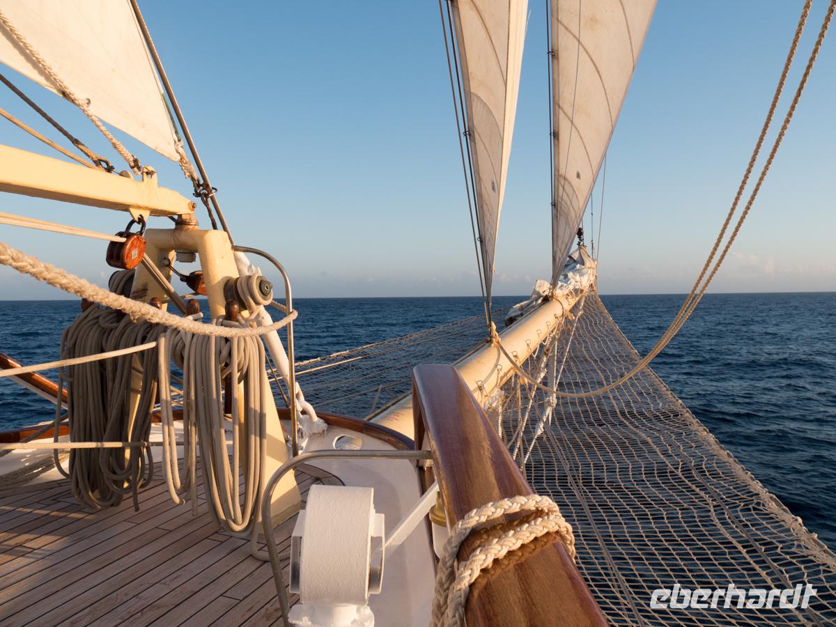 Heute ist der Landgang etwas aufwändiger: zunächst fahren wir mit den Tenderbooten Richtung Cayo Rico. Da es hier aber keinen tiefen Hafen gibt, müssen wir auf See noch einmal in die Zodiacs umsteigen - kein Problem bei ruhiger See! Mit Ankunft an der hölzernen Pier fühlen wir uns wie Robinson Crusoe - eine Insel fast für uns allein mit Puderzuckerstrand und kristallklarem Wasser. Neben dem Rancho entdecken wir Leguane und im seichten Wasser Rochen und Seesterne. Willkommen im kleinen Paradies! Auch für unser leibliches Wohl wird gesorgt - während wir uns die Sonne auf den Bauch scheinen lassen oder am Strand spazieren, bereitet die Crew der Star Flyer ein fantastisches BBQ vor. Dazu ein kühles Bier, was will man mehr?! Zurück an Bord weiht uns Gerald, der 1. Offizier, in die Geheimnisse der Nautik ein (...naja zumindest im Grundkurs). Auf dem Segelschiff gilt anders als auf klassischen Kreuzfahrtschiffen das System der offenen Brücke und so kann jeder hinein schauen und seine Fragen los werden. Immerhin sind hier an Bord 17 Mann zuständig für das Setzen der Segel! Nun müssen wir uns aber etwas hübsch machen, denn heute Abend ist Captains Dinner! Dennoch geht es hier an Bord immer leger zu und der schicke Zwirn kann getrost zu Hause gelassen werden. Das Menü ist wieder einmal vorzüglich, man hat nur die Qual der Wahl zwischen den leckeren Gerichten: Hummer oder Entenbrust? Anschließend zeigt die Crew bei der Talent Show was in ihnen steckt: von Gesang über Comedy bis zu Zauberei ist alles dabei!