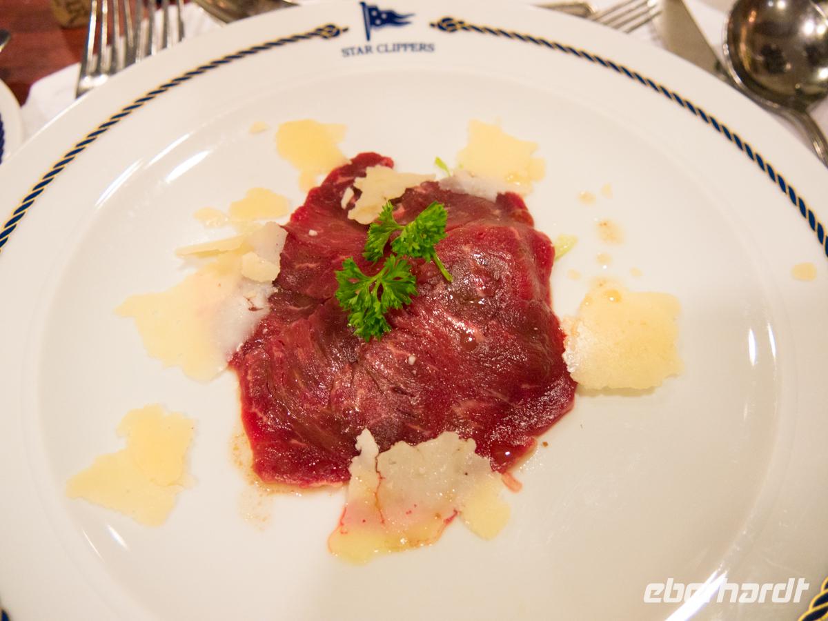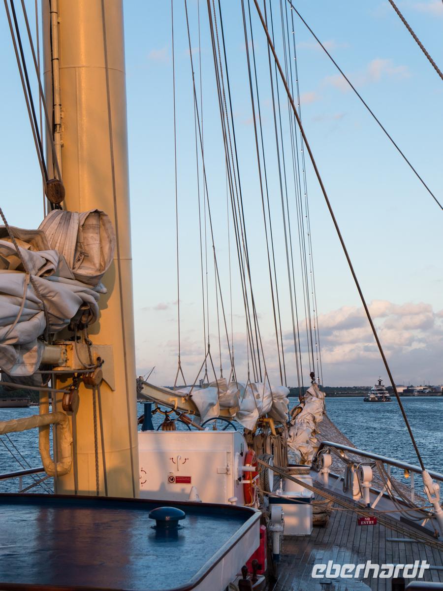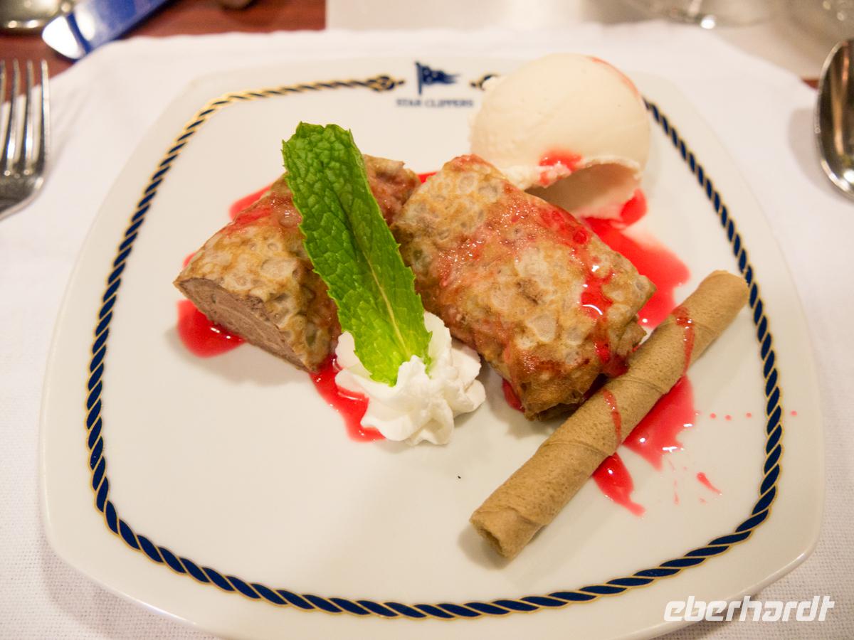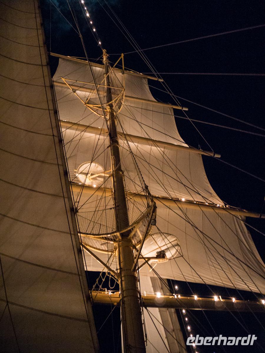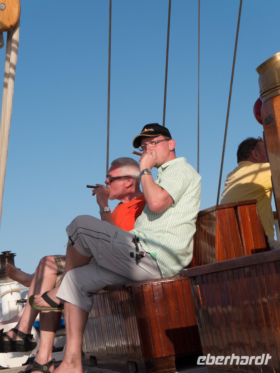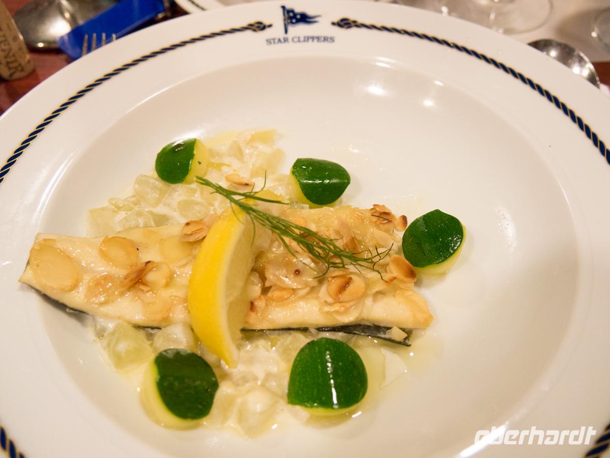Heute ist der Landgang etwas aufwändiger: zunächst fahren wir mit den Tenderbooten Richtung Cayo Rico. Da es hier aber keinen tiefen Hafen gibt, müssen wir auf See noch einmal in die Zodiacs umsteigen - kein Problem bei ruhiger See! Mit Ankunft an der hölzernen Pier fühlen wir uns wie Robinson Crusoe - eine Insel fast für uns allein mit Puderzuckerstrand und kristallklarem Wasser. Neben dem Rancho entdecken wir Leguane und im seichten Wasser Rochen und Seesterne. Willkommen im kleinen Paradies! Auch für unser leibliches Wohl wird gesorgt - während wir uns die Sonne auf den Bauch scheinen lassen oder am Strand spazieren, bereitet die Crew der Star Flyer ein fantastisches BBQ vor. Dazu ein kühles Bier, was will man mehr?! Zurück an Bord weiht uns Gerald, der 1. Offizier, in die Geheimnisse der Nautik ein (...naja zumindest im Grundkurs). Auf dem Segelschiff gilt anders als auf klassischen Kreuzfahrtschiffen das System der offenen Brücke und so kann jeder hinein schauen und seine Fragen los werden. Immerhin sind hier an Bord 17 Mann zuständig für das Setzen der Segel! Nun müssen wir uns aber etwas hübsch machen, denn heute Abend ist Captains Dinner! Dennoch geht es hier an Bord immer leger zu und der schicke Zwirn kann getrost zu Hause gelassen werden. Das Menü ist wieder einmal vorzüglich, man hat nur die Qual der Wahl zwischen den leckeren Gerichten: Hummer oder Entenbrust? Anschließend zeigt die Crew bei der Talent Show was in ihnen steckt: von Gesang über Comedy bis zu Zauberei ist alles dabei!