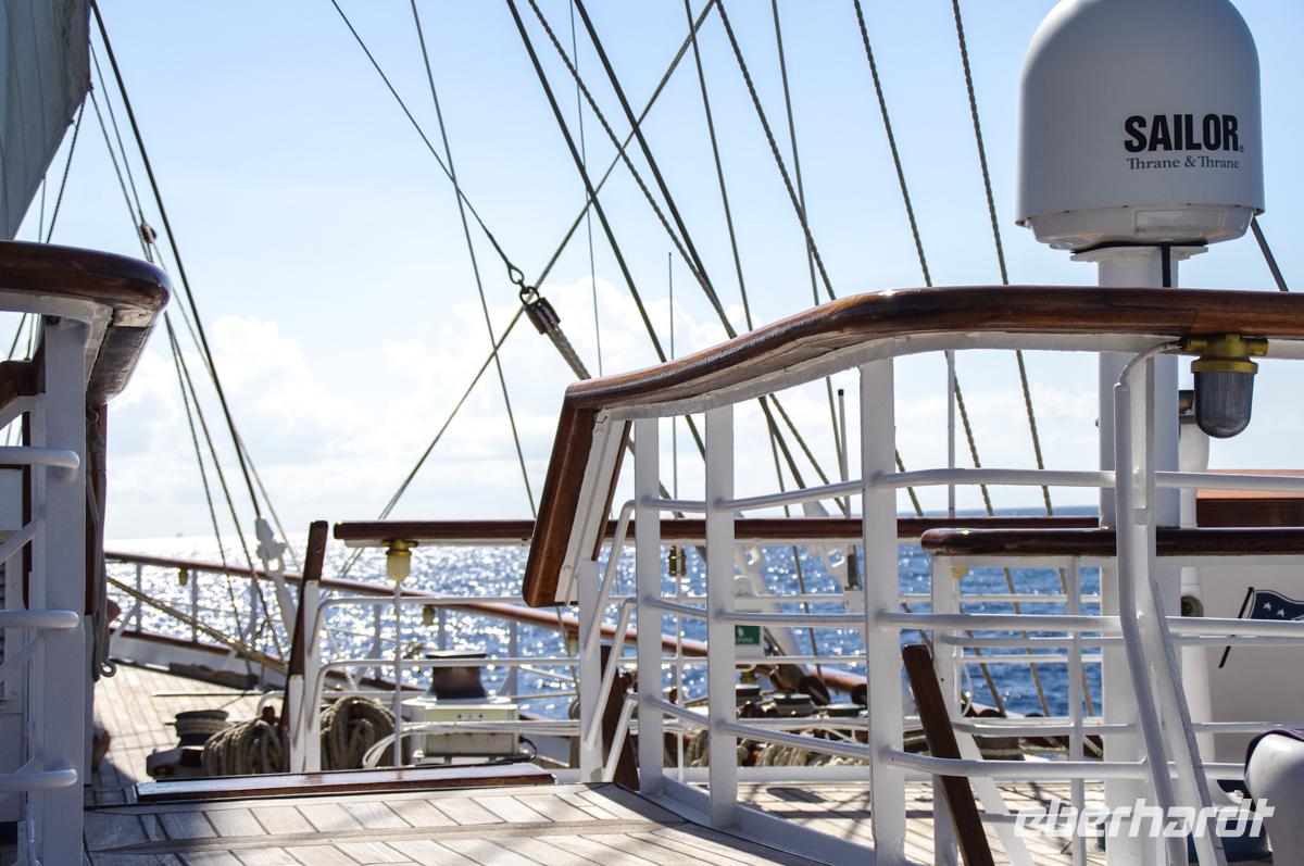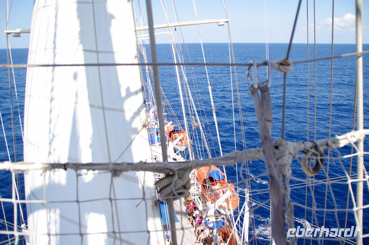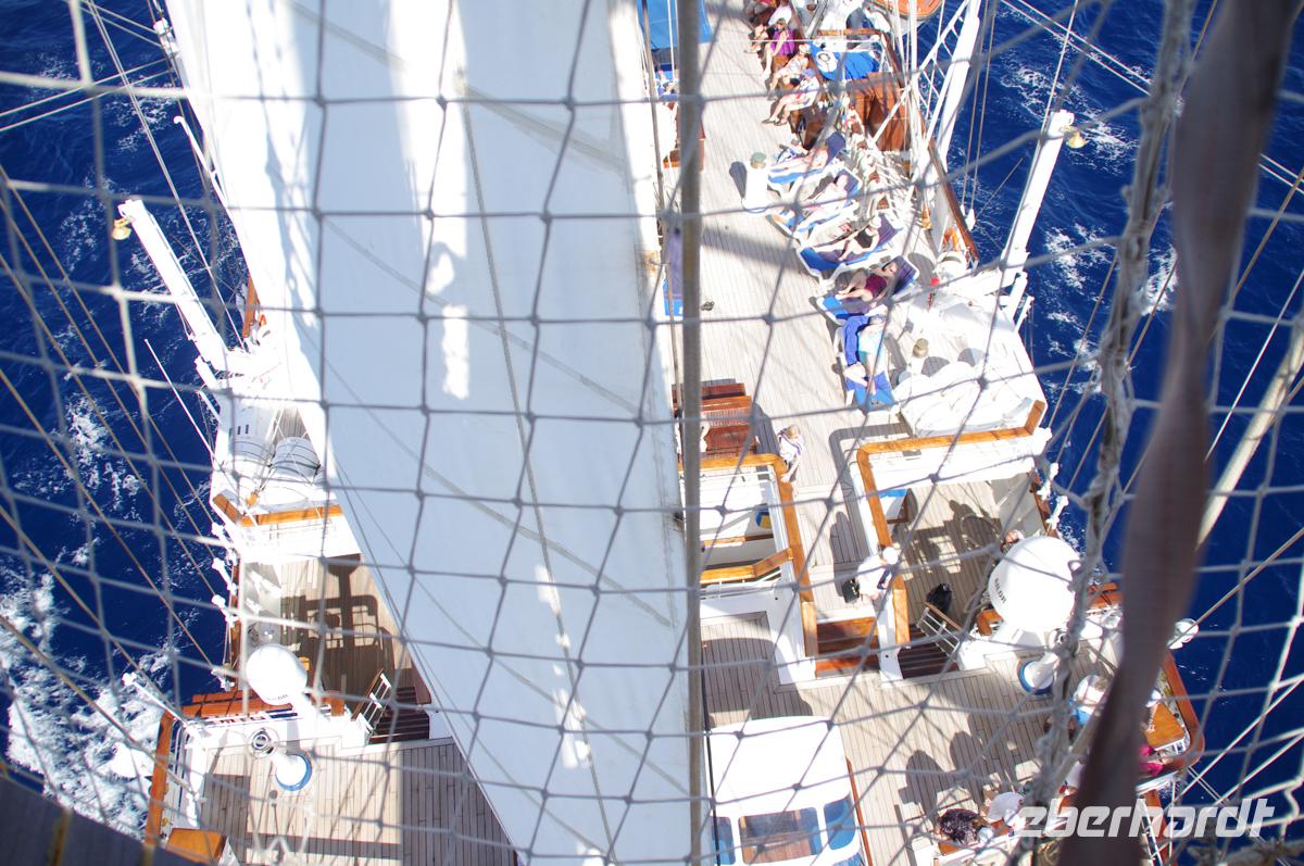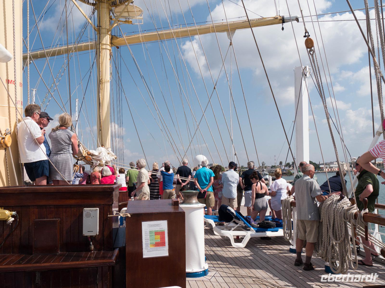 Die erste Nacht auf See verlief sehr geruhsam, nur ein leichtes Schaukeln hat uns in den Schlaf gewiegt. Nach dem Frühstück steht noch ein Mal ein Pflichtprogramm an: der zweite Teil der Seenotrettungsübung. Der Rest des Tages kann nach Belieben gestaltet werden. Wir lernen am Vormittag gleich noch den wichtigsten Mann an Bord kennen - unseren Kapitän Yuriy Slastenin. Seit 1981 fährt der Ukrainer zur See und neben seiner fachlichen Kompetenz glänzt er auch mit einer guten Portion Humor. Er allein kann solch ein Schiff natürlich nicht mit Leben erfüllen und so stellt er uns gleich noch einen Teil seiner 77-köpfigen Crew vor, die sich um das Wohlergehen der 156 Gäste aus 11 Nationen kümmern. Tja, nun stellt sich die Frage: wo ist der schönste Platz an Bord? An so einem herrlichen, sonnigen Seetag natürlich an Deck. Ein leichtes Lüftchen sorgt für ein wenig Erfrischung und die See ist außergewöhnlich ruhig. Was sind wir froh! Man versichert uns, dass die ganze Woche solch gute Aussichten hat - ungewöhnlich gut für kubanische Gewässer! Mit einem guten Buch in der Hand oder in Gedanken auf's Meer schauend, lässt sich der Tag wunderbar genießen. Wer etwas mehr Action mag, kann sich beim Mastklettern versuchen - die ersten vier aus der Gruppe trauen sich schon auf die 10 Meter hohe Plattform. Respekt! Am Abend gibt uns Steffi die wichtigsten Informationen für den morgigen Tag und unseren ersten Hafen Punta Frances. Nach dem Essen darf in der Tropical Bar wieder das Tanzbein geschwungen werden und bei einer Modenschau präsentiert uns die Crew der Star Flyer die Mode aus dem Bord-Shop.