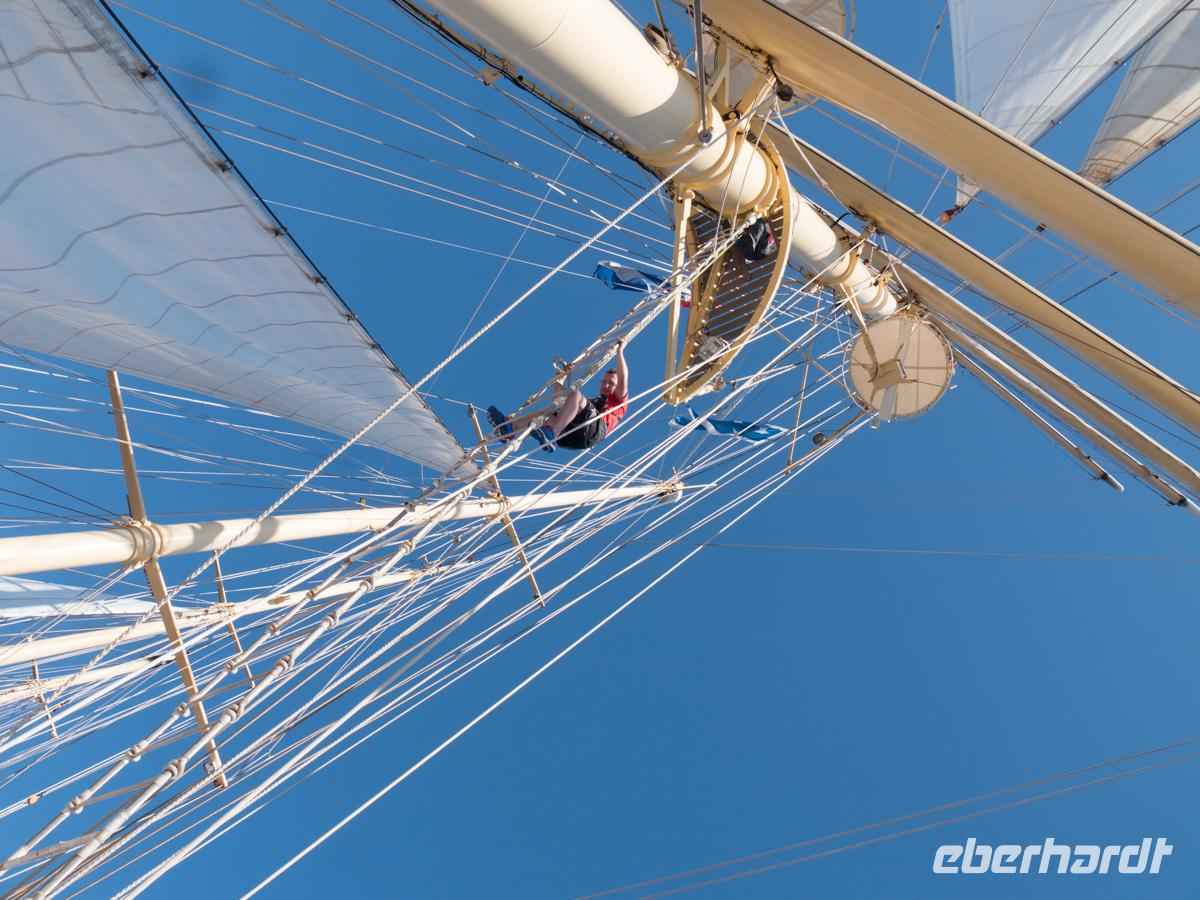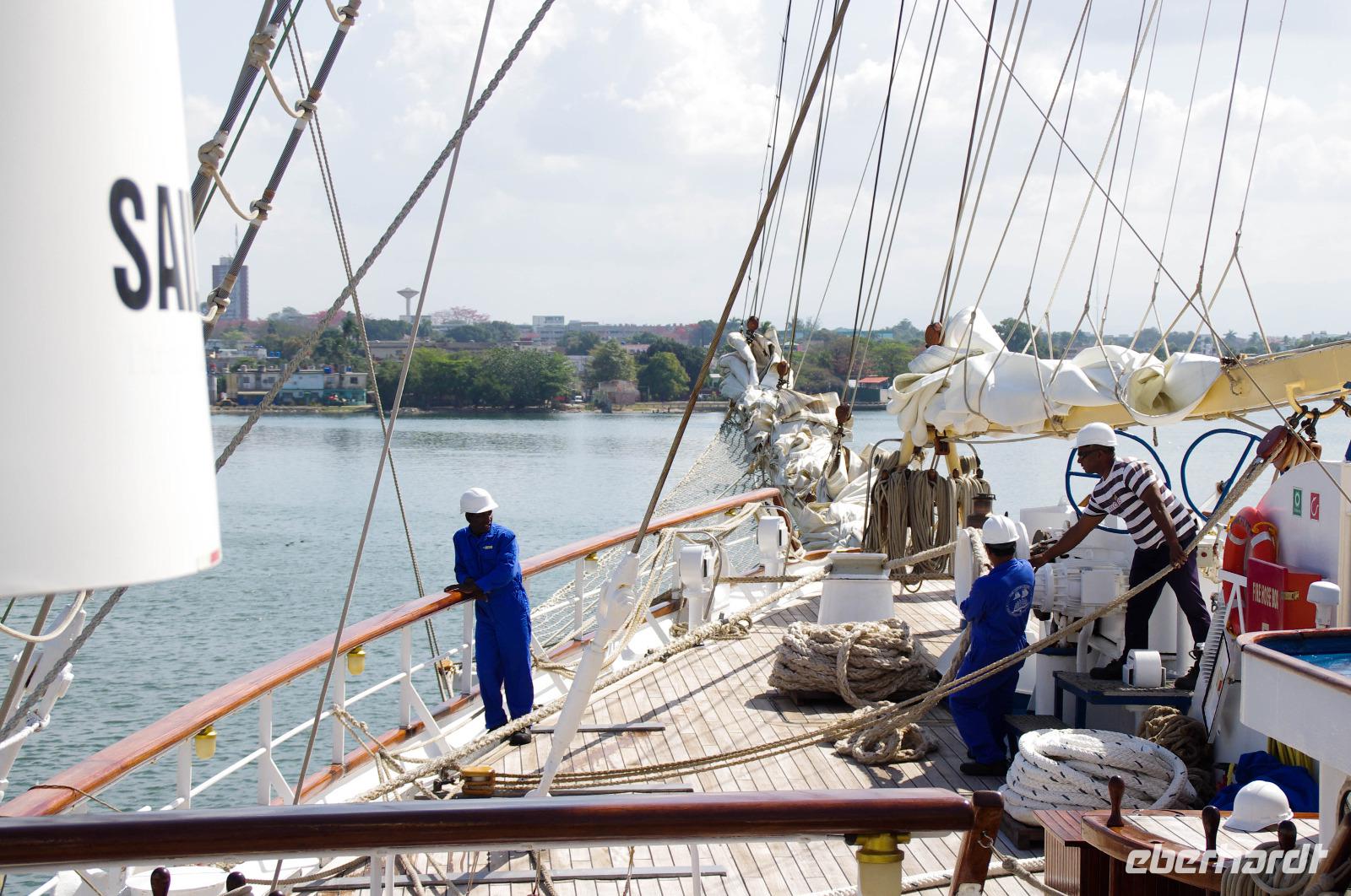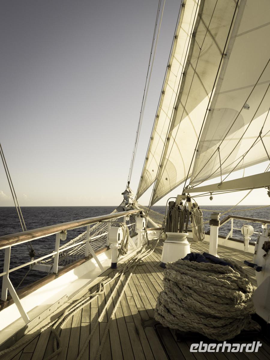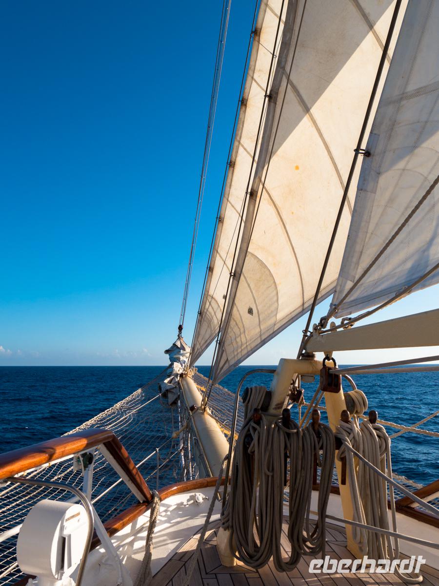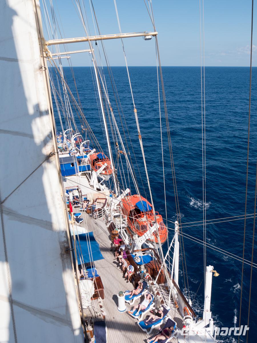 Die erste Nacht auf See verlief sehr geruhsam, nur ein leichtes Schaukeln hat uns in den Schlaf gewiegt. Nach dem Frühstück steht noch ein Mal ein Pflichtprogramm an: der zweite Teil der Seenotrettungsübung. Der Rest des Tages kann nach Belieben gestaltet werden. Wir lernen am Vormittag gleich noch den wichtigsten Mann an Bord kennen - unseren Kapitän Yuriy Slastenin. Seit 1981 fährt der Ukrainer zur See und neben seiner fachlichen Kompetenz glänzt er auch mit einer guten Portion Humor. Er allein kann solch ein Schiff natürlich nicht mit Leben erfüllen und so stellt er uns gleich noch einen Teil seiner 77-köpfigen Crew vor, die sich um das Wohlergehen der 156 Gäste aus 11 Nationen kümmern. Tja, nun stellt sich die Frage: wo ist der schönste Platz an Bord? An so einem herrlichen, sonnigen Seetag natürlich an Deck. Ein leichtes Lüftchen sorgt für ein wenig Erfrischung und die See ist außergewöhnlich ruhig. Was sind wir froh! Man versichert uns, dass die ganze Woche solch gute Aussichten hat - ungewöhnlich gut für kubanische Gewässer! Mit einem guten Buch in der Hand oder in Gedanken auf's Meer schauend, lässt sich der Tag wunderbar genießen. Wer etwas mehr Action mag, kann sich beim Mastklettern versuchen - die ersten vier aus der Gruppe trauen sich schon auf die 10 Meter hohe Plattform. Respekt! Am Abend gibt uns Steffi die wichtigsten Informationen für den morgigen Tag und unseren ersten Hafen Punta Frances. Nach dem Essen darf in der Tropical Bar wieder das Tanzbein geschwungen werden und bei einer Modenschau präsentiert uns die Crew der Star Flyer die Mode aus dem Bord-Shop.