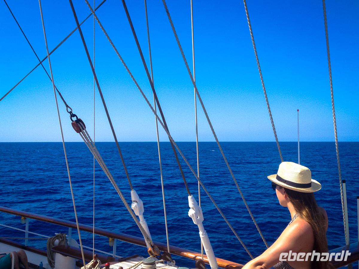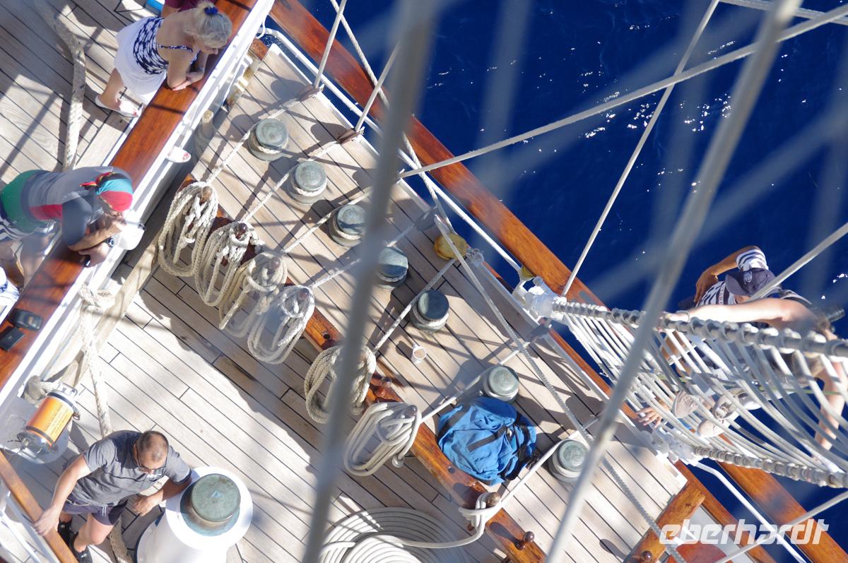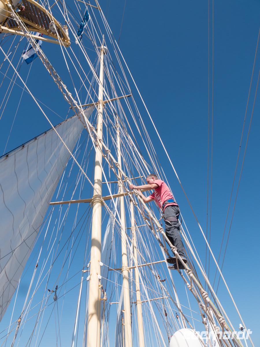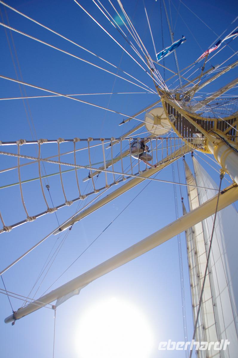 Die erste Nacht auf See verlief sehr geruhsam, nur ein leichtes Schaukeln hat uns in den Schlaf gewiegt. Nach dem Frühstück steht noch ein Mal ein Pflichtprogramm an: der zweite Teil der Seenotrettungsübung. Der Rest des Tages kann nach Belieben gestaltet werden. Wir lernen am Vormittag gleich noch den wichtigsten Mann an Bord kennen - unseren Kapitän Yuriy Slastenin. Seit 1981 fährt der Ukrainer zur See und neben seiner fachlichen Kompetenz glänzt er auch mit einer guten Portion Humor. Er allein kann solch ein Schiff natürlich nicht mit Leben erfüllen und so stellt er uns gleich noch einen Teil seiner 77-köpfigen Crew vor, die sich um das Wohlergehen der 156 Gäste aus 11 Nationen kümmern. Tja, nun stellt sich die Frage: wo ist der schönste Platz an Bord? An so einem herrlichen, sonnigen Seetag natürlich an Deck. Ein leichtes Lüftchen sorgt für ein wenig Erfrischung und die See ist außergewöhnlich ruhig. Was sind wir froh! Man versichert uns, dass die ganze Woche solch gute Aussichten hat - ungewöhnlich gut für kubanische Gewässer! Mit einem guten Buch in der Hand oder in Gedanken auf's Meer schauend, lässt sich der Tag wunderbar genießen. Wer etwas mehr Action mag, kann sich beim Mastklettern versuchen - die ersten vier aus der Gruppe trauen sich schon auf die 10 Meter hohe Plattform. Respekt! Am Abend gibt uns Steffi die wichtigsten Informationen für den morgigen Tag und unseren ersten Hafen Punta Frances. Nach dem Essen darf in der Tropical Bar wieder das Tanzbein geschwungen werden und bei einer Modenschau präsentiert uns die Crew der Star Flyer die Mode aus dem Bord-Shop.