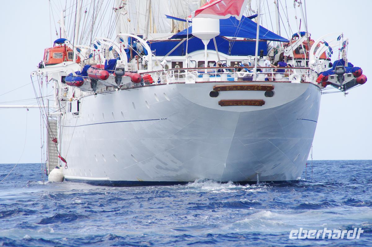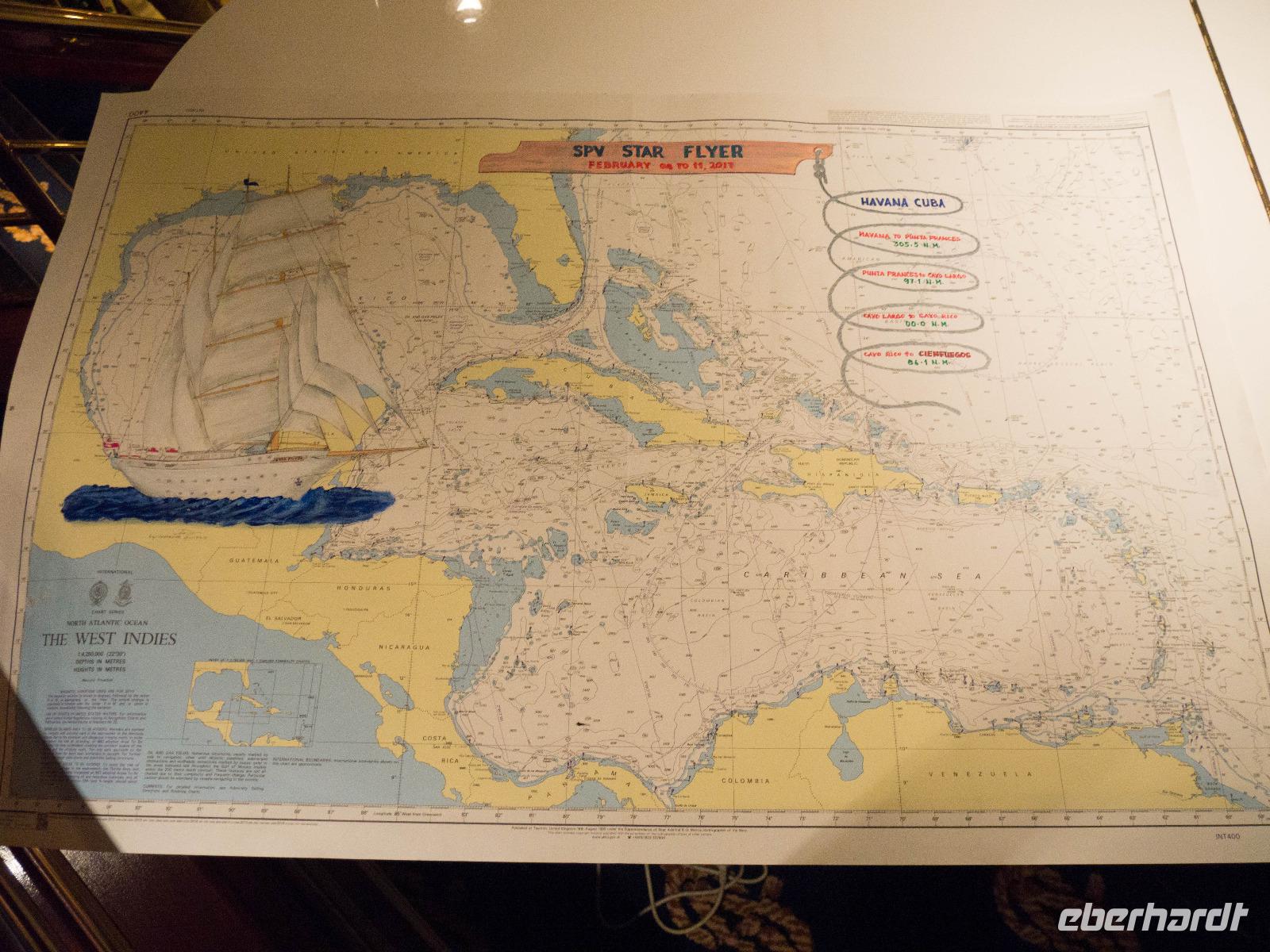 Gegen 09.00 Uhr erreichen wir die Isla de Juventud, die Insel der Jugend. Für den heutigen Landgang ist Tendern vorgesehen und die Star Fler driftet vor der Insel, da im Marinepark kein Ankern gestattet ist. Der erste Tender ist bereits an Land, um die Behörden an Bord zu bringen. Dann jedoch die Hiobs-Botschaft, dass das Auto kaputt wäre (kann in Kuba ja vorkommen) und dass die Behörden daher nicht zum Hafen kommen können und damit keine Freigabe des Schiffes erfolgen kann. Wie viel Wahrheit seitens der kubanischen Behörden darin steckt, sei dahin gestellt. Kapitän Yuriy nutzt die Wartezeit zur Freude der Passagiere für den Foto-Tender: zwei Tender kreisen um die Star Flyer, die jetzt komplett unter Segel gesetzt wird und wir haben so Gelegenheit, den majestätischen Viermaster aus allen Richtungen zu fotografieren. Toll! In der Tropical Bar wird inzwischen ein wunderbares BBQ-Buffet aufgebaut und während wir schlemmen, segeln wir davon. Nach einem entspannten Nachmittag an Bord, lädt die Crew am Abend zu leckeren Cocktails ein und beim Abendessen lassen wir erneut unseren Gaumen verwöhnen.