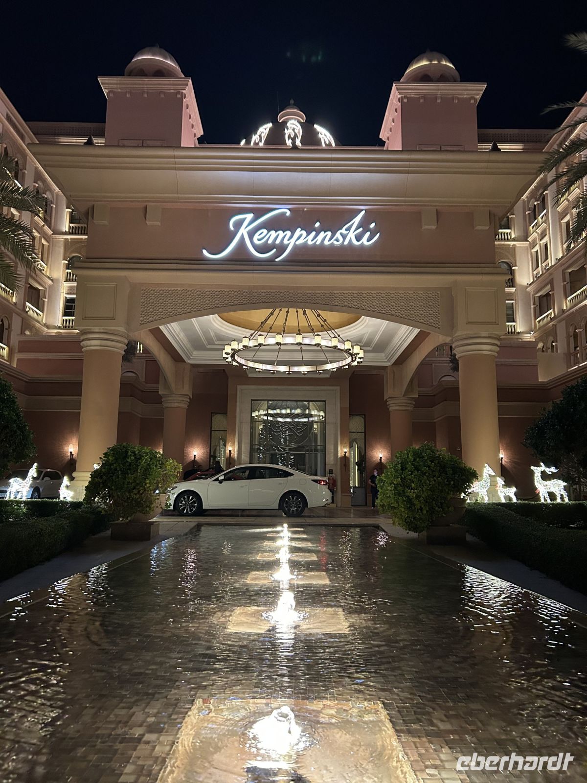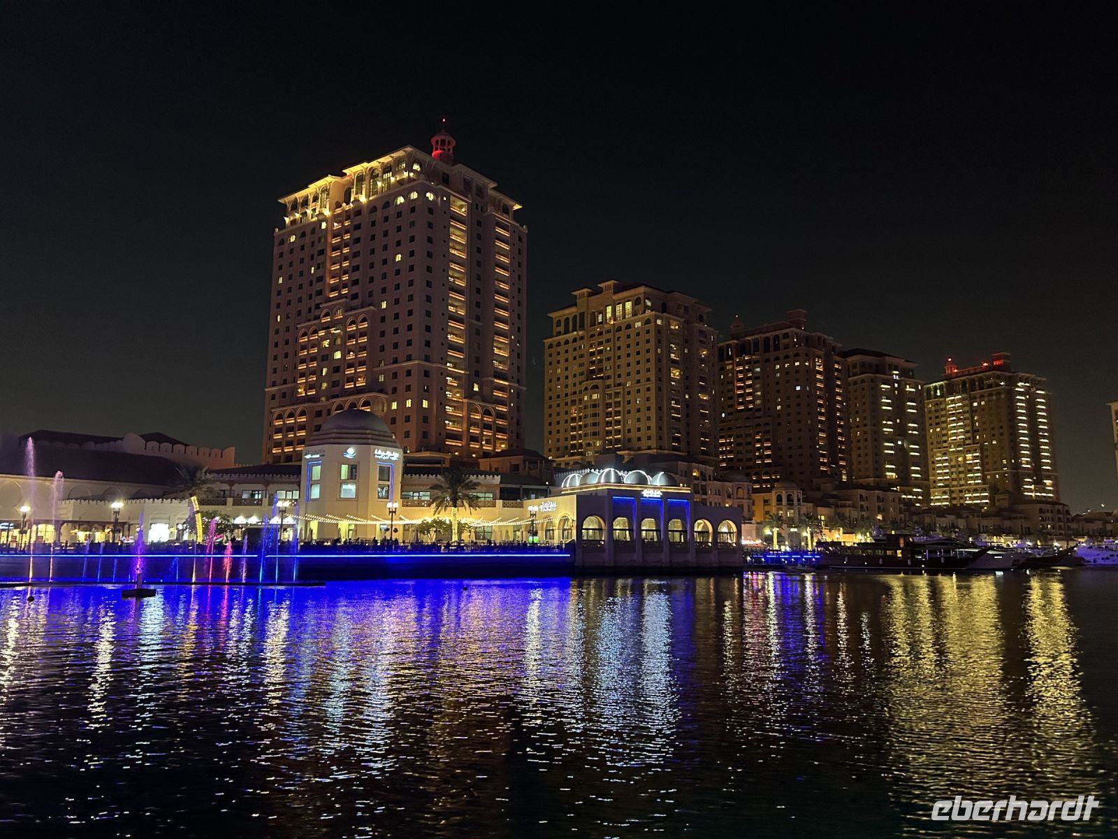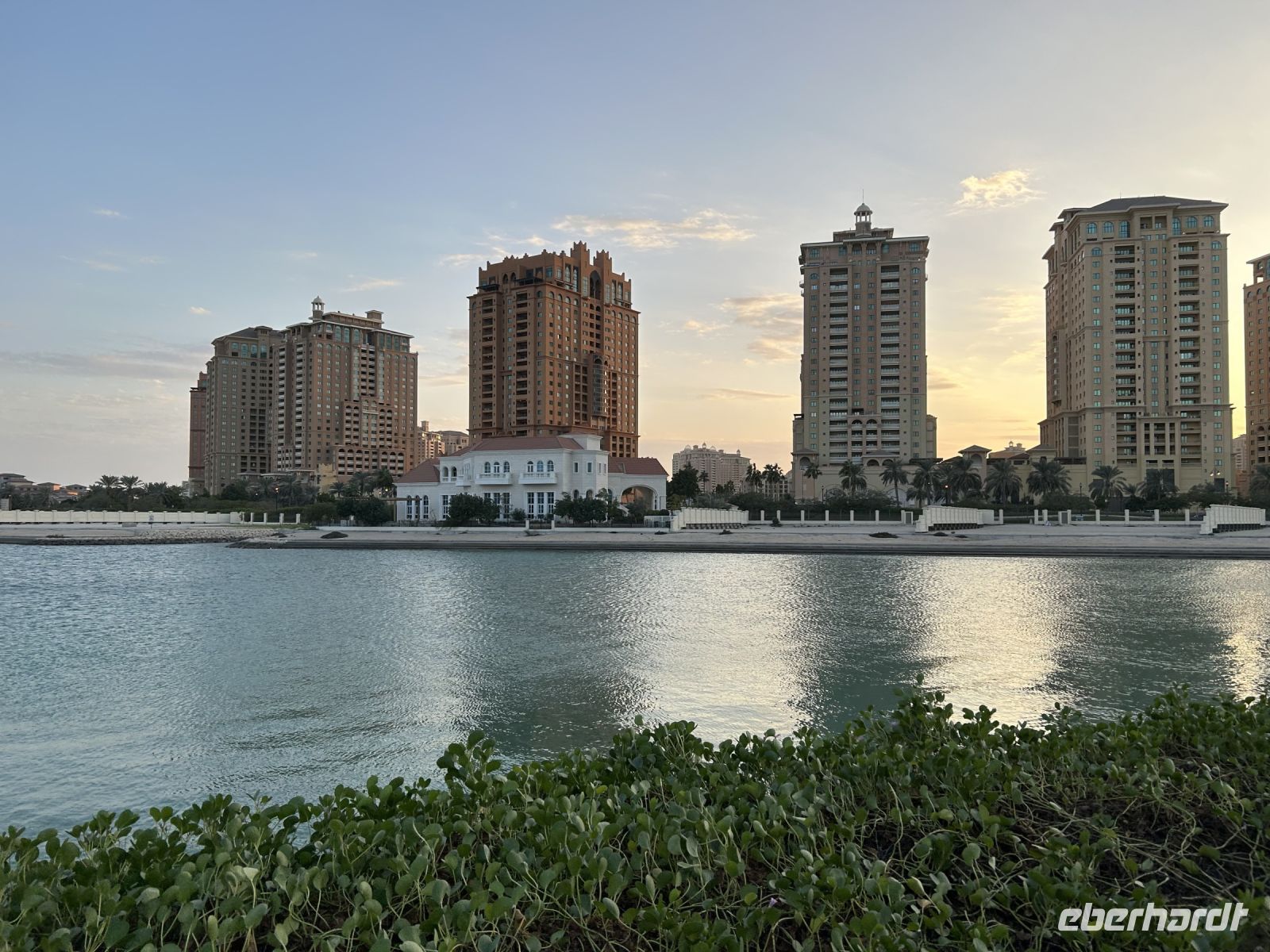 Nach knapp 5,5 Stunden Flug landen wir auf dem Hamad International Airport in Doha, passieren die Einreise (die auch hier ungewöhnlich lange dauert) und nehmen unsere Koffer entgegen. Freudestrahlend erwartet uns schon unser Reiseleiter Osman und begleitet uns zum Kempinski Marsa Malaz auf dem Megaprojekt The Pearl. Wir checken ein, beziehen unsere geräumigen Zimmer und starten unseren Aufenthalt hier auf der Dachterrasse des Hotels bei einem Drink und einem kleinen Abendessen. Inzwischen reisen auch unsere 3 Gäste aus Frankfurt an und somit ist unsere kleine Reisefamilie komplett.