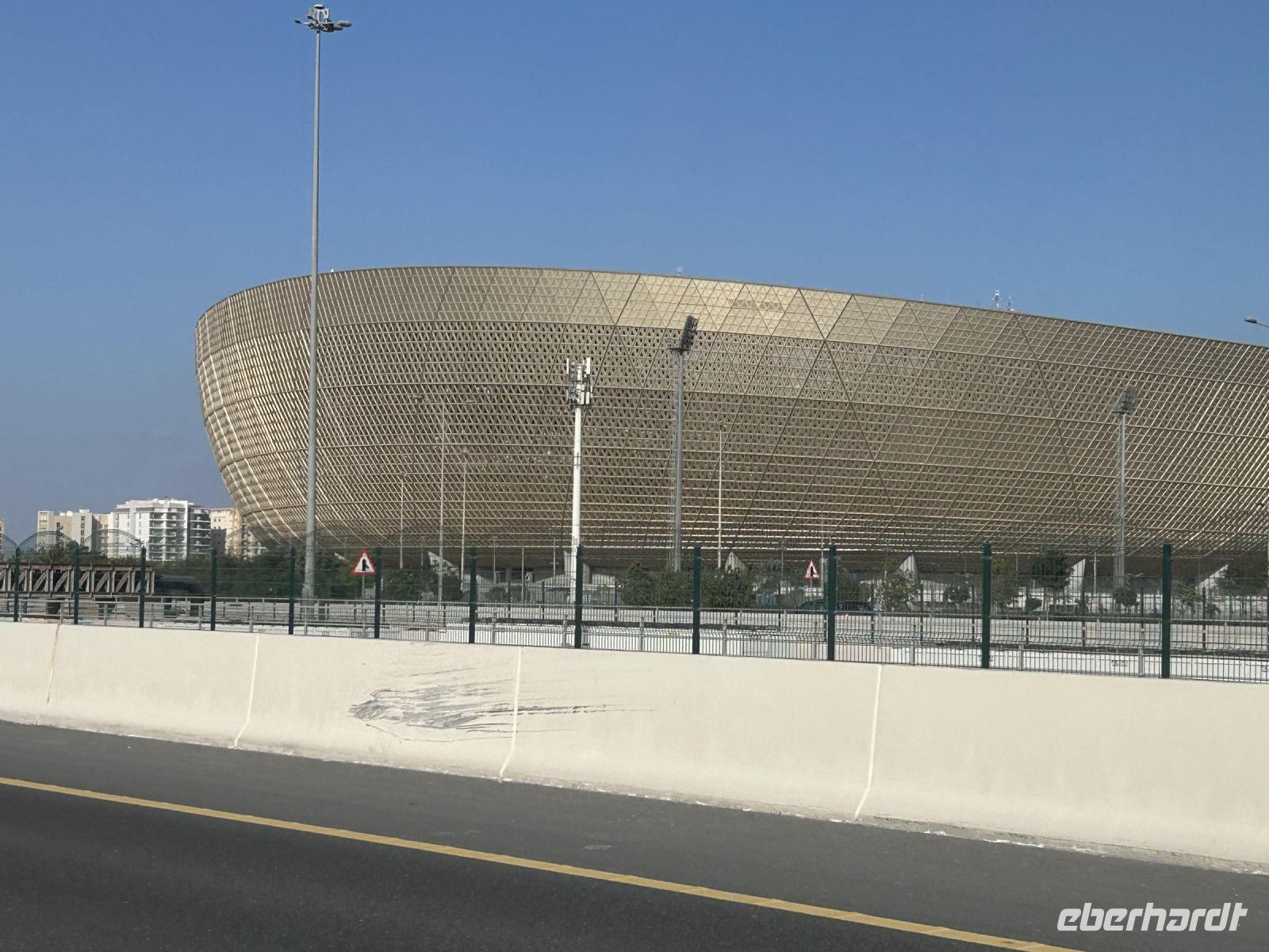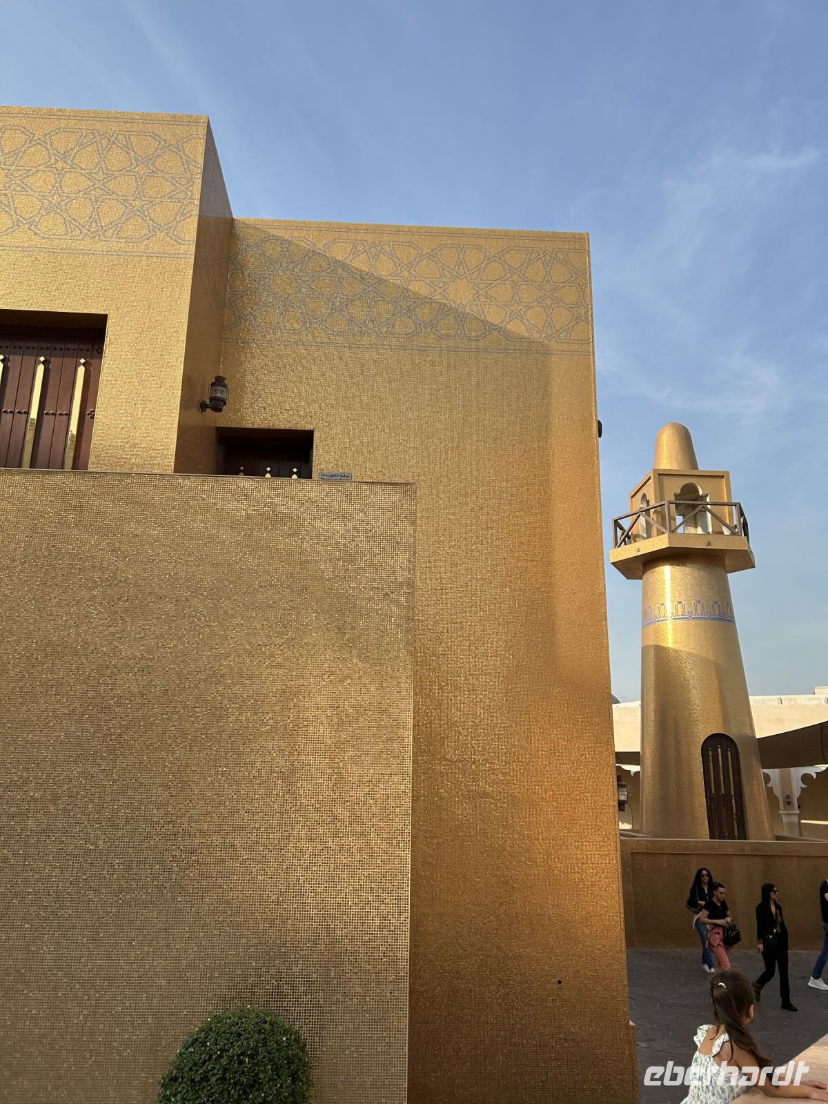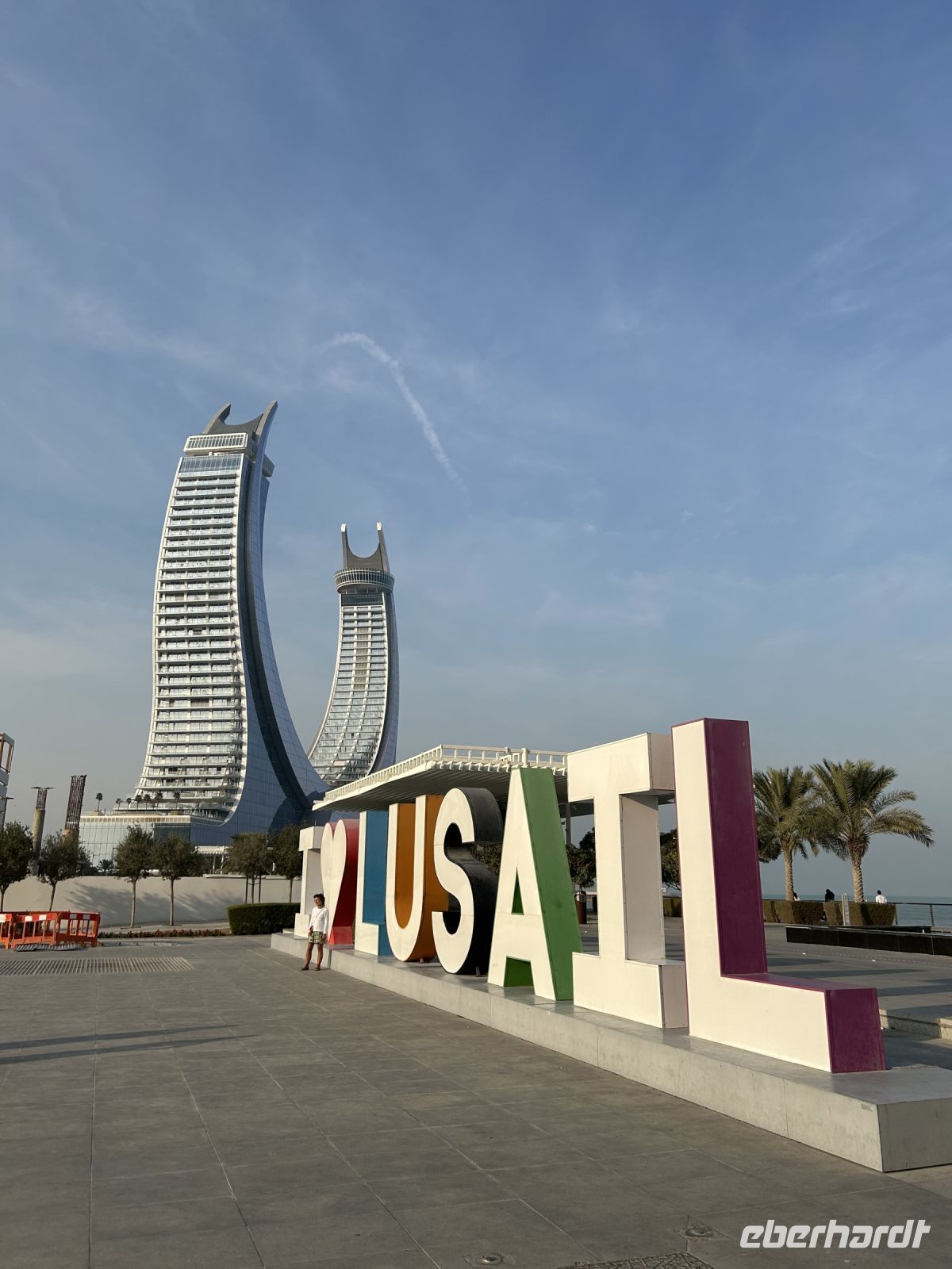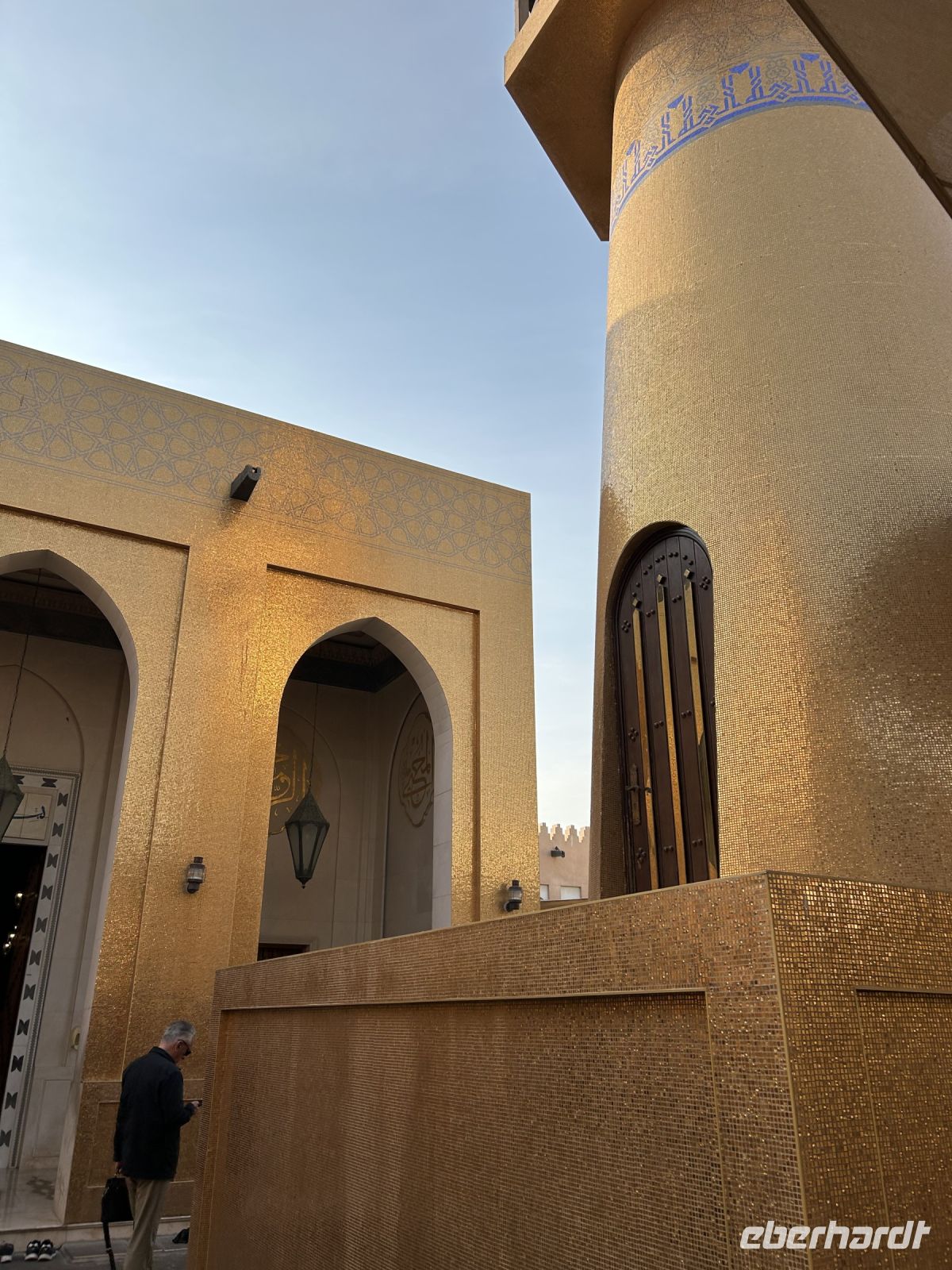 Bevor wir Katara verlassen, schlendern wir noch an der Goldenen Moschee vorbei, die in der Sonne hell funkelt. Man könnte sicher den ganzen Tag hier verbringen, denn es gibt noch zahlreiche Galerien, ein Planetarium und Museen. Doch wir fahren nun nach Lusail City, ein Urbanisierungsprojekt im Norden Dohas. Hier legen wir einen Fotostopp vor den markanten Katara-Towers ein.