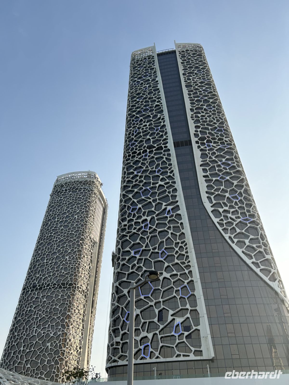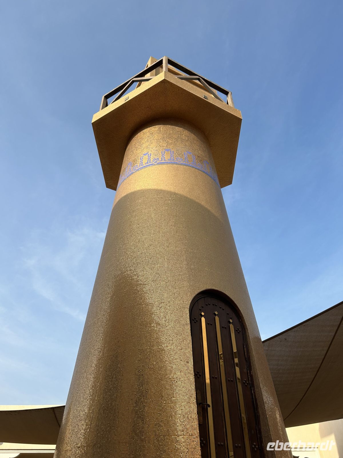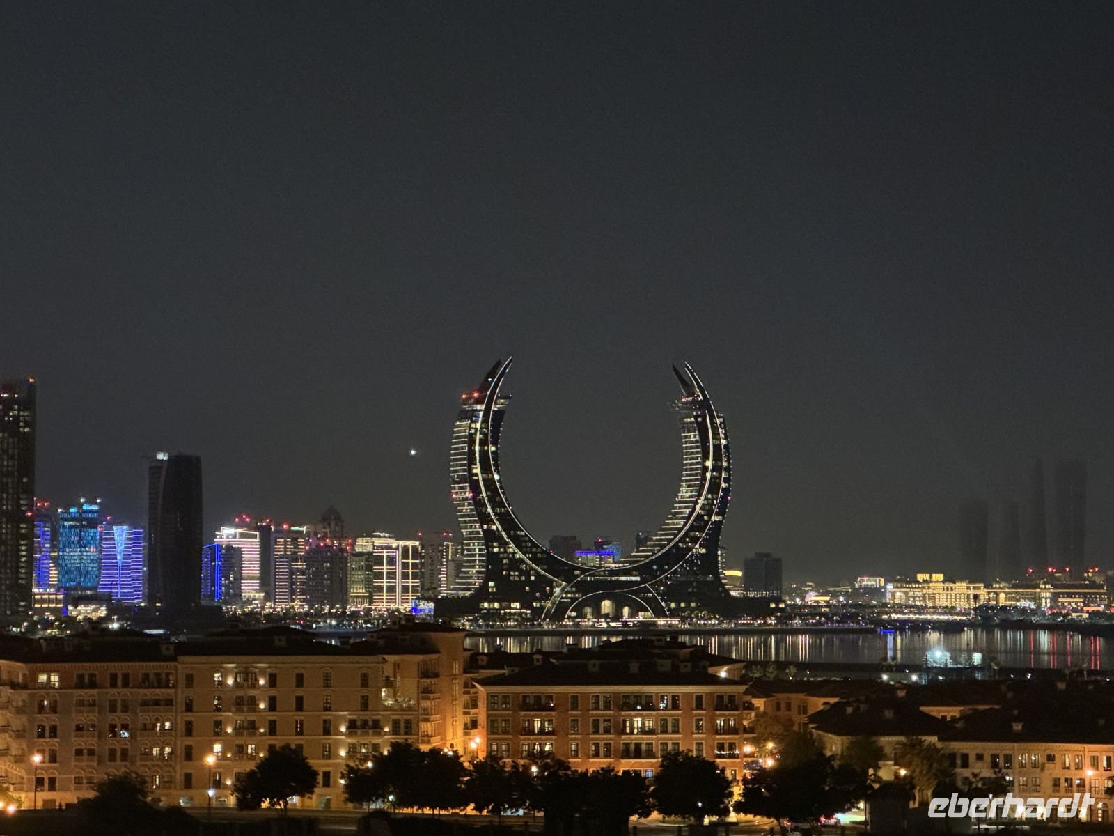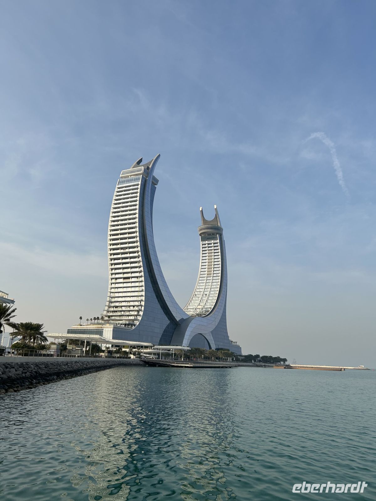Bevor wir Katara verlassen, schlendern wir noch an der Goldenen Moschee vorbei, die in der Sonne hell funkelt. Man könnte sicher den ganzen Tag hier verbringen, denn es gibt noch zahlreiche Galerien, ein Planetarium und Museen. Doch wir fahren nun nach Lusail City, ein Urbanisierungsprojekt im Norden Dohas. Hier legen wir einen Fotostopp vor den markanten Katara-Towers ein.