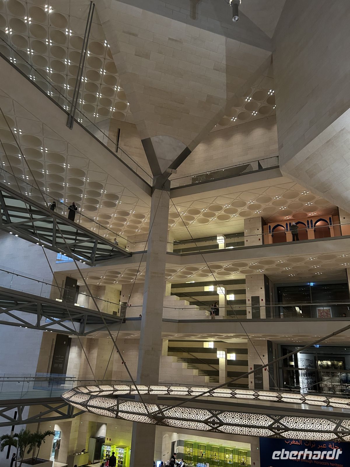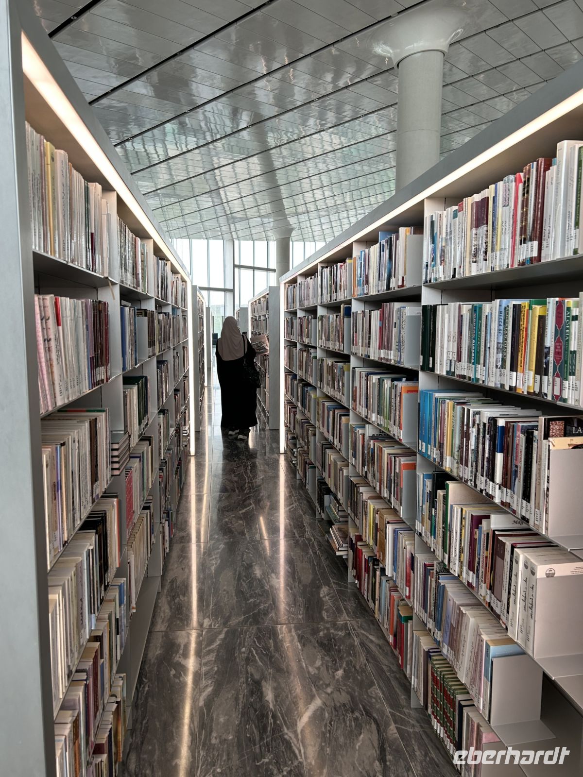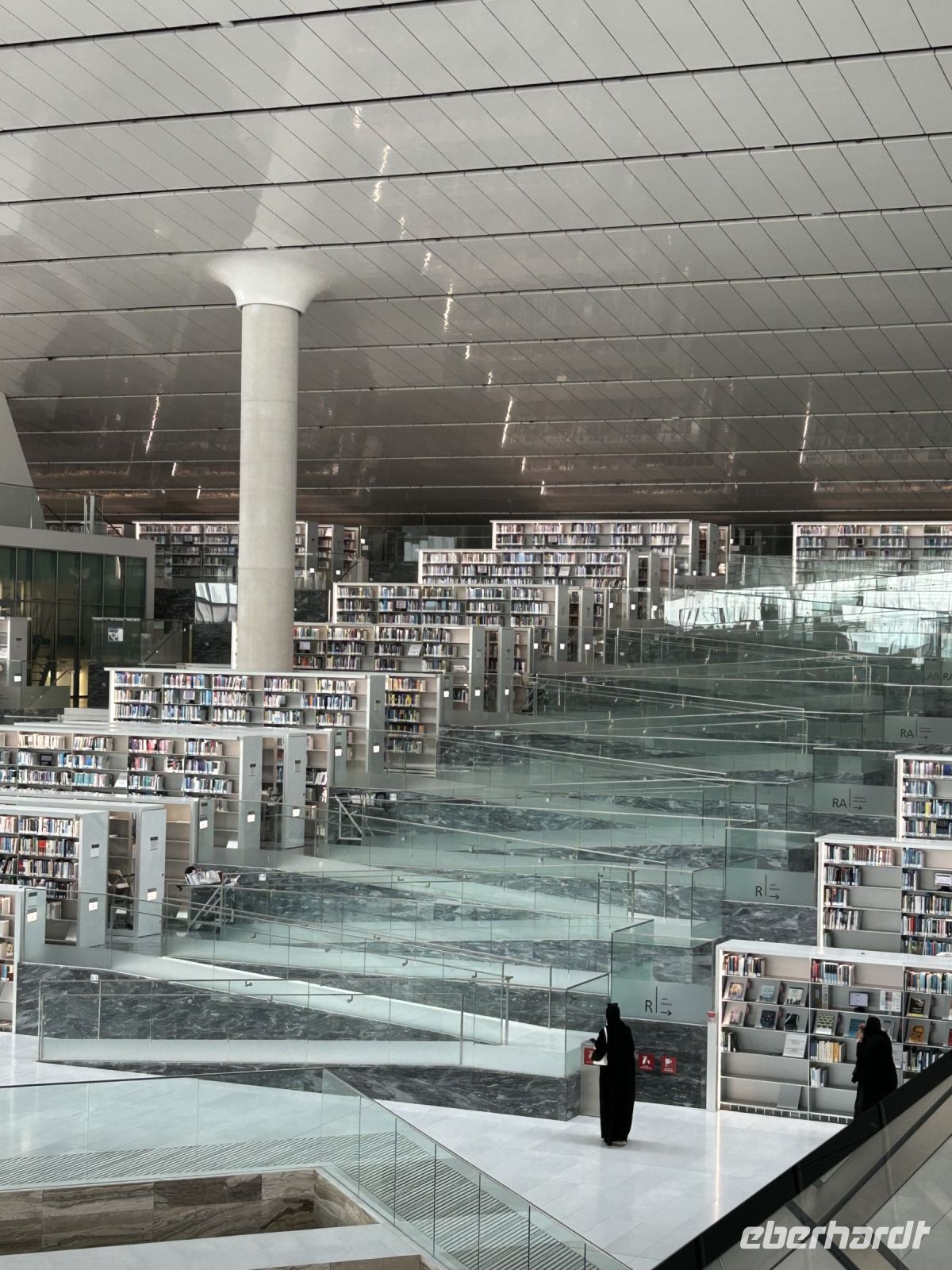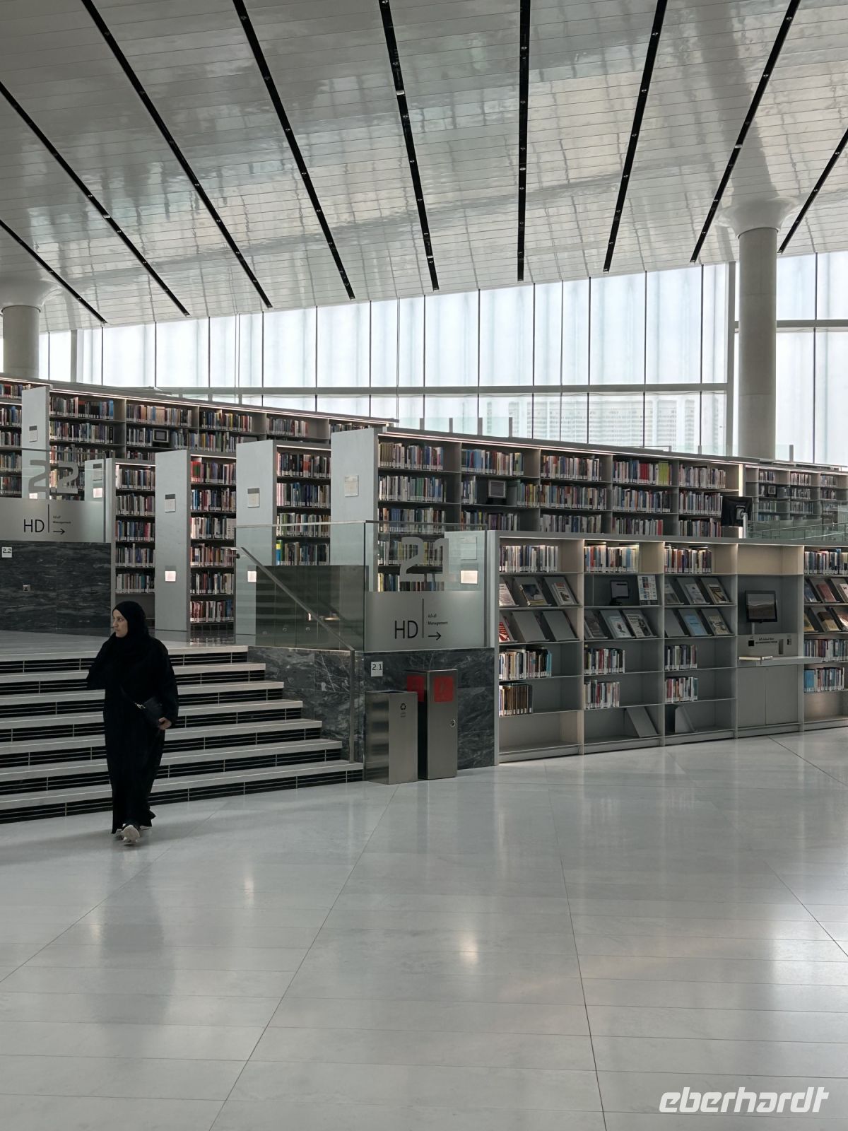 Anschließend statten wir der beeindruckenden Nationalbibliothek von Katar (Qatar National Library) einen Besuch ab. Auch hier beeindruckt zunächst das Äußere des von Rem Koolhaas entworfenen Gebäudes. Im Inneren sind Licht, Luft und Sichtbarkeit die Markenzeichen der innovativen Bibliothek. Die Bücherregale selbst sind ein wesentlicher Bestandteil der Architektur: Sie scheinen aus dem Boden emporzuwachsen und verdeutlichen den Wert, den Bücher in der Kultur Katars haben.