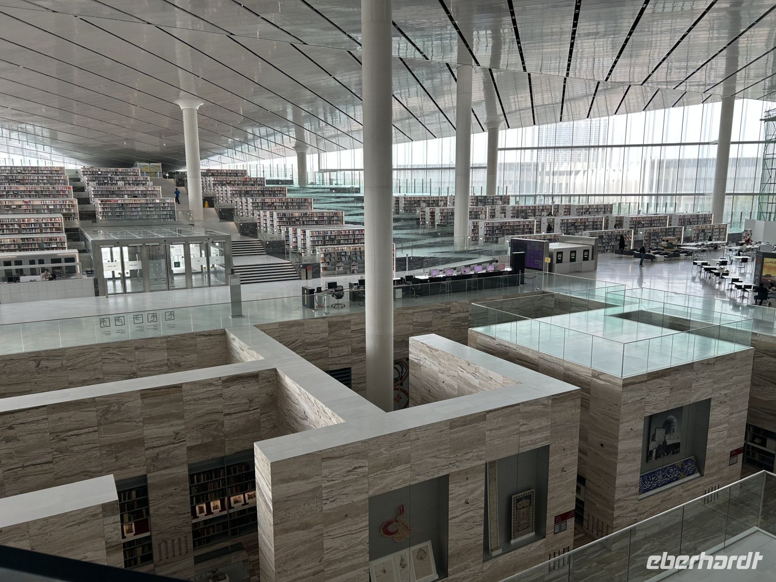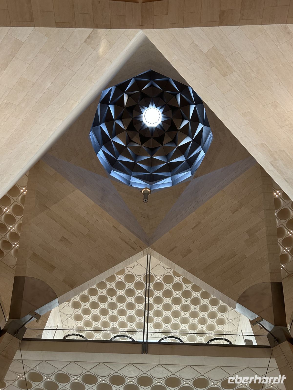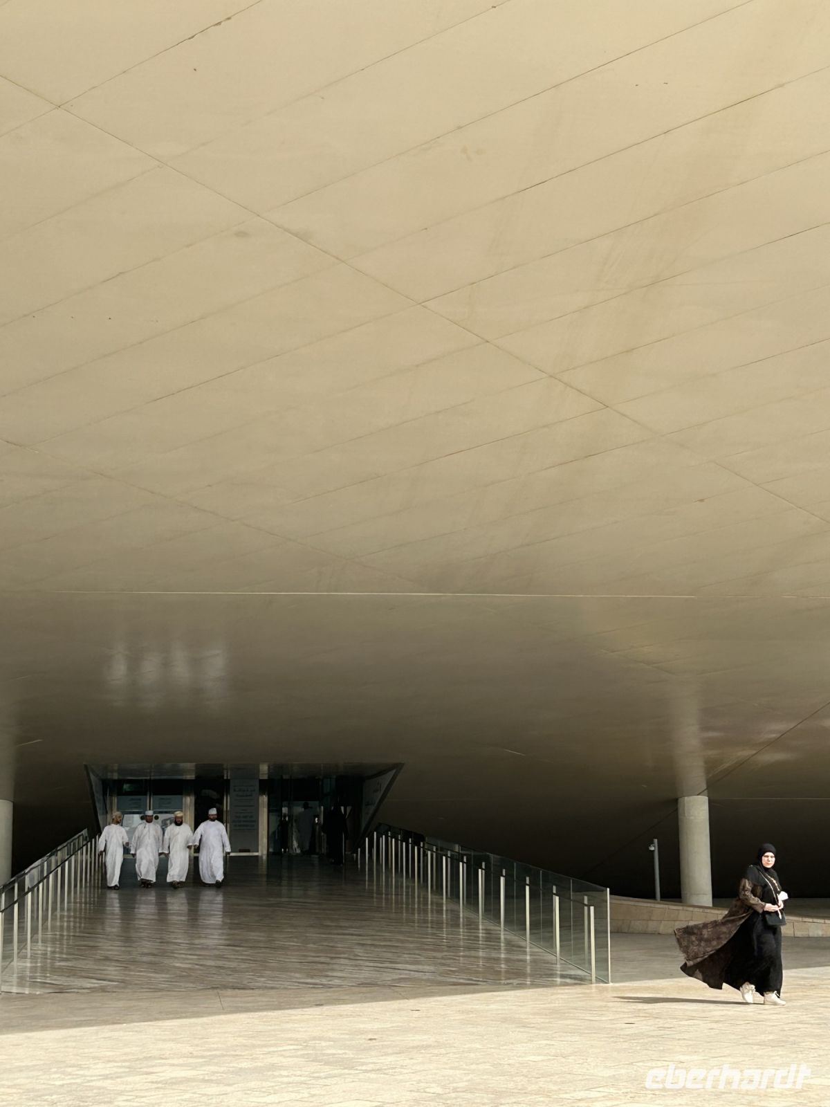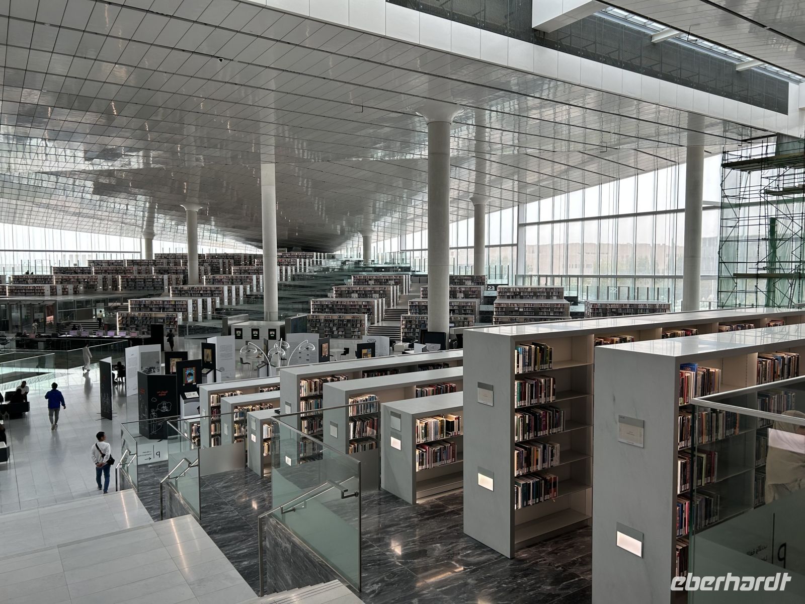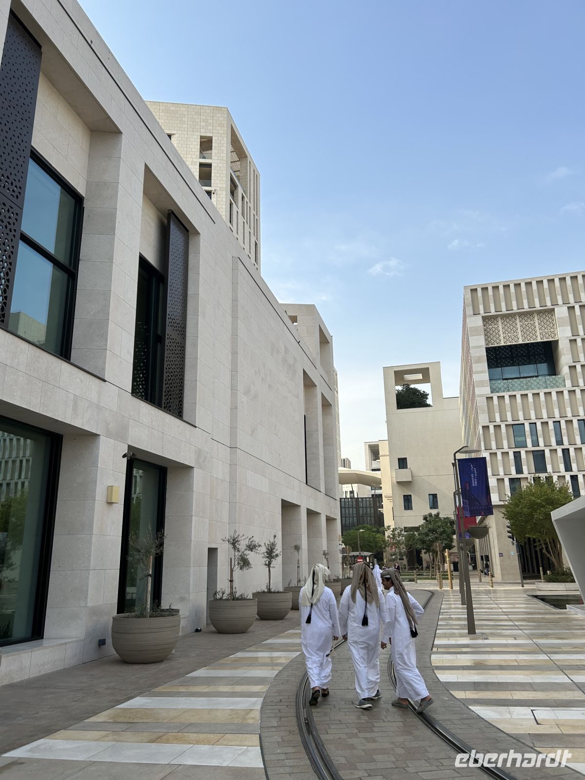 Anschließend statten wir der beeindruckenden Nationalbibliothek von Katar (Qatar National Library) einen Besuch ab. Auch hier beeindruckt zunächst das Äußere des von Rem Koolhaas entworfenen Gebäudes. Im Inneren sind Licht, Luft und Sichtbarkeit die Markenzeichen der innovativen Bibliothek. Die Bücherregale selbst sind ein wesentlicher Bestandteil der Architektur: Sie scheinen aus dem Boden emporzuwachsen und verdeutlichen den Wert, den Bücher in der Kultur Katars haben.