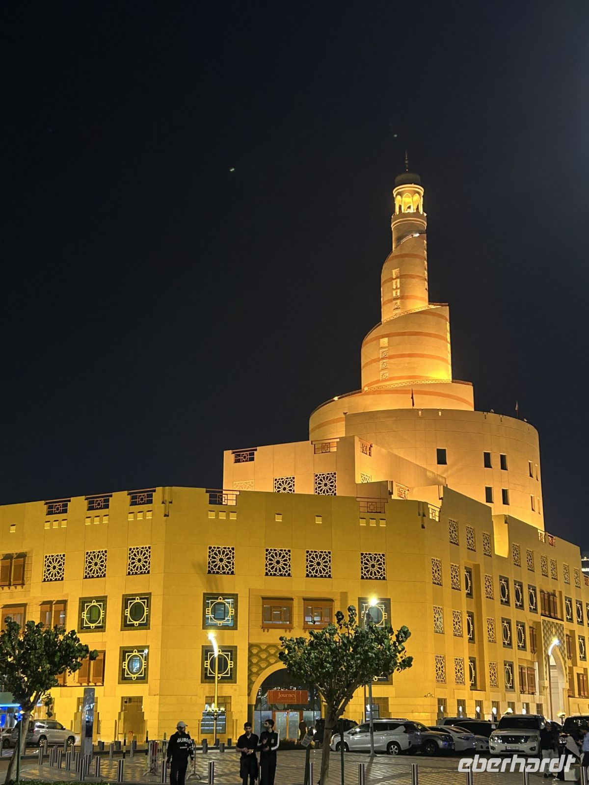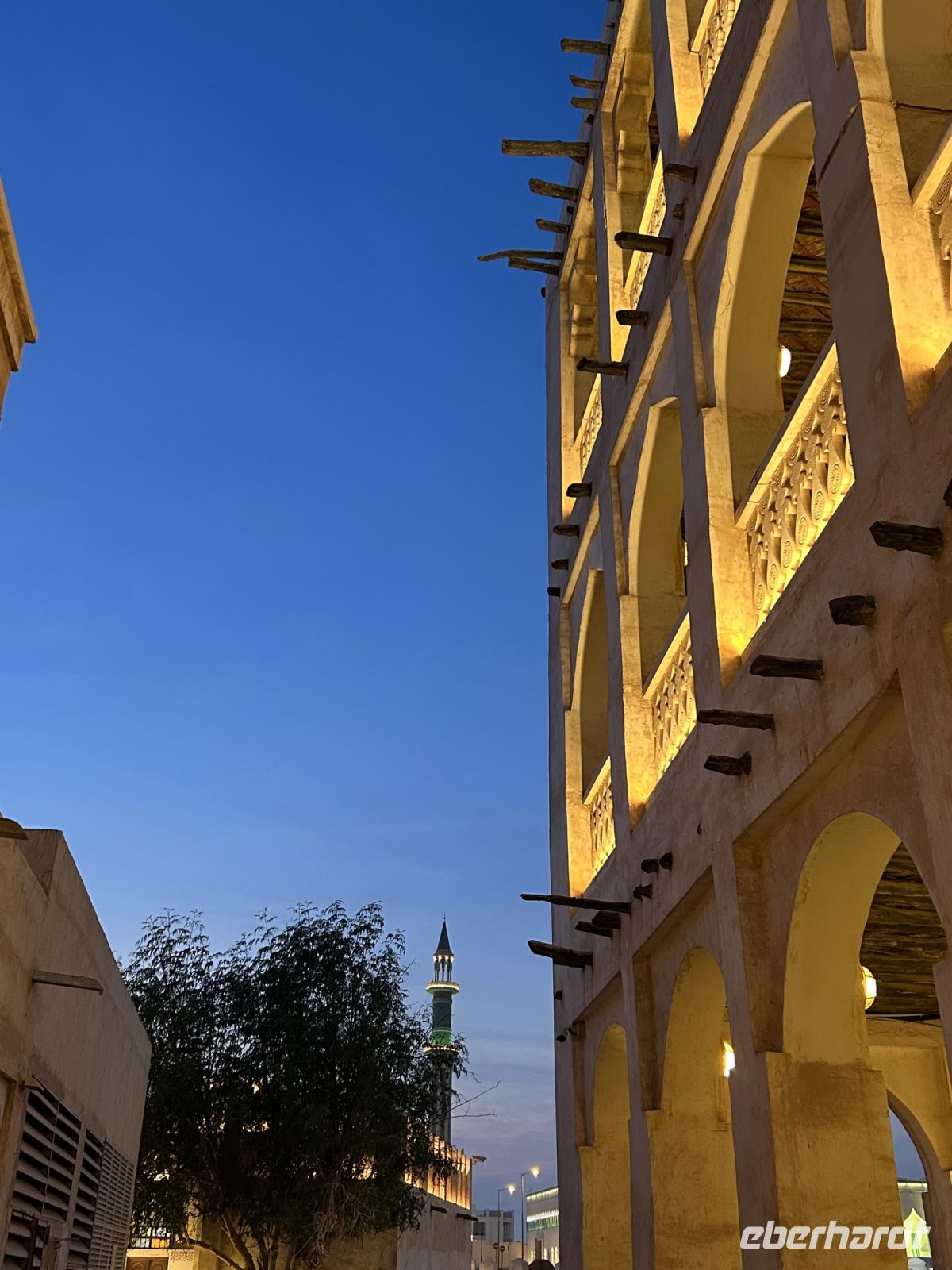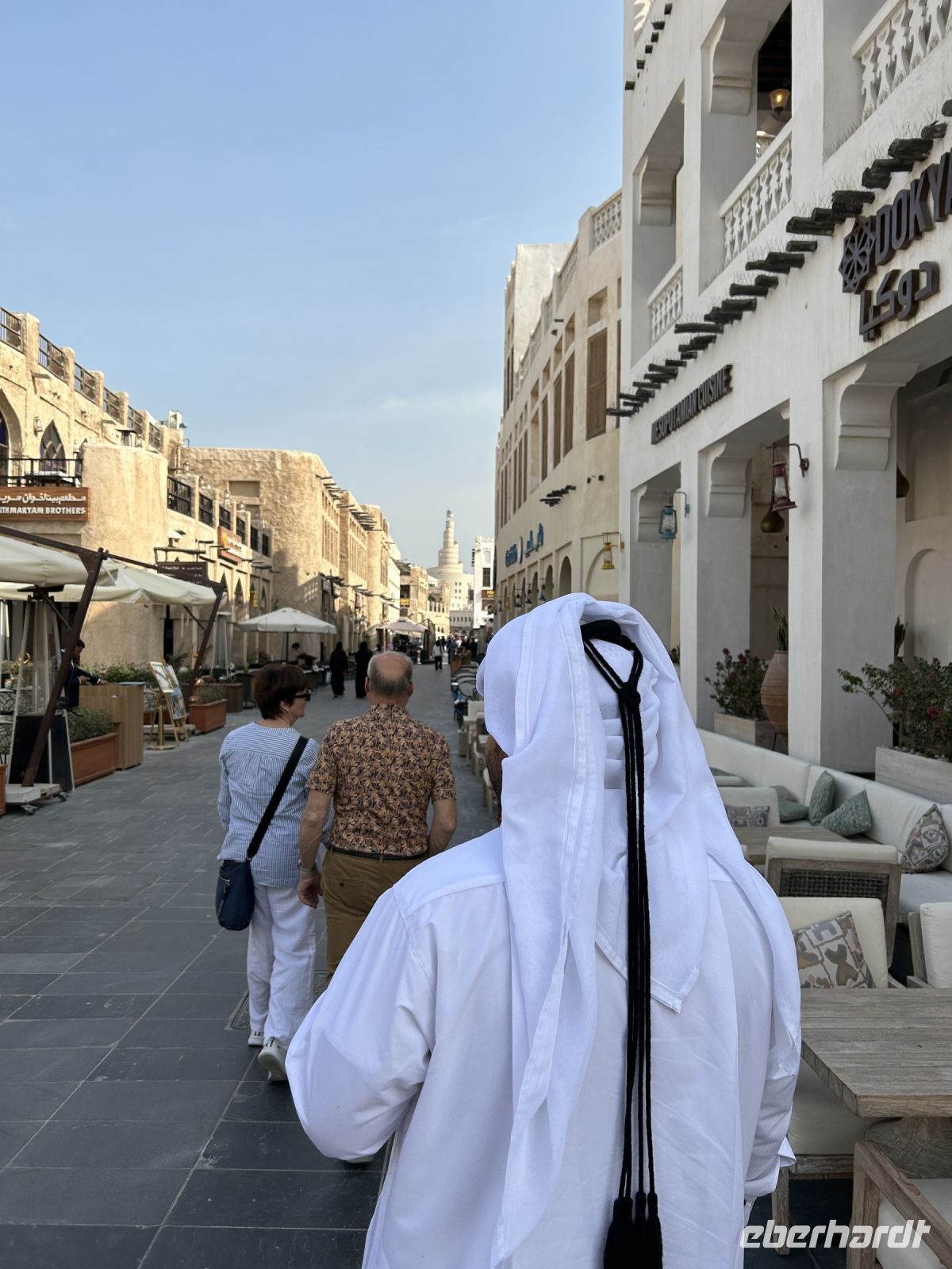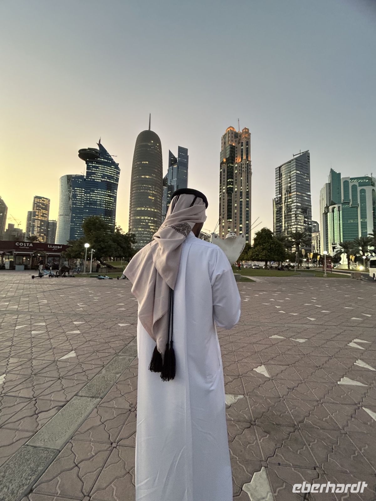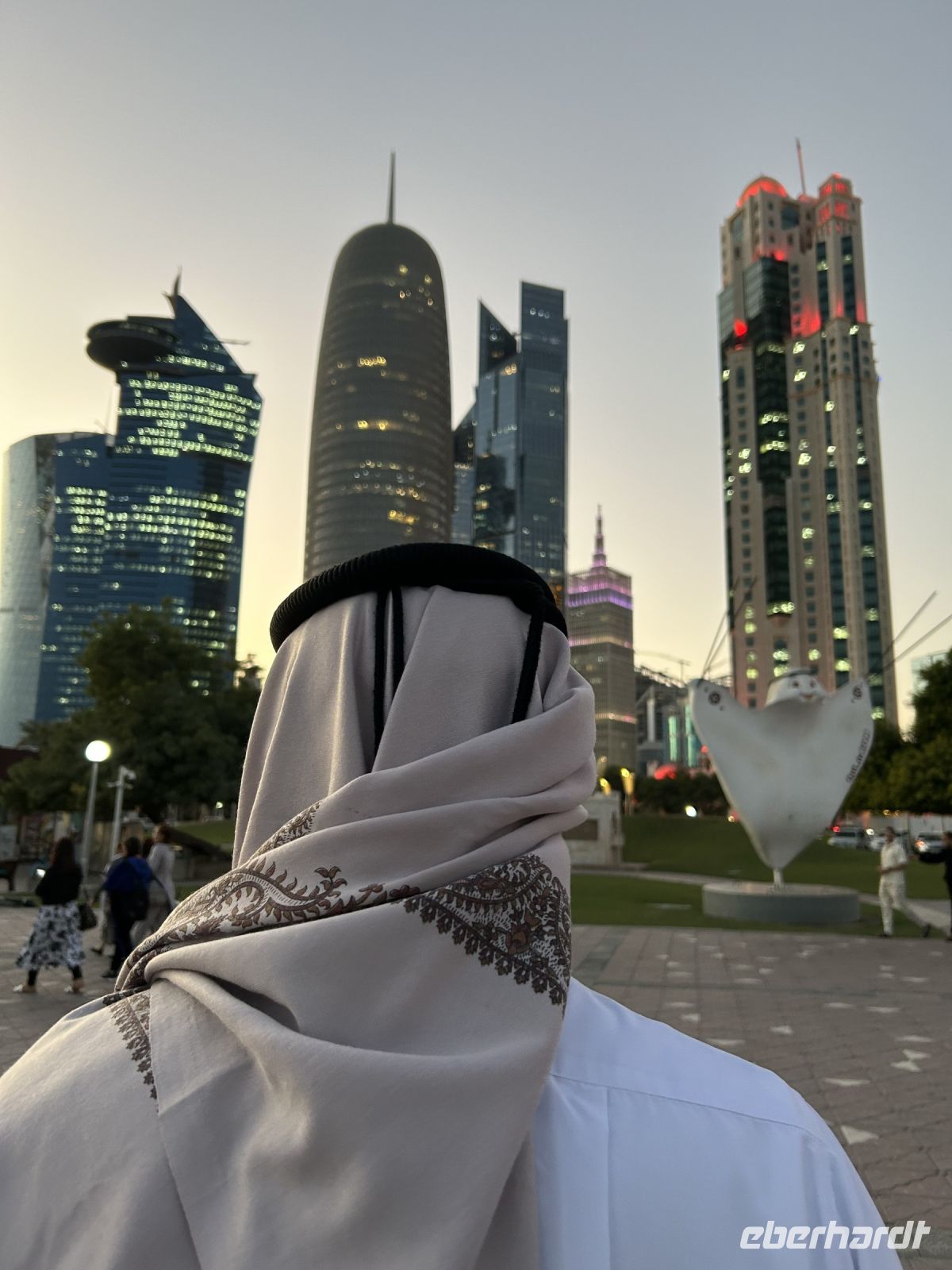 Später treffen wir uns in der Lobby und starten zu einer abendlichen Tour mit Osman, der heute ganz traditionell katarisch gekleidet mit Kandora (weißes Gewand), Kufiya (Kopftuch) und Agal (schwarzer Ring) ist.
