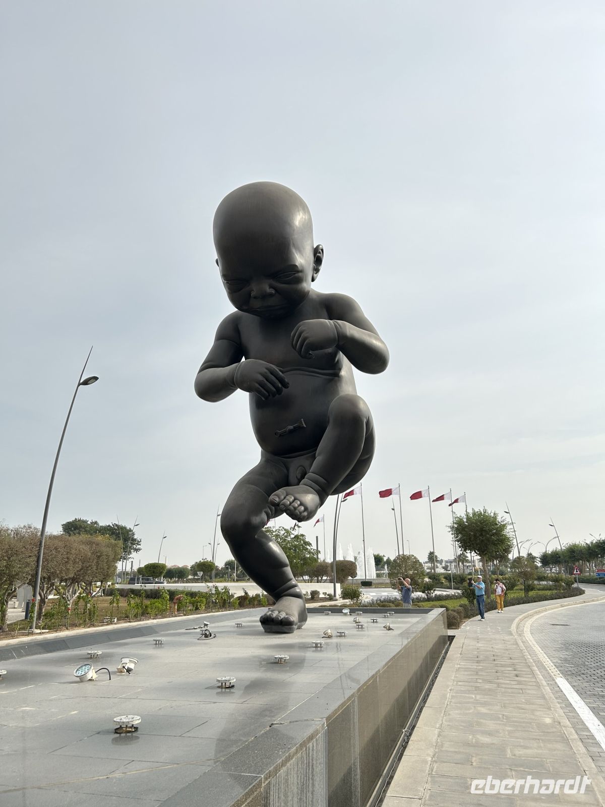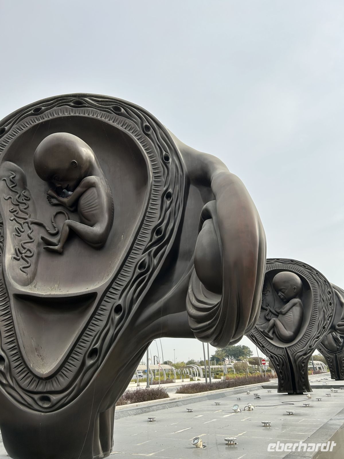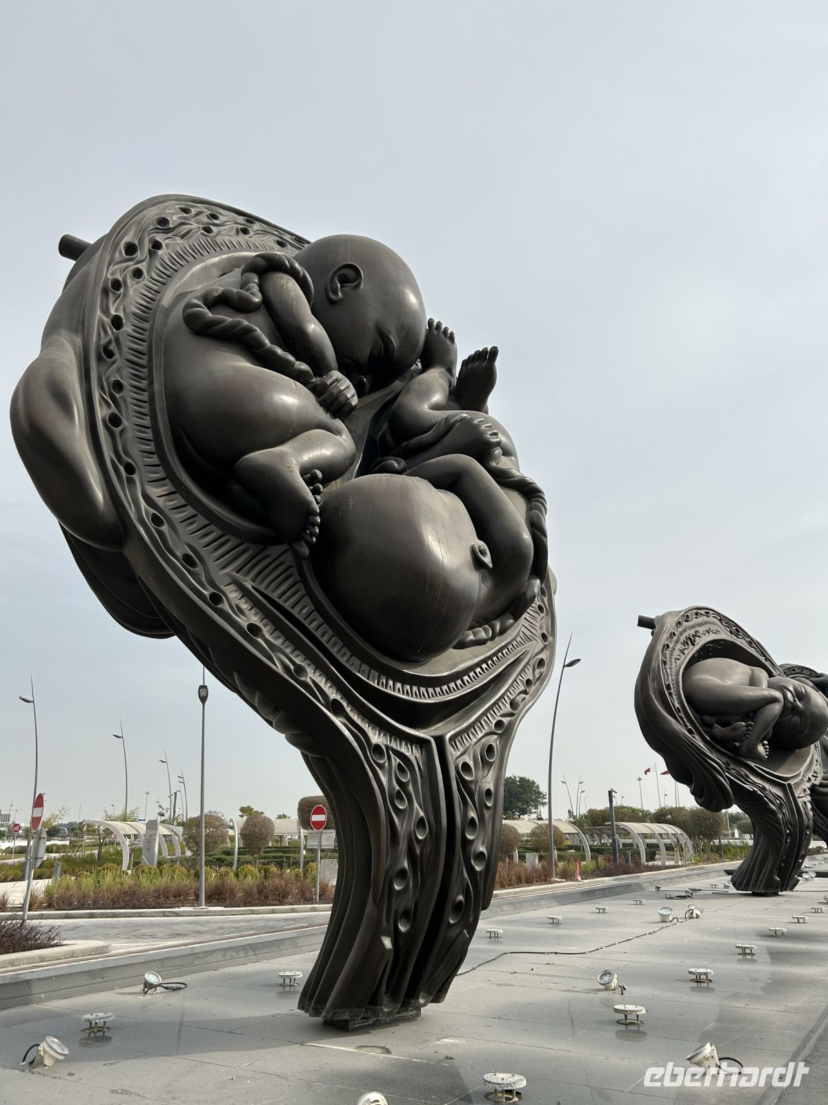 Auch am letzten Tag des Jahres haben wir ein interessantes Besichtigungsprogramm in Doha. Wir beginnen mit einem außergewöhnlichen Kunstwerk, welches man im öffentlichen Raum eines islamischen Landes kaum erwartet: „The Miraculous Journey“ ("die wundersame Reise") des britischen Künstlers Damien Hirst. 14 gigantische Bronze-Skulpturen bilden ein Gesamtkunstwerk, welches zeigen die Reise von der Befruchtung einer Eizelle bis zur Geburt eines Kindes - und dieses steht, wie passend, vor dem hochmodernen Frauen- und Kinderkrankenhaus Sidra Medicine Hospital.